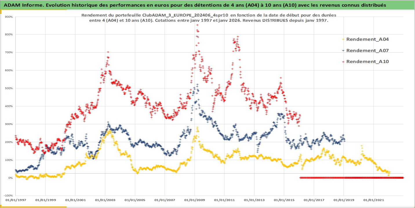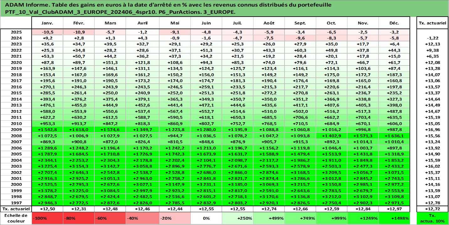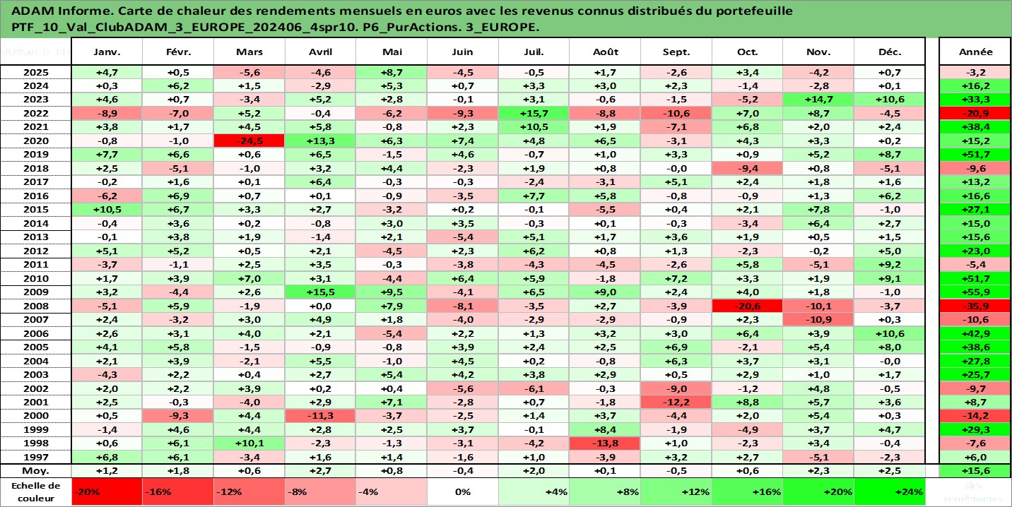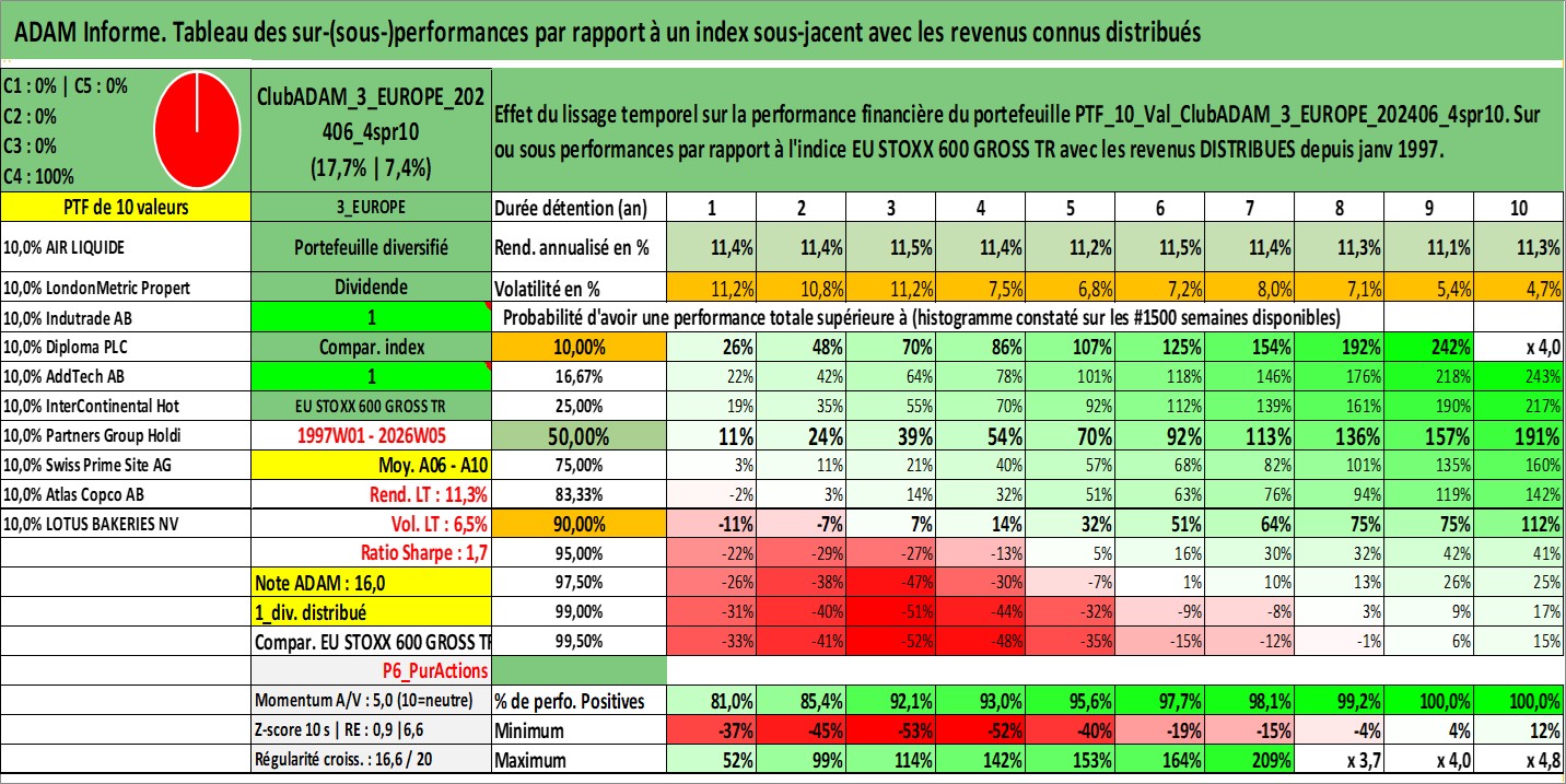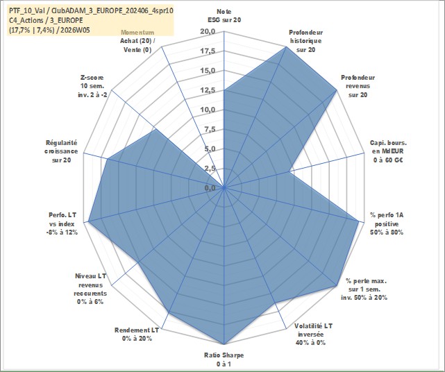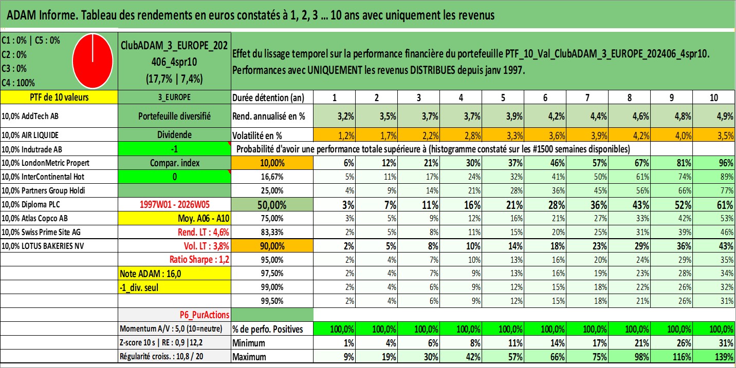 Site dédié aux investisseursPage dédiée sur site financeAnalyse des valorisations hebdomadaires du portefeuille ClubADAM_3_EUROPE_202406_4spr10_10actifs avec un profil P6_PurActions. Ce portefeuille est cote en EUR. Les valorisations couvrent les semaines 1997W01 a 2026W05. Les revenus de cet actif financier sont pris en compte depuis la semaine 1997W01. La note globale ESG de cet actif est estimee a 12.4 (apres rebasage entre 0 et 20).