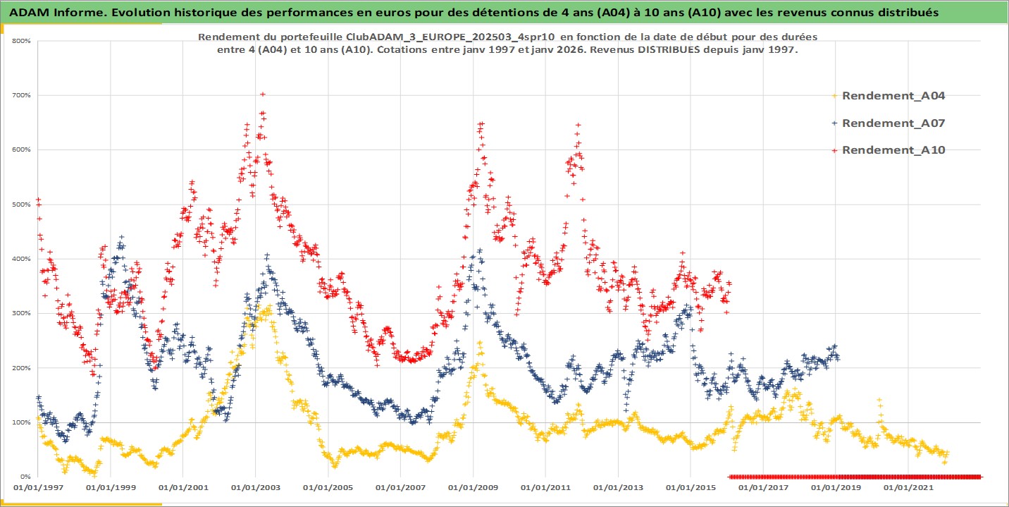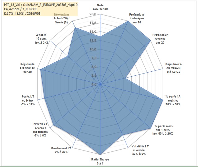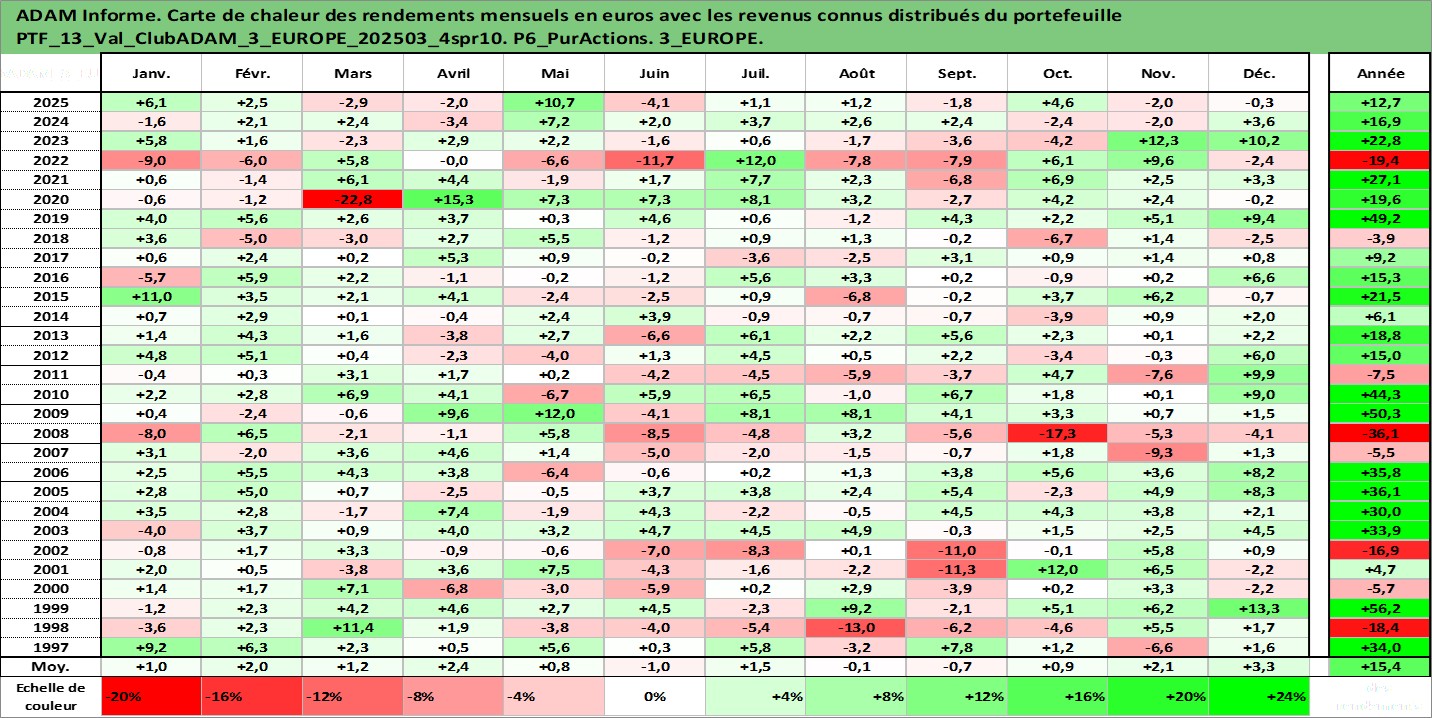 Site dédié aux investisseursPage dédiée sur site financeAnalyse des valorisations hebdomadaires du portefeuille ClubADAM_3_EUROPE_202503_4spr10_13actifs avec un profil P6_PurActions. Ce portefeuille est cote en EUR. Les valorisations couvrent les semaines 1997W01 a 2026W05. Les revenus de cet actif financier sont pris en compte depuis la semaine 1997W01. La note globale ESG de cet actif est estimee a 13.5 (apres rebasage entre 0 et 20).