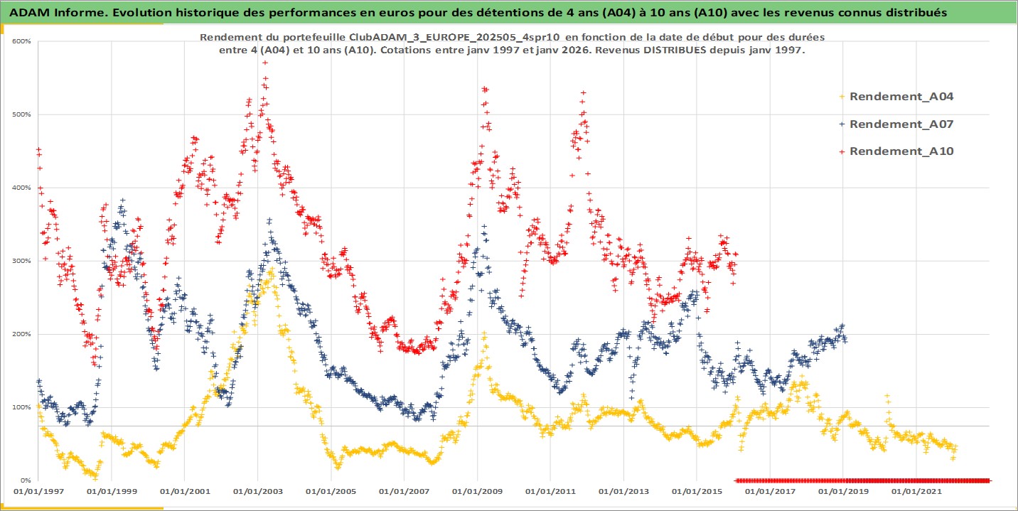 Site dédié aux investisseursPage dédiée sur site financeAnalyse des valorisations hebdomadaires du portefeuille ClubADAM_3_EUROPE_202505_4spr10_14actifs avec un profil P6_PurActions. Ce portefeuille est cote en EUR. Les valorisations couvrent les semaines 1997W01 a 2026W05. Les revenus de cet actif financier sont pris en compte depuis la semaine 1997W01. La note globale ESG de cet actif est estimee a 13.8 (apres rebasage entre 0 et 20).