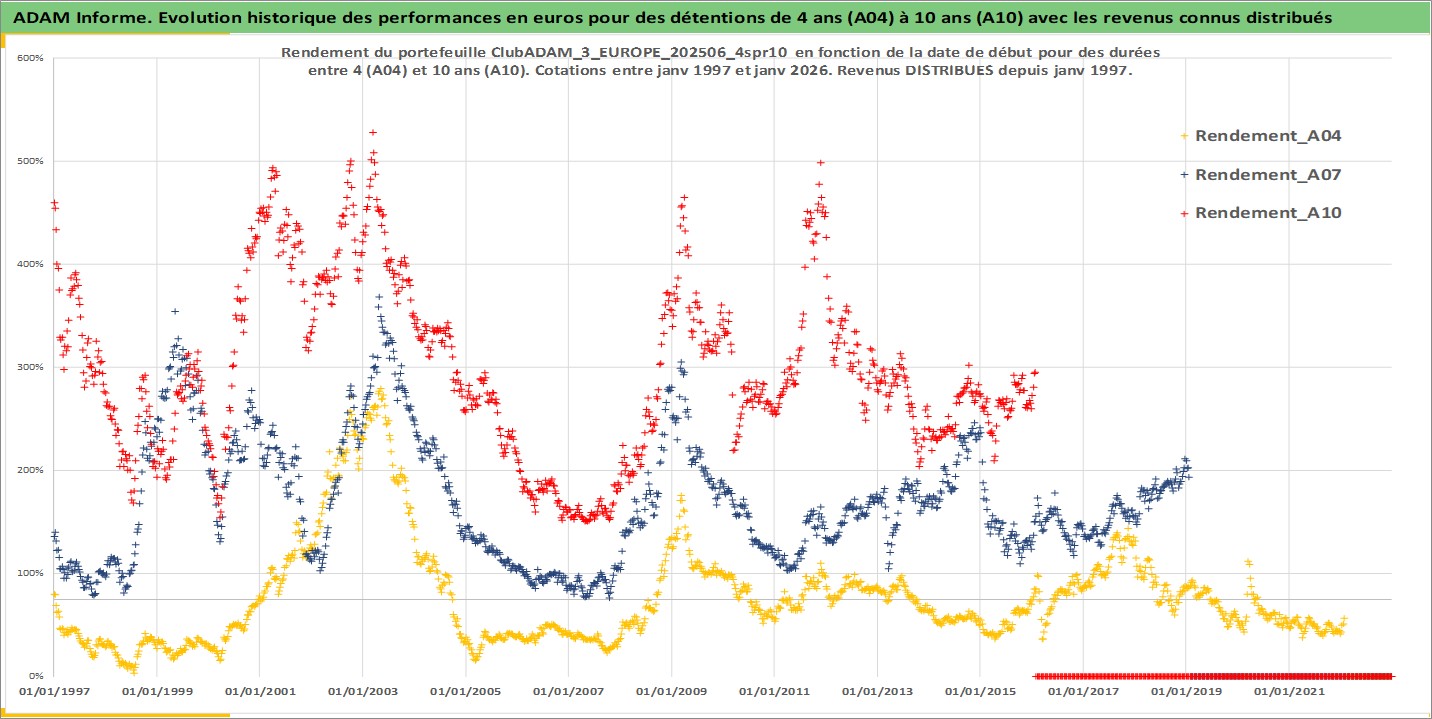 Site dédié aux investisseursPage dédiée sur site financeAnalyse des valorisations hebdomadaires du portefeuille ClubADAM_3_EUROPE_202506_4spr10_11actifs avec un profil P6_PurActions. Ce portefeuille est cote en EUR. Les valorisations couvrent les semaines 1997W01 a 2026W05. Les revenus de cet actif financier sont pris en compte depuis la semaine 1997W01. La note globale ESG de cet actif est estimee a 14.4 (apres rebasage entre 0 et 20).