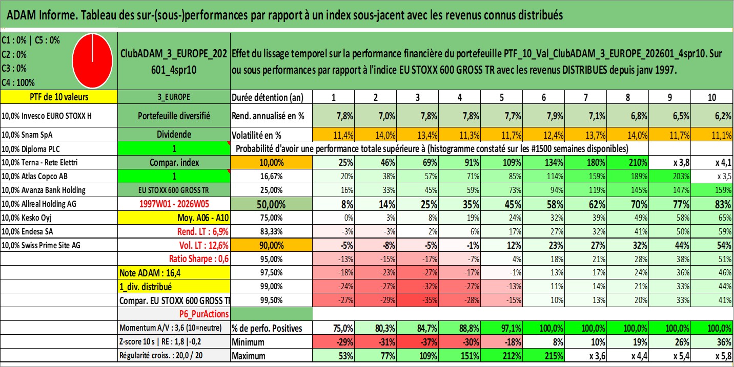 Site dédié aux investisseursPage dédiée sur site financeAnalyse des valorisations hebdomadaires du portefeuille ClubADAM_3_EUROPE_202601_4spr10_10actifs avec un profil P6_PurActions. Ce portefeuille est cote en EUR. Les valorisations couvrent les semaines 1997W01 a 2026W05. Les revenus de cet actif financier sont pris en compte depuis la semaine 1997W01. La note globale ESG de cet actif est estimee a 13.8 (apres rebasage entre 0 et 20).