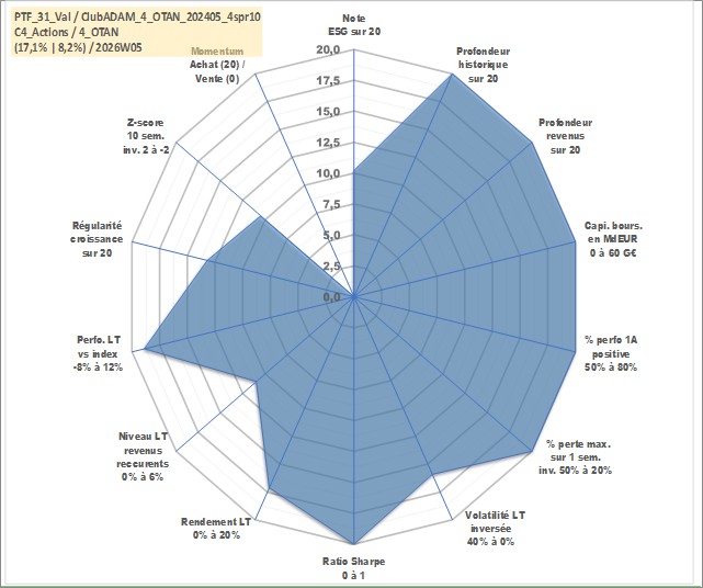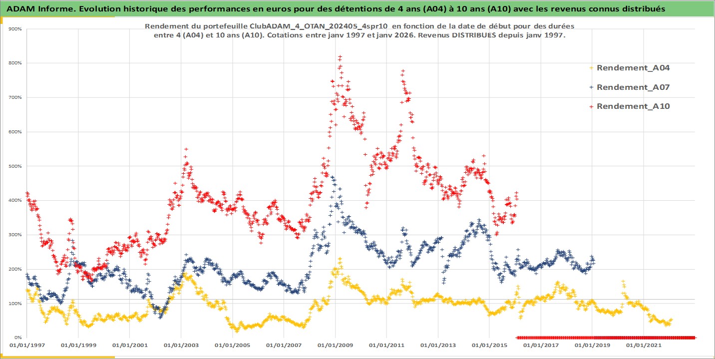 Site dédié aux investisseursPage dédiée sur site financeAnalyse des valorisations hebdomadaires du portefeuille ClubADAM_4_OTAN_202405_4spr10_31actifs avec un profil P6_PurActions. Ce portefeuille est cote en EUR. Les valorisations couvrent les semaines 1997W01 a 2026W05. Les revenus de cet actif financier sont pris en compte depuis la semaine 1997W01. La note globale ESG de cet actif est estimee a 10.2 (apres rebasage entre 0 et 20).