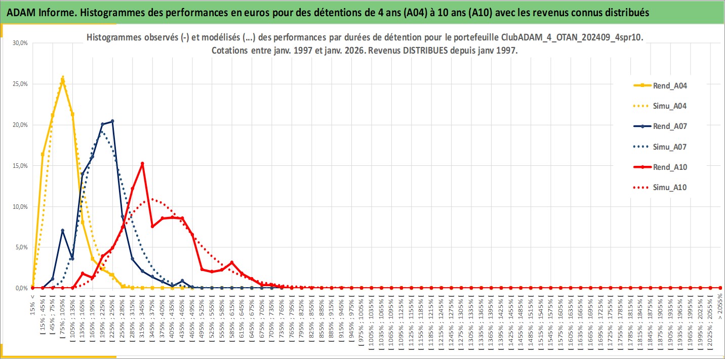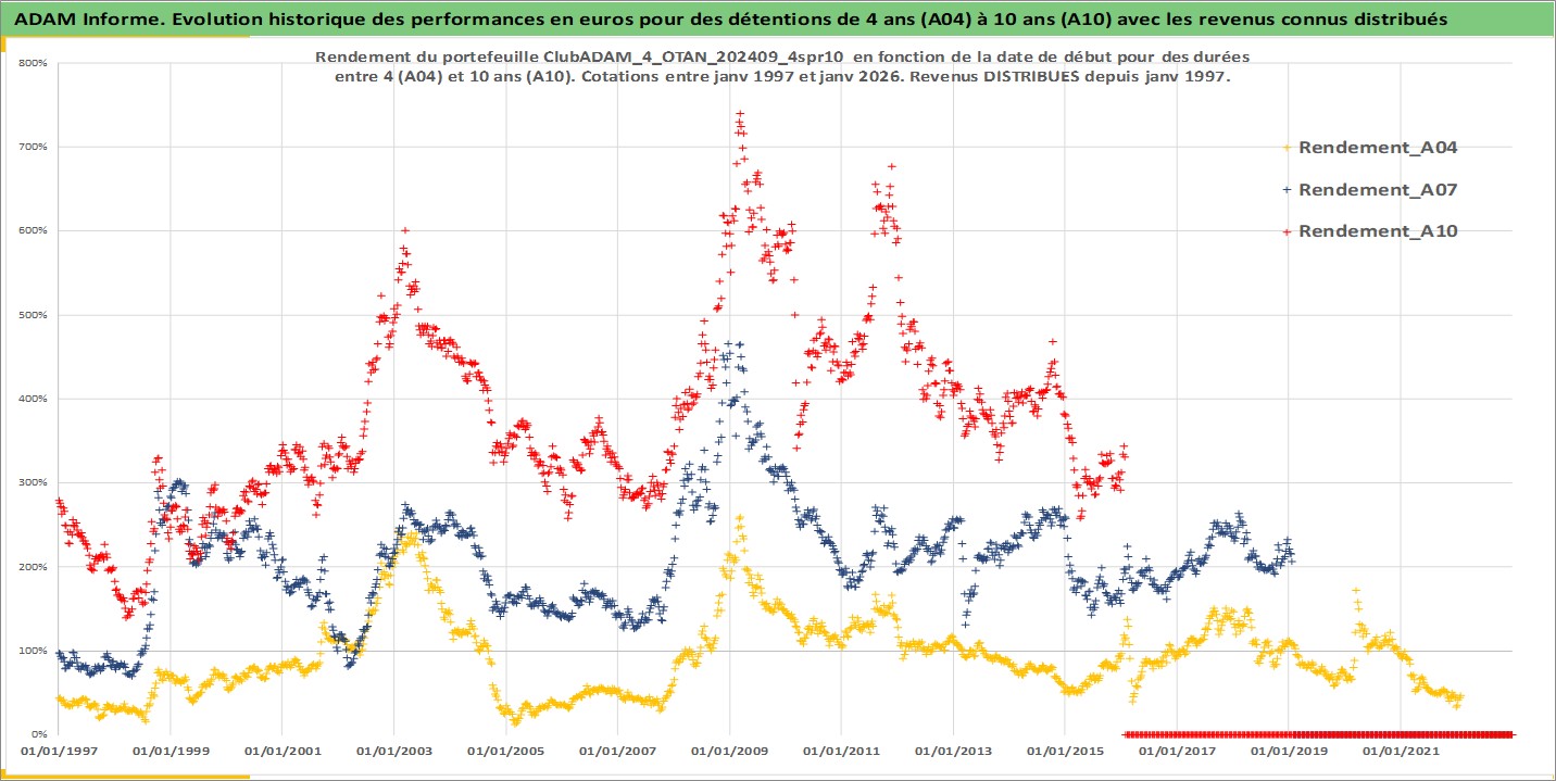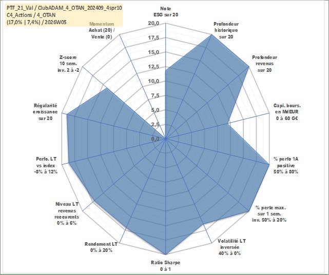 Site dédié aux investisseursPage dédiée sur site financeAnalyse des valorisations hebdomadaires du portefeuille ClubADAM_4_OTAN_202409_4spr10_21actifs avec un profil P6_PurActions. Ce portefeuille est cote en EUR. Les valorisations couvrent les semaines 1997W01 a 2026W05. Les revenus de cet actif financier sont pris en compte depuis la semaine 1997W01. La note globale ESG de cet actif est estimee a 11.8 (apres rebasage entre 0 et 20).