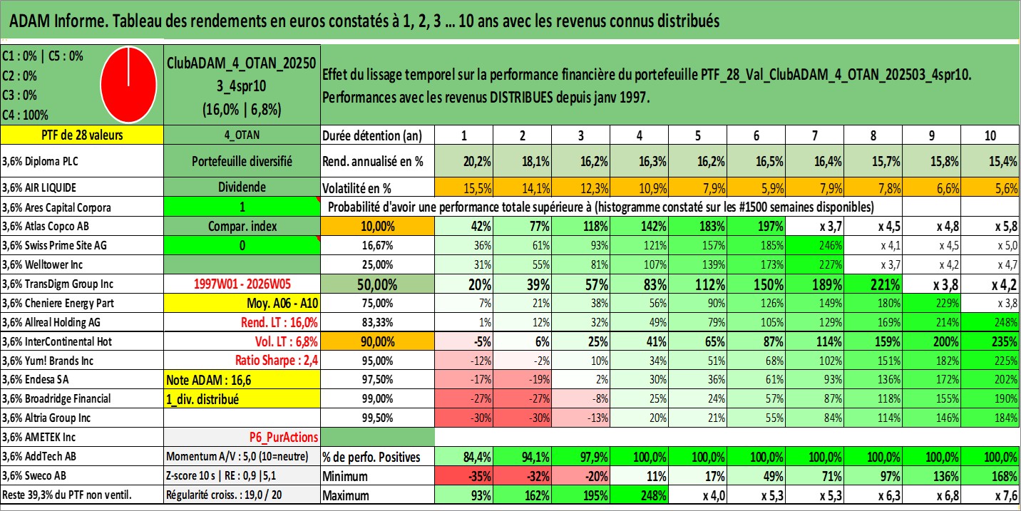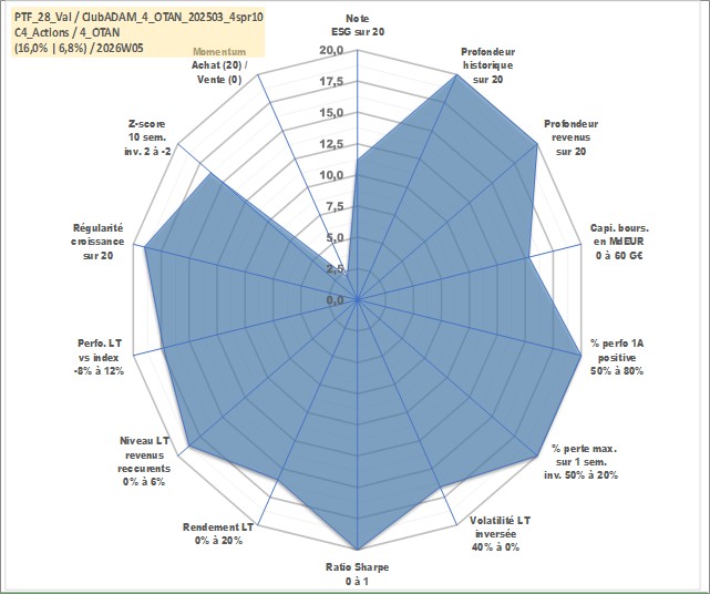 Site dédié aux investisseursPage dédiée sur site financeAnalyse des valorisations hebdomadaires du portefeuille ClubADAM_4_OTAN_202503_4spr10_28actifs avec un profil P6_PurActions. Ce portefeuille est cote en EUR. Les valorisations couvrent les semaines 1997W01 a 2026W05. Les revenus de cet actif financier sont pris en compte depuis la semaine 1997W01. La note globale ESG de cet actif est estimee a 11.2 (apres rebasage entre 0 et 20).