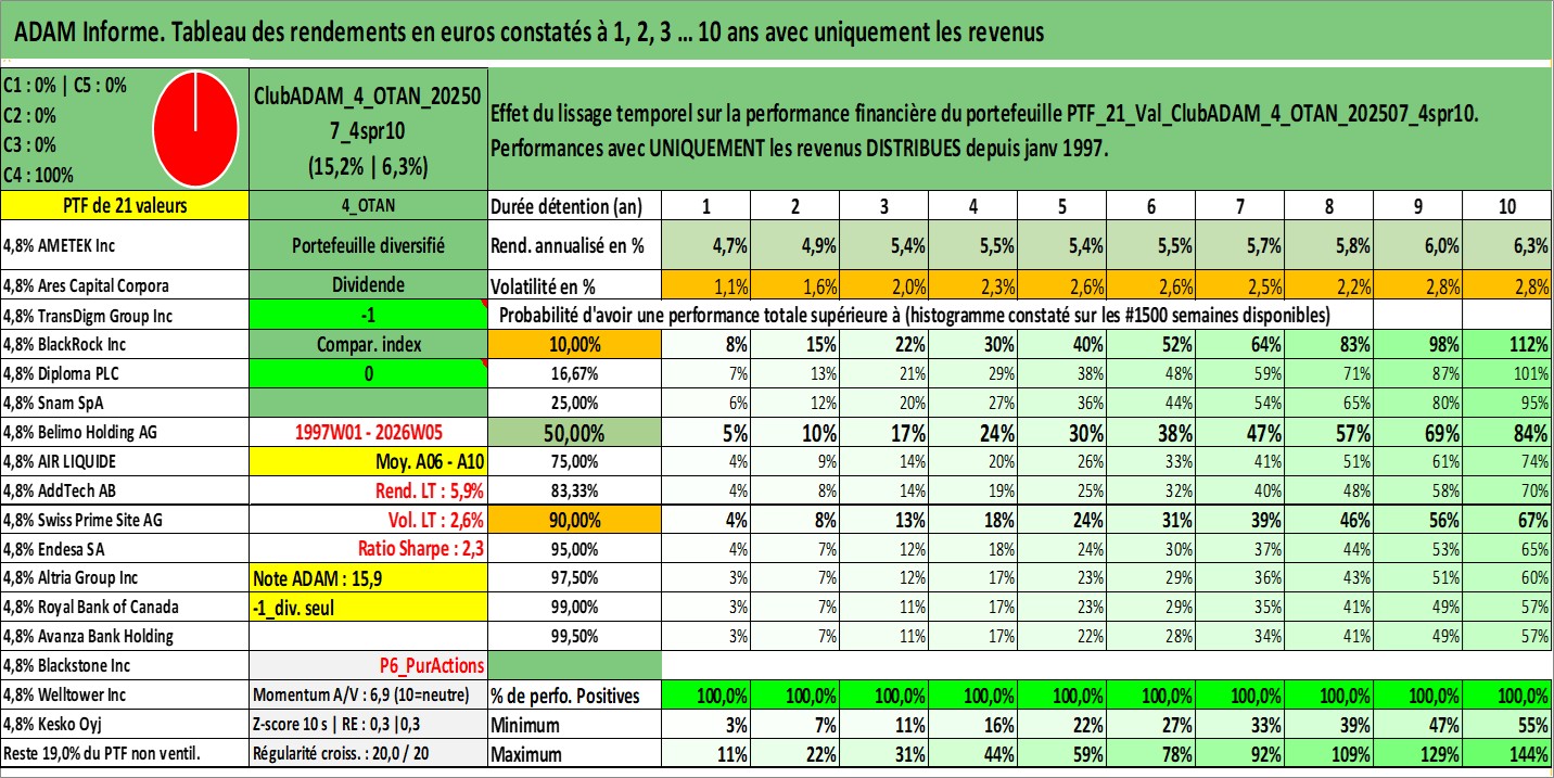 Site dédié aux investisseursPage dédiée sur site financeAnalyse des valorisations hebdomadaires du portefeuille ClubADAM_4_OTAN_202507_4spr10_21actifs avec un profil P6_PurActions. Ce portefeuille est cote en EUR. Les valorisations couvrent les semaines 1997W01 a 2026W05. Les revenus de cet actif financier sont pris en compte depuis la semaine 1997W01. La note globale ESG de cet actif est estimee a 11.3 (apres rebasage entre 0 et 20).