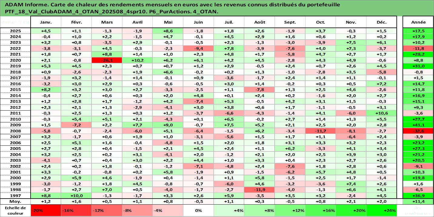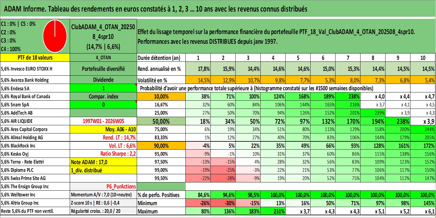 Site dédié aux investisseursPage dédiée sur site financeAnalyse des valorisations hebdomadaires du portefeuille ClubADAM_4_OTAN_202508_4spr10_18actifs avec un profil P6_PurActions. Ce portefeuille est cote en EUR. Les valorisations couvrent les semaines 1997W01 a 2026W05. Les revenus de cet actif financier sont pris en compte depuis la semaine 1997W01. La note globale ESG de cet actif est estimee a 12.9 (apres rebasage entre 0 et 20).