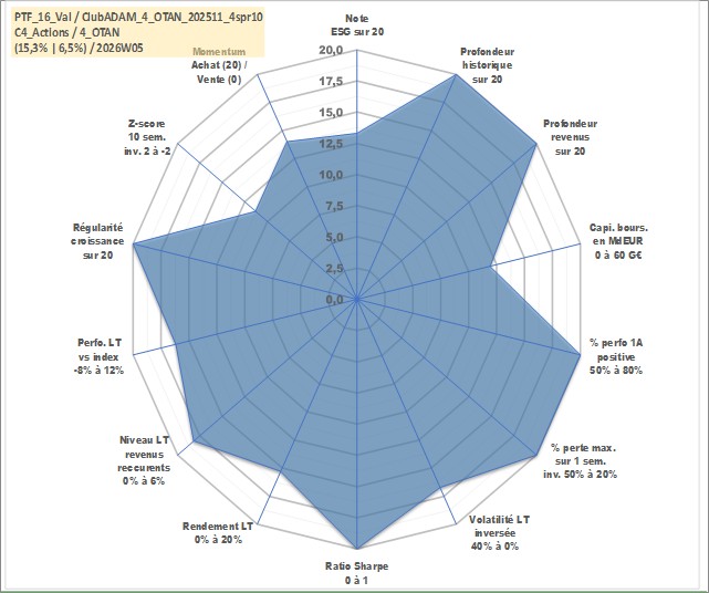 Site dédié aux investisseursPage dédiée sur site financeAnalyse des valorisations hebdomadaires du portefeuille ClubADAM_4_OTAN_202511_4spr10_16actifs avec un profil P6_PurActions. Ce portefeuille est cote en EUR. Les valorisations couvrent les semaines 1997W01 a 2026W05. Les revenus de cet actif financier sont pris en compte depuis la semaine 1997W01. La note globale ESG de cet actif est estimee a 13.3 (apres rebasage entre 0 et 20).