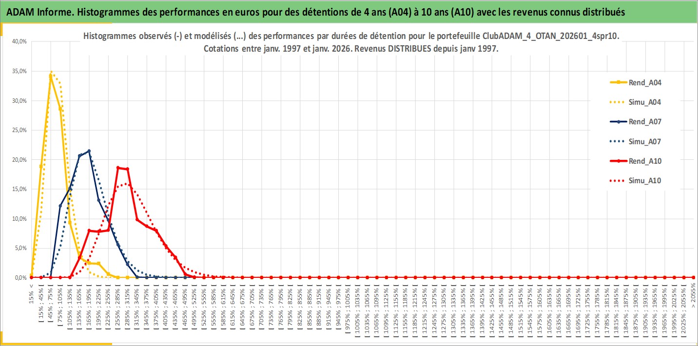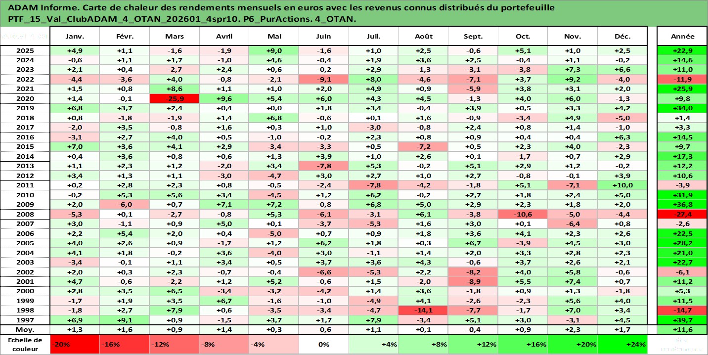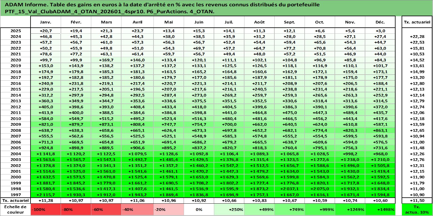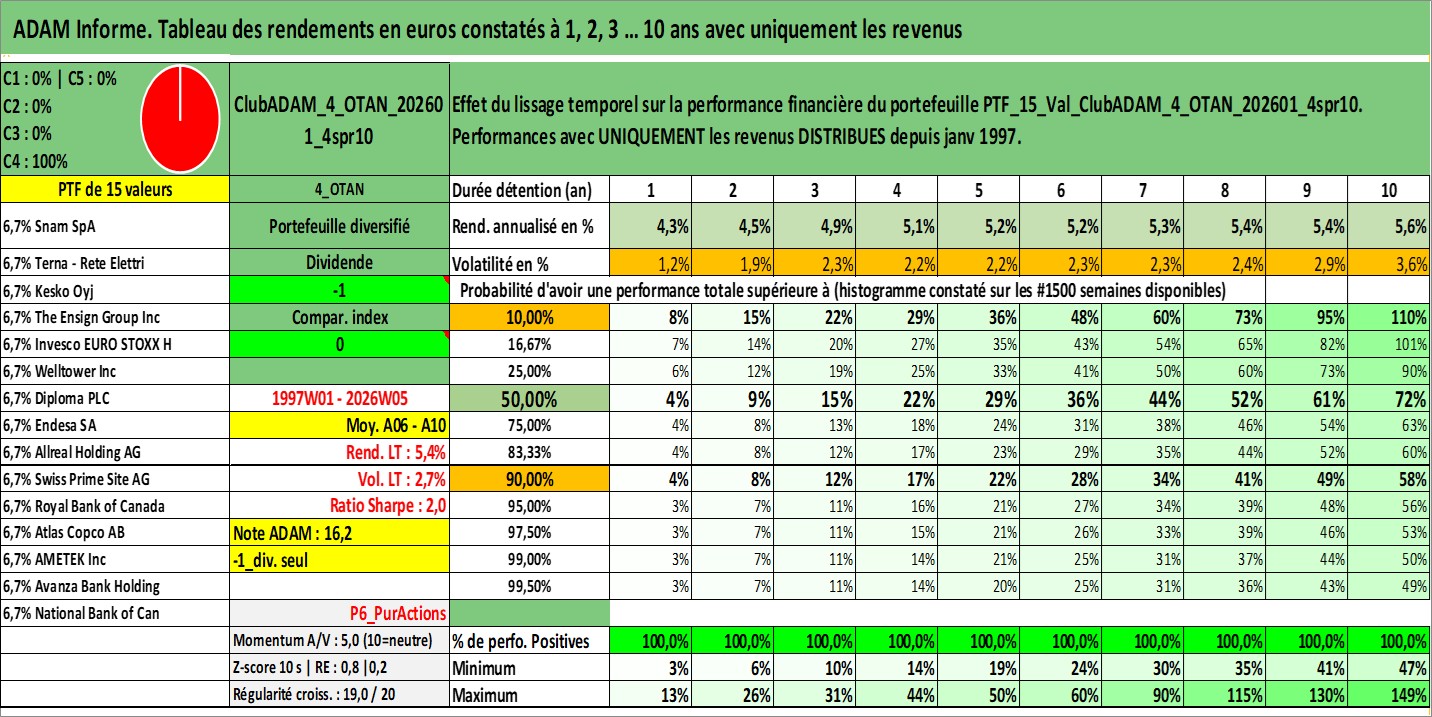 Site dédié aux investisseursPage dédiée sur site financeAnalyse des valorisations hebdomadaires du portefeuille ClubADAM_4_OTAN_202601_4spr10_15actifs avec un profil P6_PurActions. Ce portefeuille est cote en EUR. Les valorisations couvrent les semaines 1997W01 a 2026W05. Les revenus de cet actif financier sont pris en compte depuis la semaine 1997W01. La note globale ESG de cet actif est estimee a 12.9 (apres rebasage entre 0 et 20).