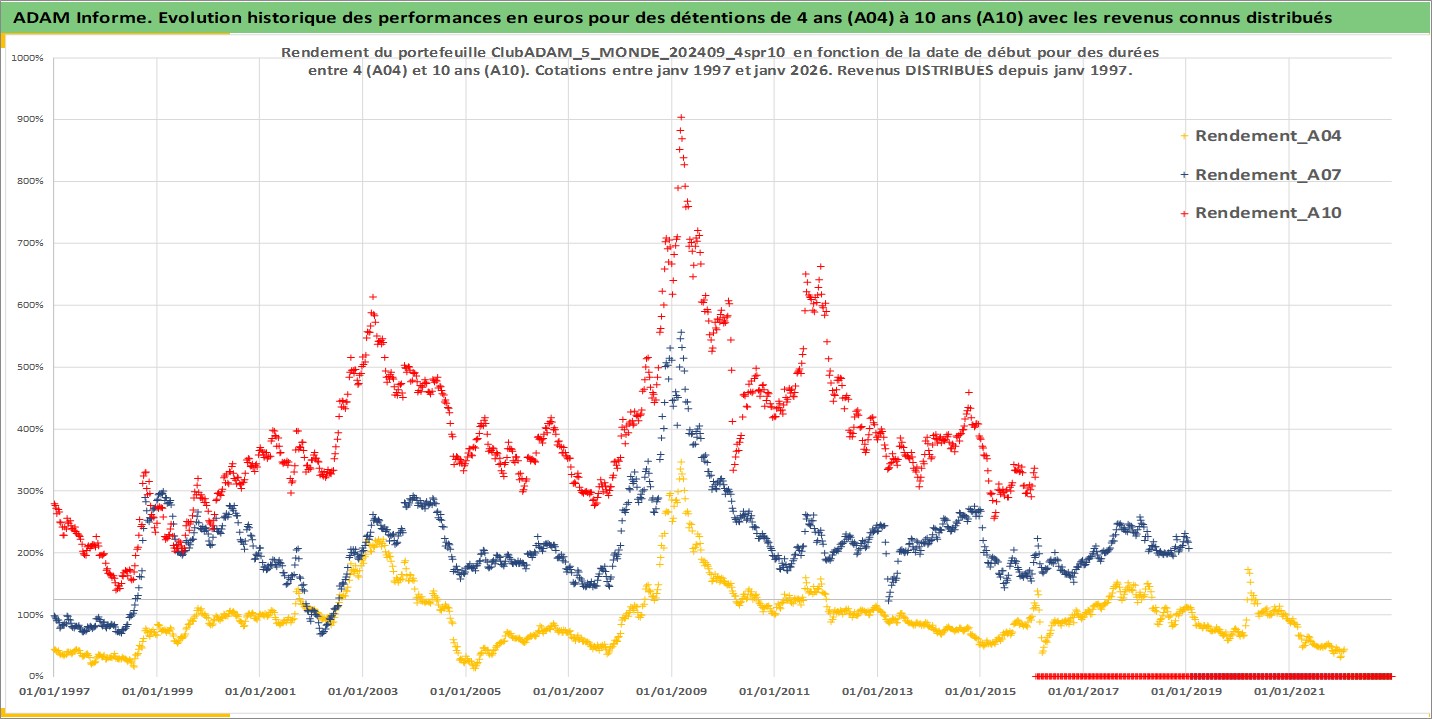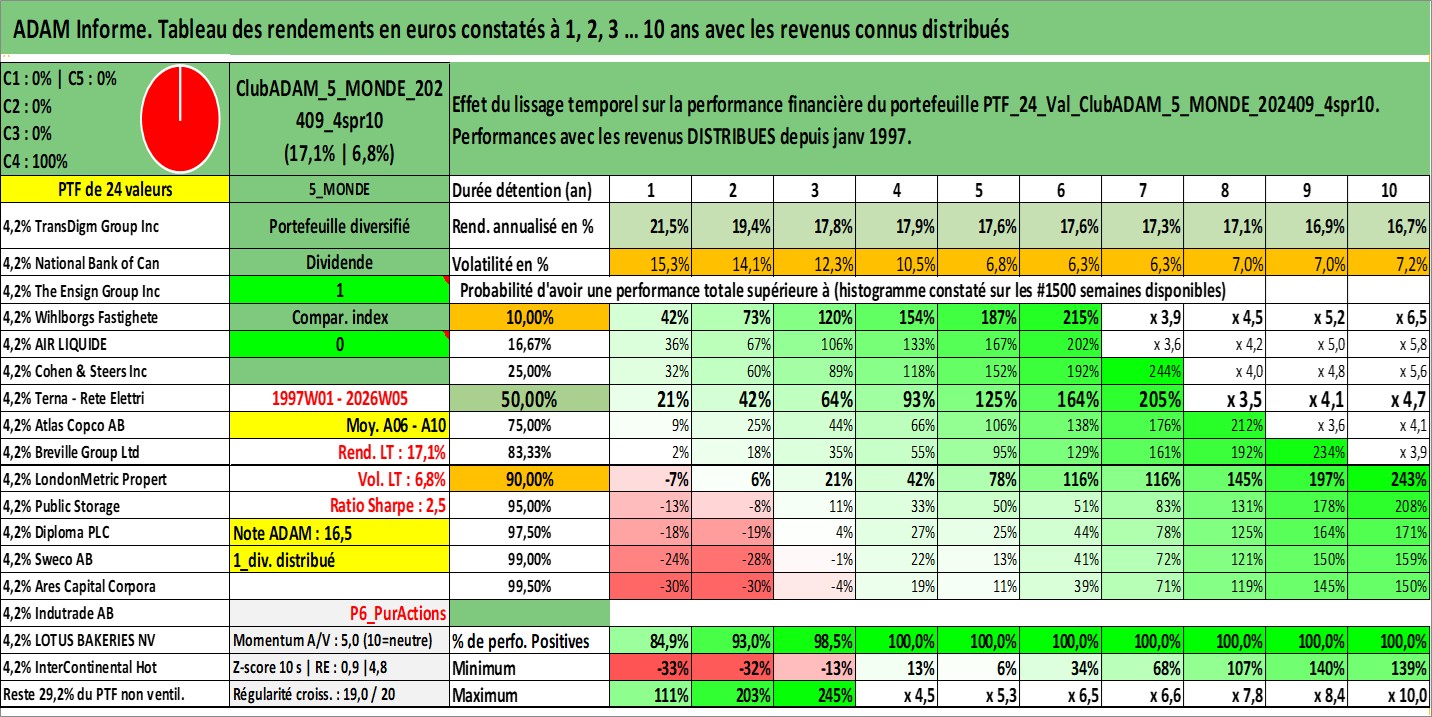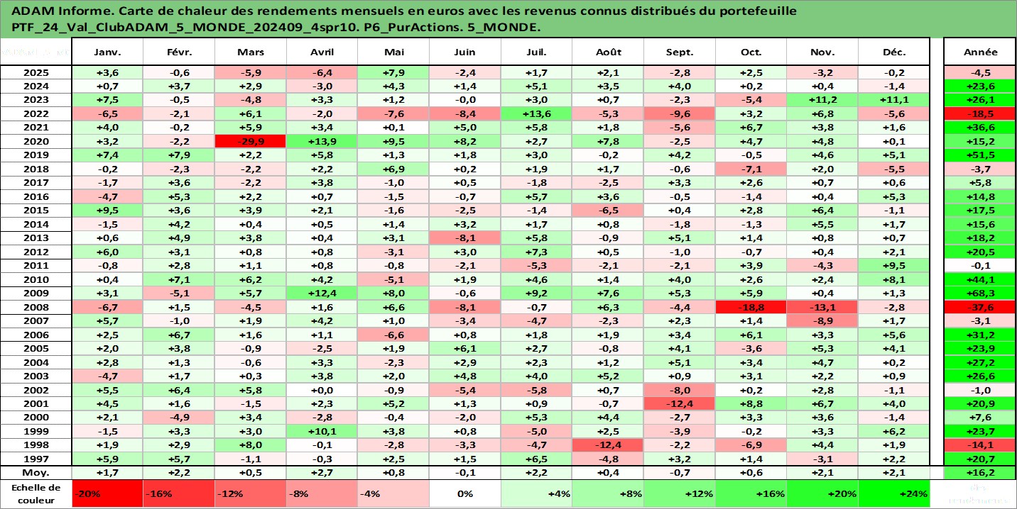 Site dédié aux investisseursPage dédiée sur site financeAnalyse des valorisations hebdomadaires du portefeuille ClubADAM_5_MONDE_202409_4spr10_24actifs avec un profil P6_PurActions. Ce portefeuille est cote en EUR. Les valorisations couvrent les semaines 1997W01 a 2026W05. Les revenus de cet actif financier sont pris en compte depuis la semaine 1997W01. La note globale ESG de cet actif est estimee a 11.8 (apres rebasage entre 0 et 20).
