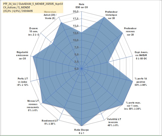 Site dédié aux investisseursPage dédiée sur site financeAnalyse des valorisations hebdomadaires du portefeuille ClubADAM_5_MONDE_202505_4spr10_26actifs avec un profil P6_PurActions. Ce portefeuille est cote en EUR. Les valorisations couvrent les semaines 1997W01 a 2026W05. Les revenus de cet actif financier sont pris en compte depuis la semaine 1997W01. La note globale ESG de cet actif est estimee a 12.6 (apres rebasage entre 0 et 20).