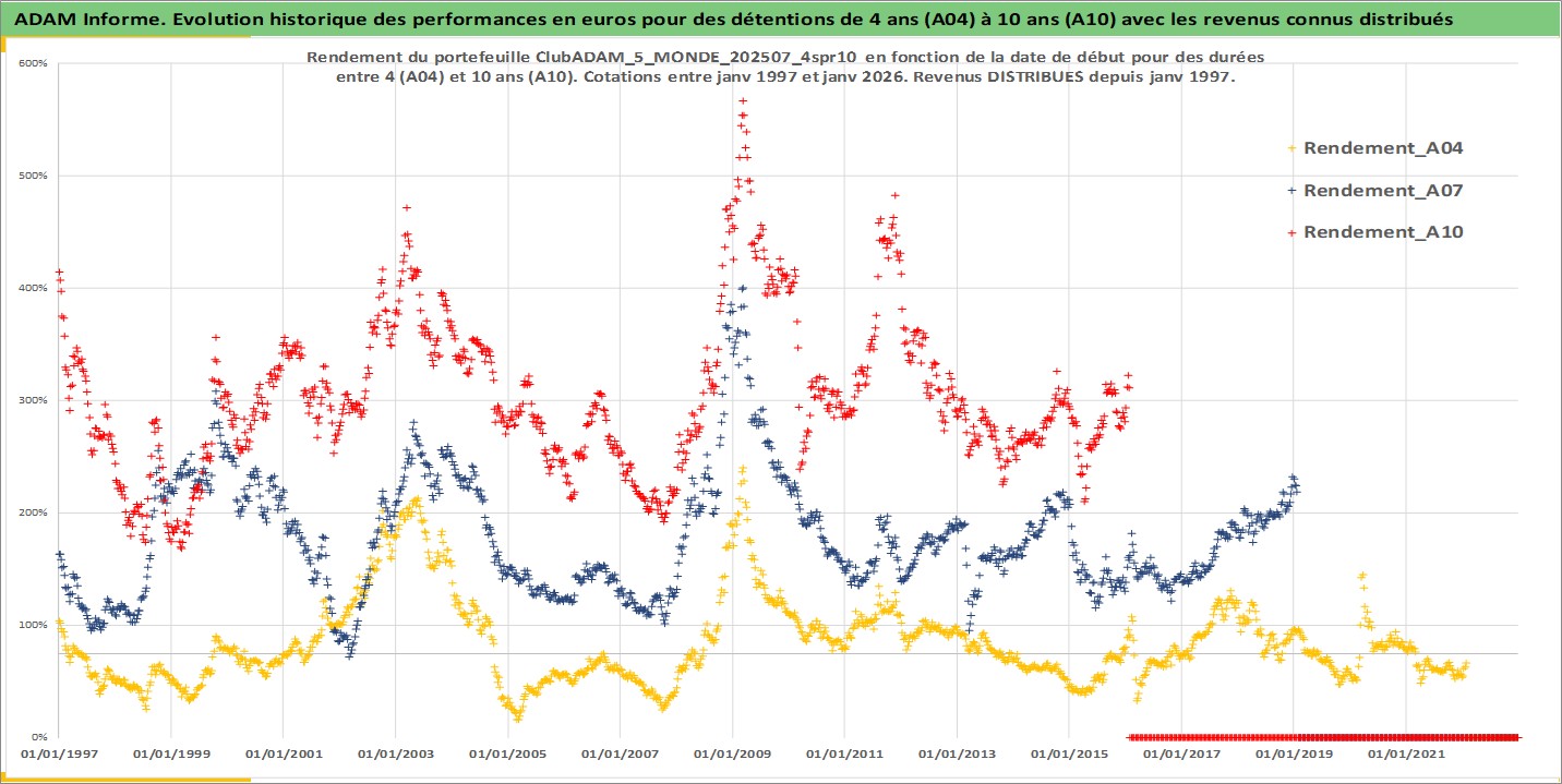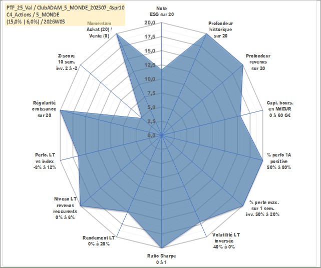 Site dédié aux investisseursPage dédiée sur site financeAnalyse des valorisations hebdomadaires du portefeuille ClubADAM_5_MONDE_202507_4spr10_25actifs avec un profil P6_PurActions. Ce portefeuille est cote en EUR. Les valorisations couvrent les semaines 1997W01 a 2026W05. Les revenus de cet actif financier sont pris en compte depuis la semaine 1997W01. La note globale ESG de cet actif est estimee a 11.6 (apres rebasage entre 0 et 20).