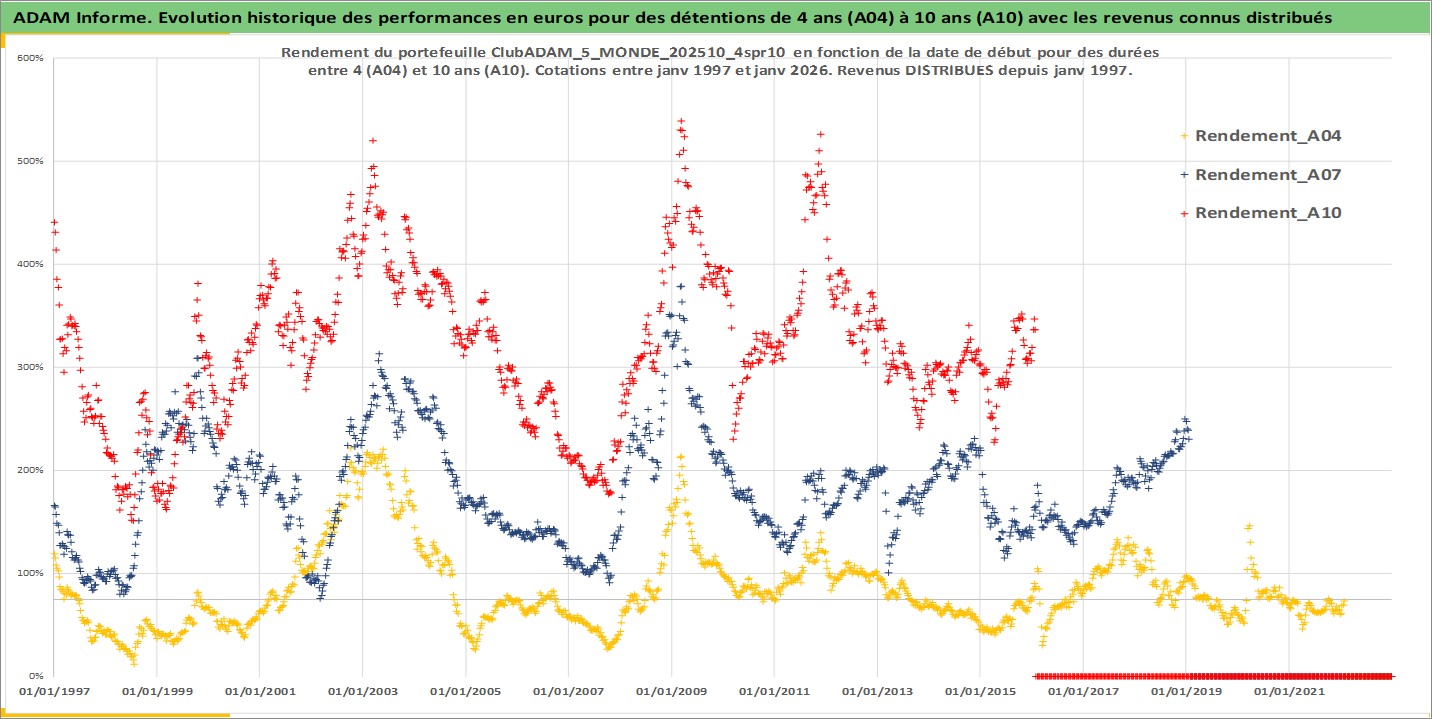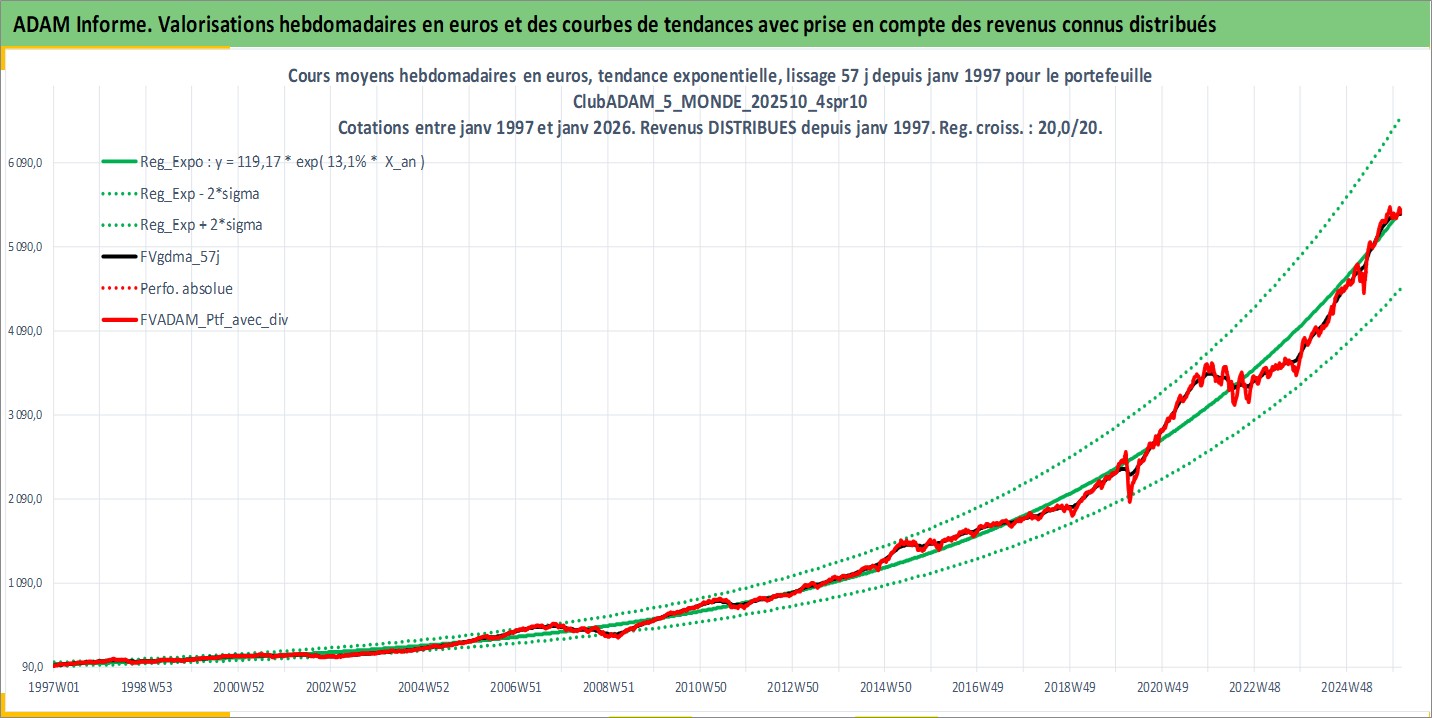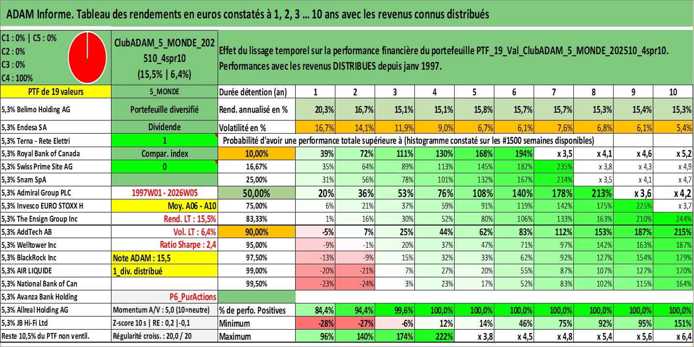 Site dédié aux investisseursPage dédiée sur site financeAnalyse des valorisations hebdomadaires du portefeuille ClubADAM_5_MONDE_202510_4spr10_19actifs avec un profil P6_PurActions. Ce portefeuille est cote en EUR. Les valorisations couvrent les semaines 1997W01 a 2026W05. Les revenus de cet actif financier sont pris en compte depuis la semaine 1997W01. La note globale ESG de cet actif est estimee a 13.0 (apres rebasage entre 0 et 20).
