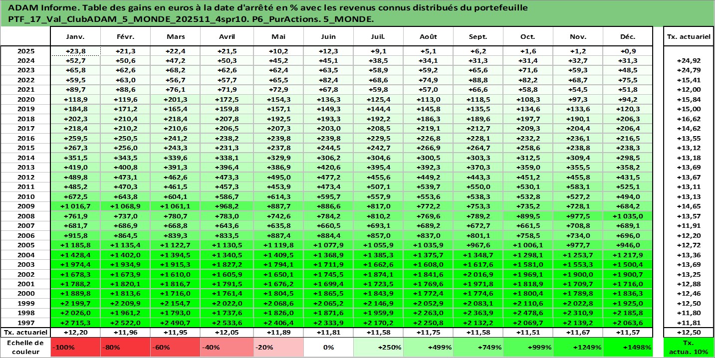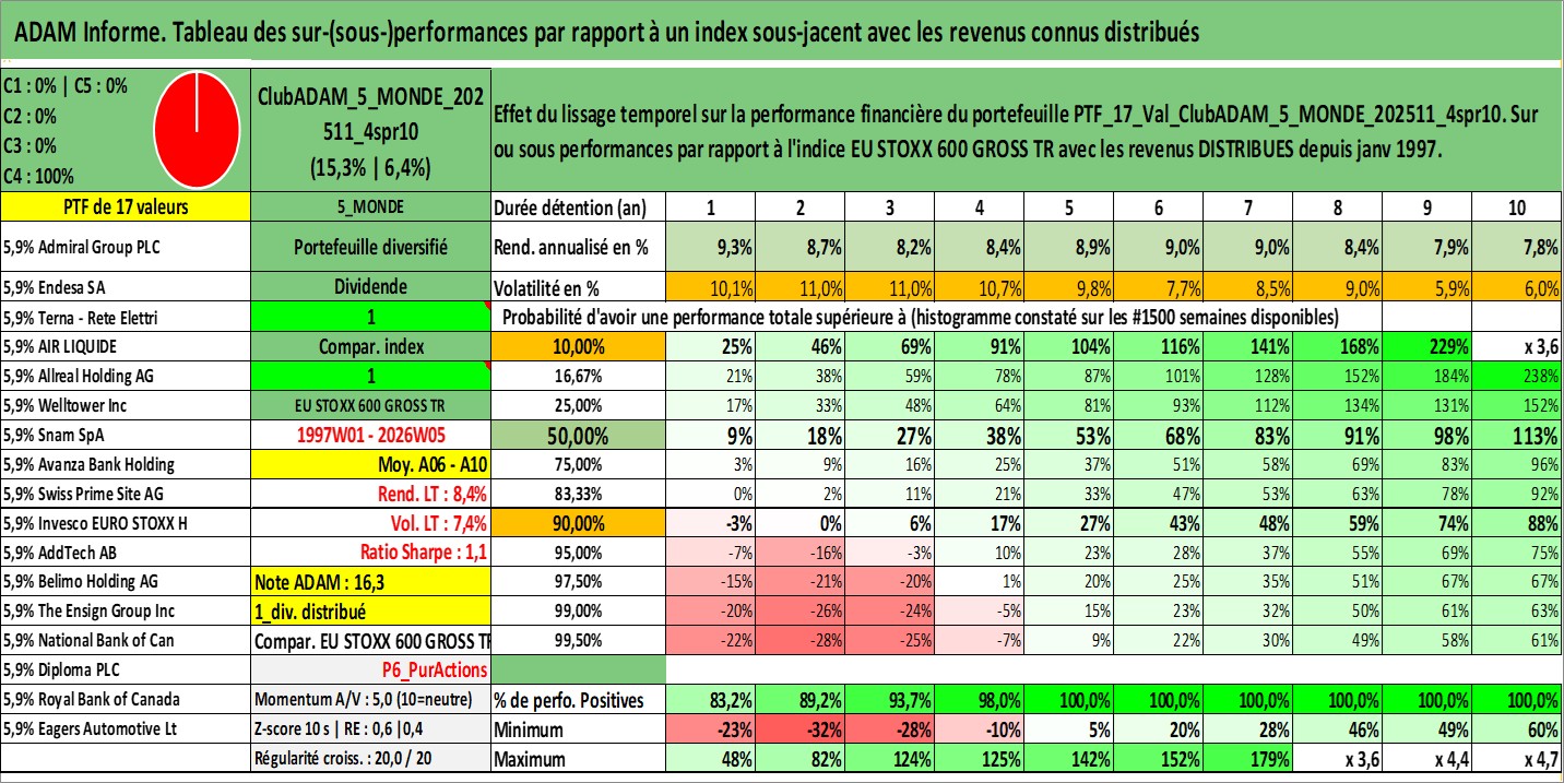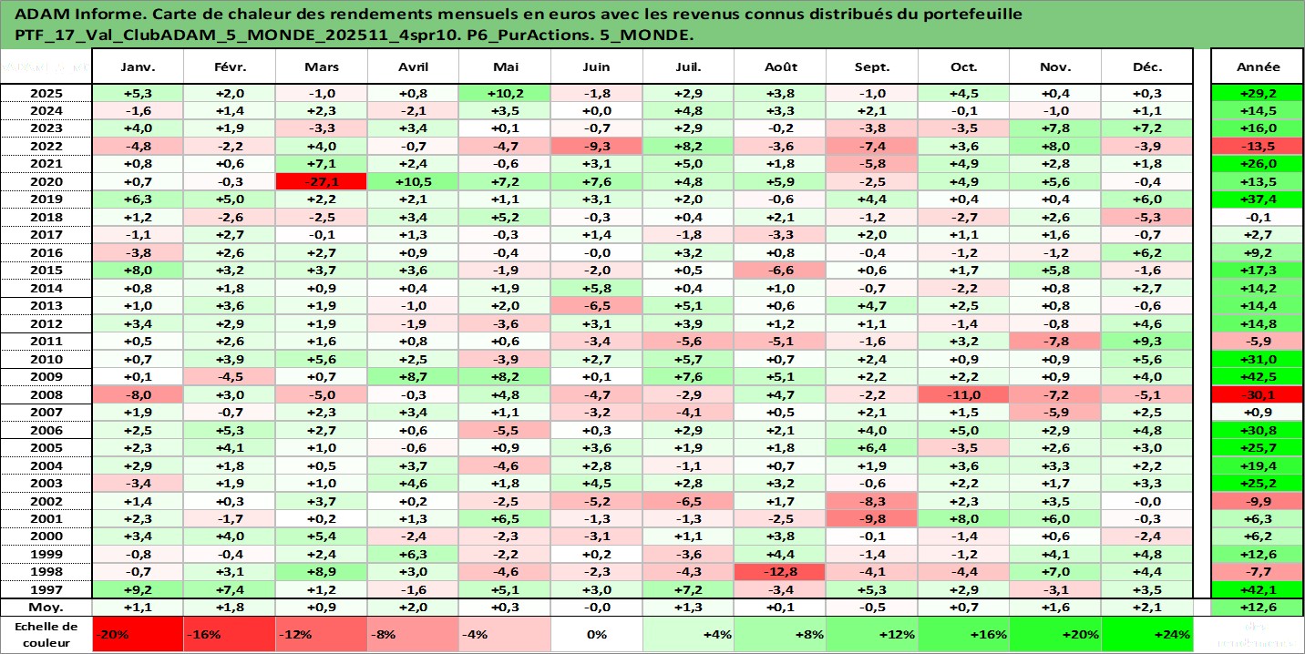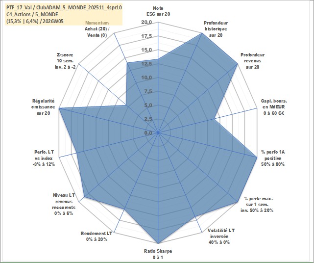 Site dédié aux investisseursPage dédiée sur site financeAnalyse des valorisations hebdomadaires du portefeuille ClubADAM_5_MONDE_202511_4spr10_17actifs avec un profil P6_PurActions. Ce portefeuille est cote en EUR. Les valorisations couvrent les semaines 1997W01 a 2026W05. Les revenus de cet actif financier sont pris en compte depuis la semaine 1997W01. La note globale ESG de cet actif est estimee a 13.3 (apres rebasage entre 0 et 20).