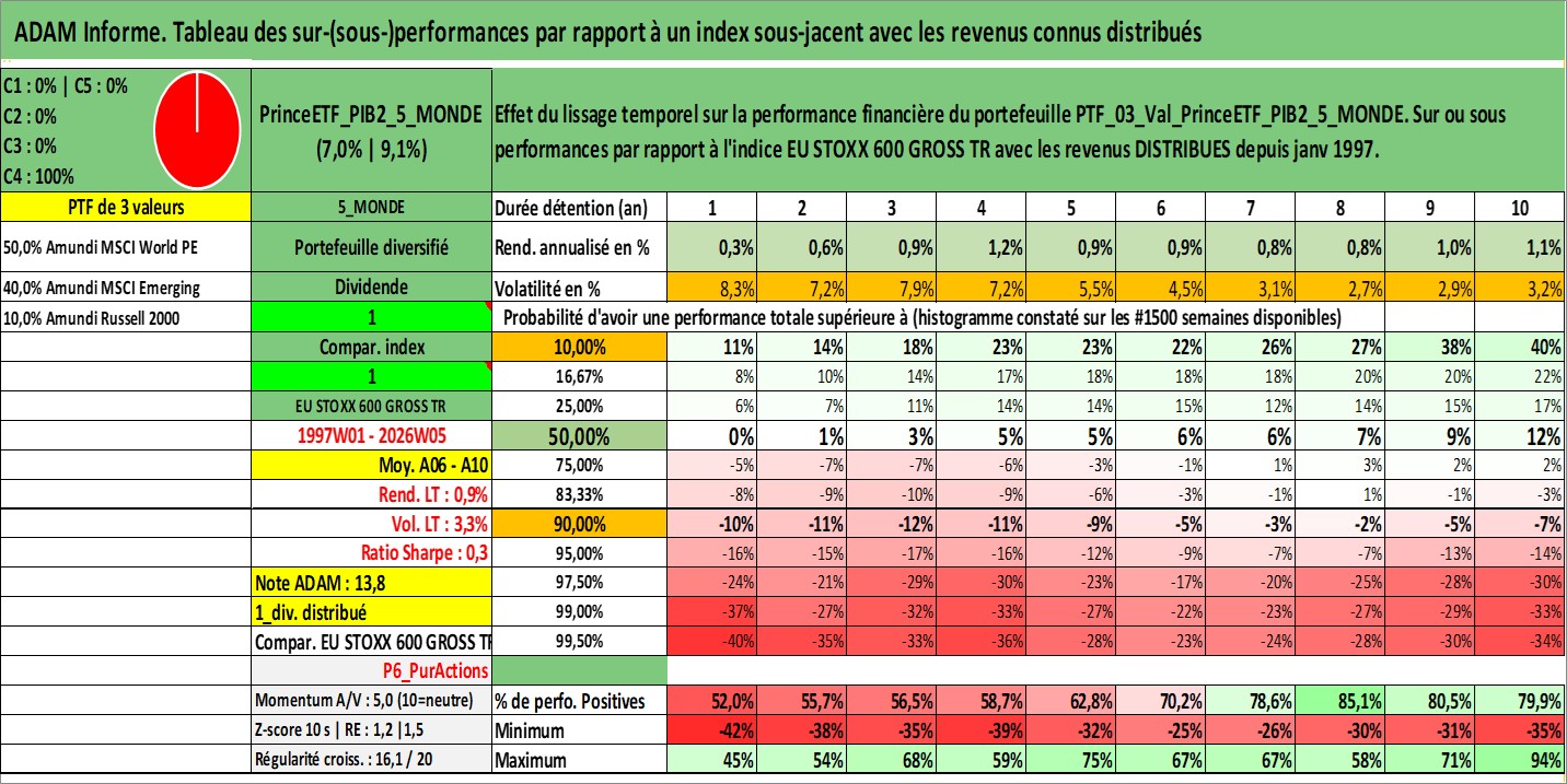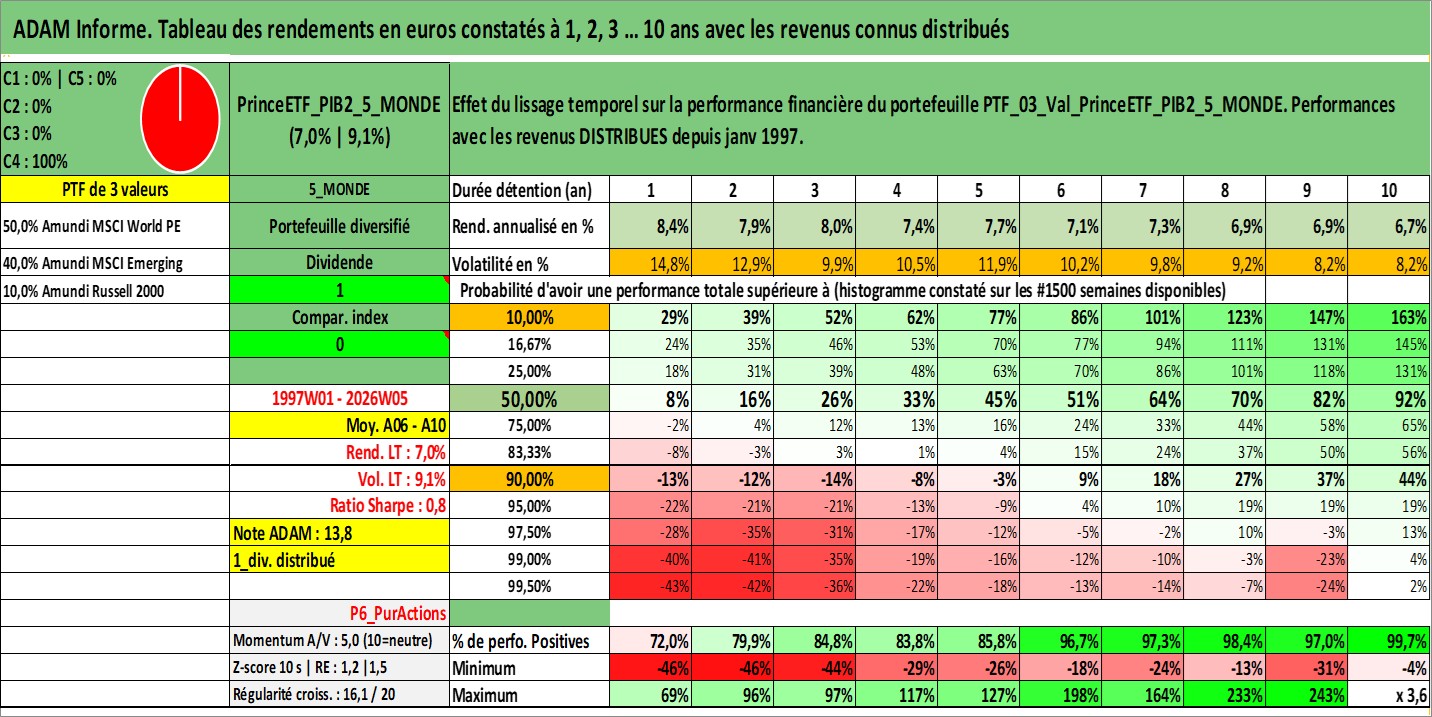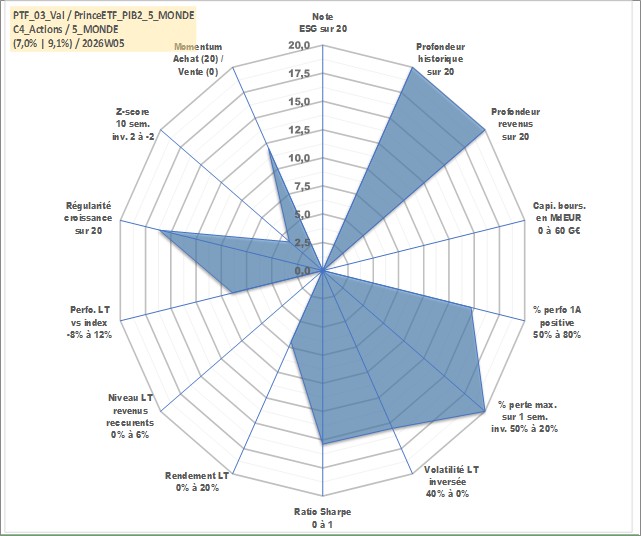 Site dédié aux investisseursPage dédiée sur site financeAnalyse des valorisations hebdomadaires du portefeuille PrinceETF_PIB2_5_MONDE_3actifs avec un profil P6_PurActions. Ce portefeuille est cote en EUR. Les valorisations couvrent les semaines 1997W01 a 2026W05. Les revenus de cet actif financier sont pris en compte depuis la semaine 1997W01. La note ESG de cet actif n'est pas connue.