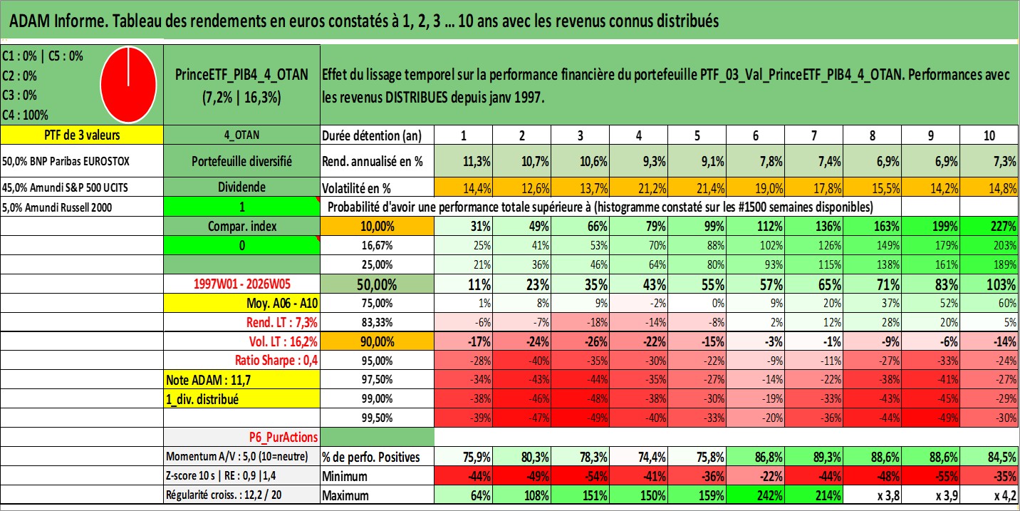 Site dédié aux investisseursPage dédiée sur site financeAnalyse des valorisations hebdomadaires du portefeuille PrinceETF_PIB4_4_OTAN_3actifs avec un profil P6_PurActions. Ce portefeuille est cote en EUR. Les valorisations couvrent les semaines 1997W01 a 2026W05. Les revenus de cet actif financier sont pris en compte depuis la semaine 1997W01. La note ESG de cet actif n'est pas connue.