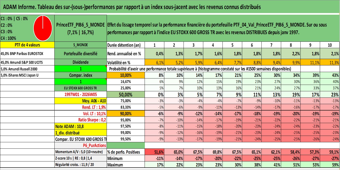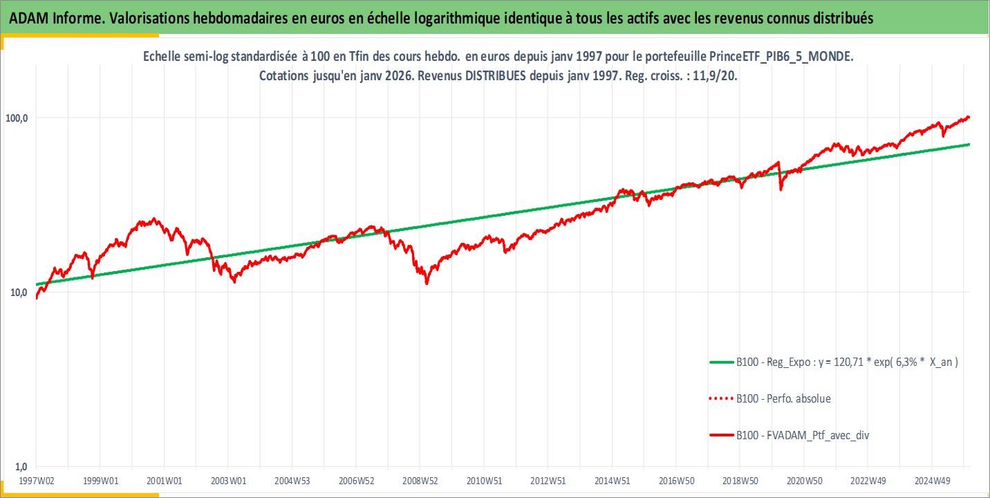 Site dédié aux investisseursPage dédiée sur site financeAnalyse des valorisations hebdomadaires du portefeuille PrinceETF_PIB6_5_MONDE_4actifs avec un profil P6_PurActions. Ce portefeuille est cote en EUR. Les valorisations couvrent les semaines 1997W01 a 2026W05. Les revenus de cet actif financier sont pris en compte depuis la semaine 1997W01. La note ESG de cet actif n'est pas connue.