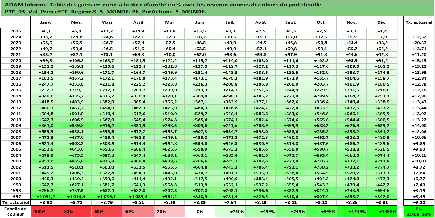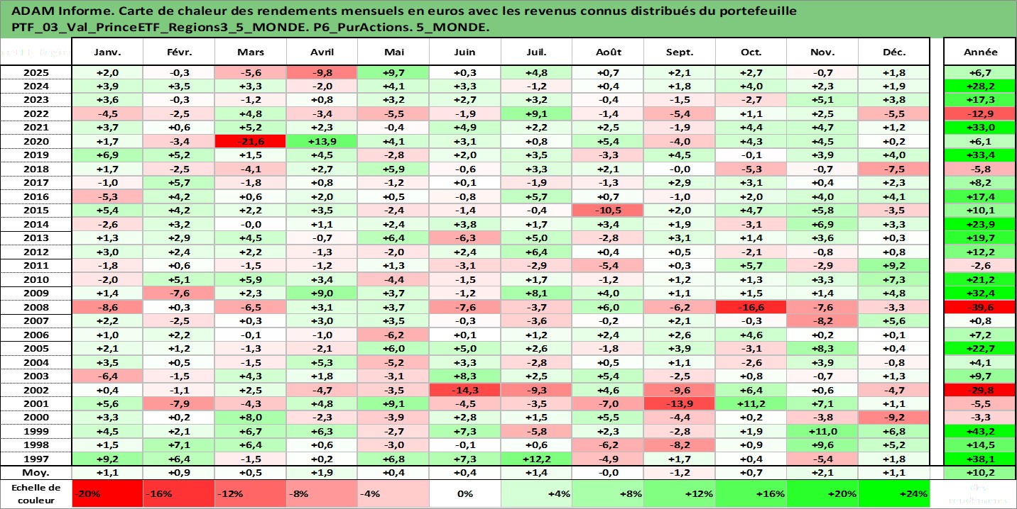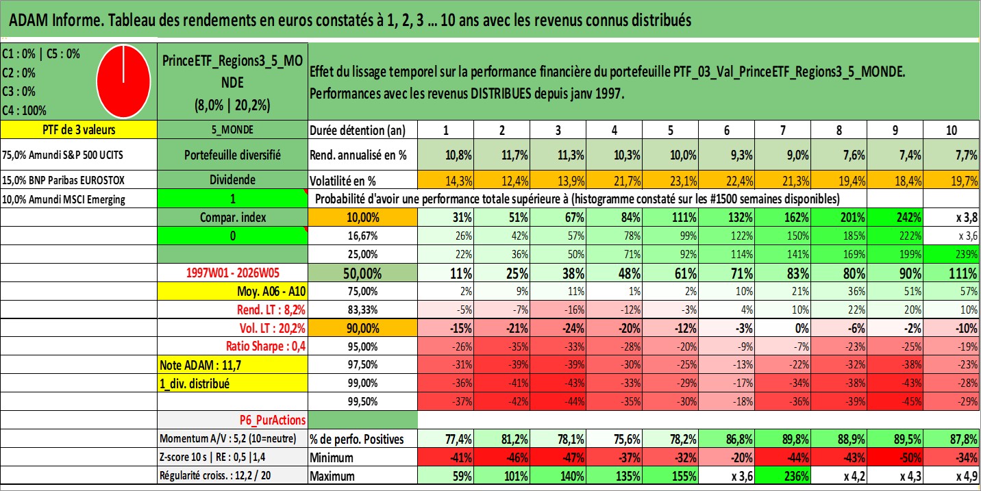 Site dédié aux investisseursPage dédiée sur site financeAnalyse des valorisations hebdomadaires du portefeuille PrinceETF_Regions3_5_MONDE_3actifs avec un profil P6_PurActions. Ce portefeuille est cote en EUR. Les valorisations couvrent les semaines 1997W01 a 2026W05. Les revenus de cet actif financier sont pris en compte depuis la semaine 1997W01. La note ESG de cet actif n'est pas connue.