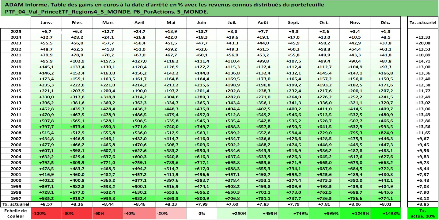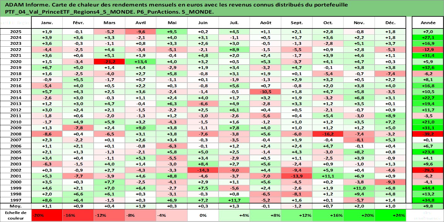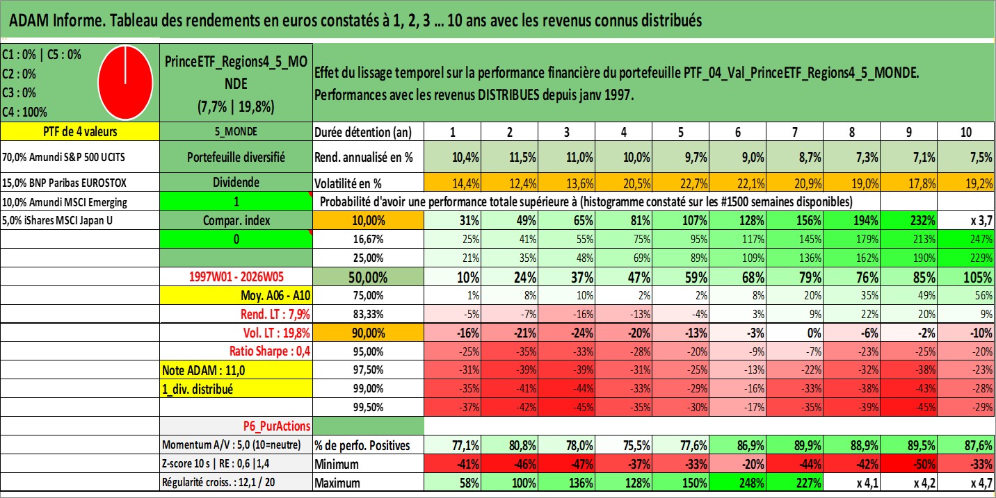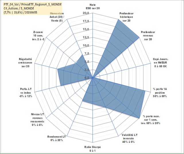 Site dédié aux investisseursPage dédiée sur site financeAnalyse des valorisations hebdomadaires du portefeuille PrinceETF_Regions4_5_MONDE_4actifs avec un profil P6_PurActions. Ce portefeuille est cote en EUR. Les valorisations couvrent les semaines 1997W01 a 2026W05. Les revenus de cet actif financier sont pris en compte depuis la semaine 1997W01. La note ESG de cet actif n'est pas connue.