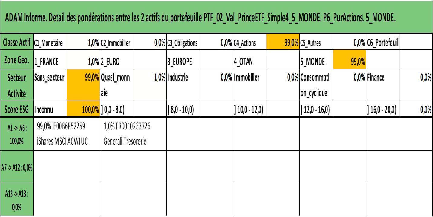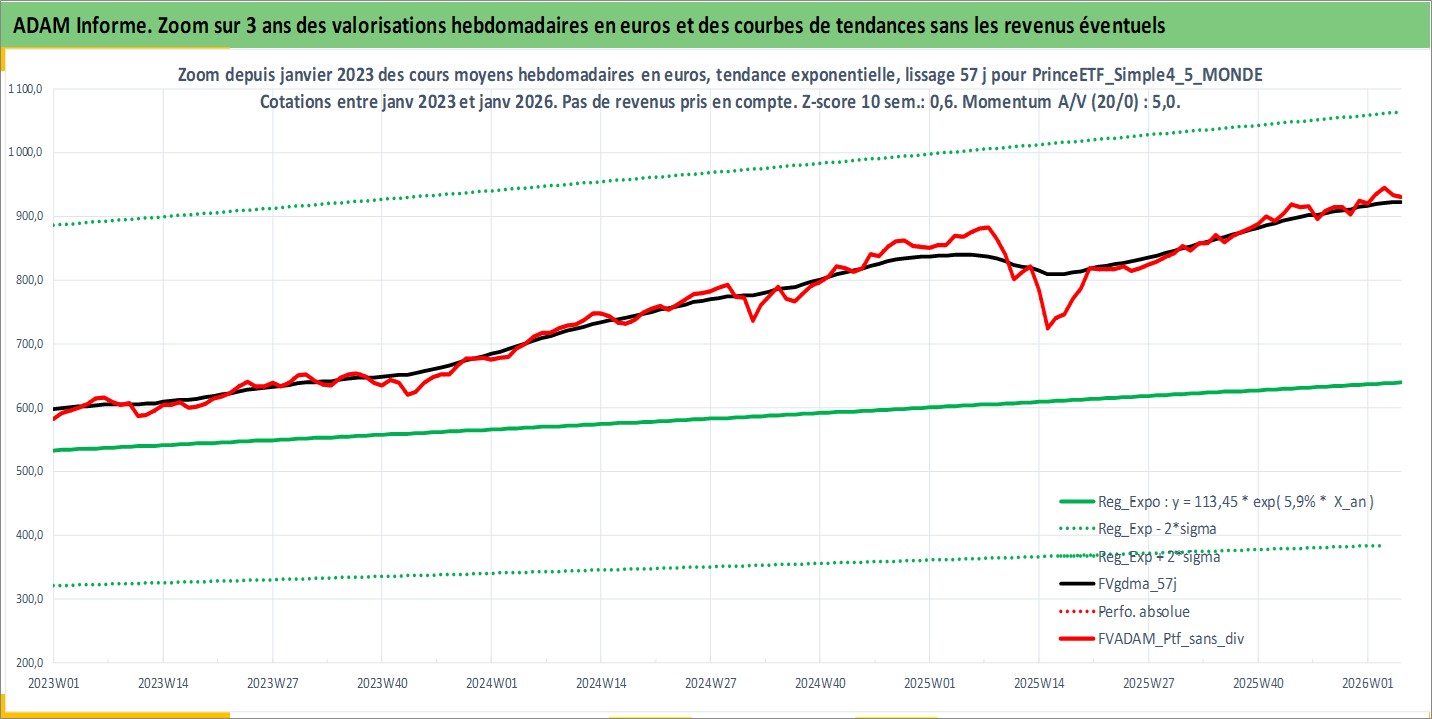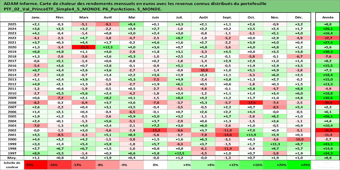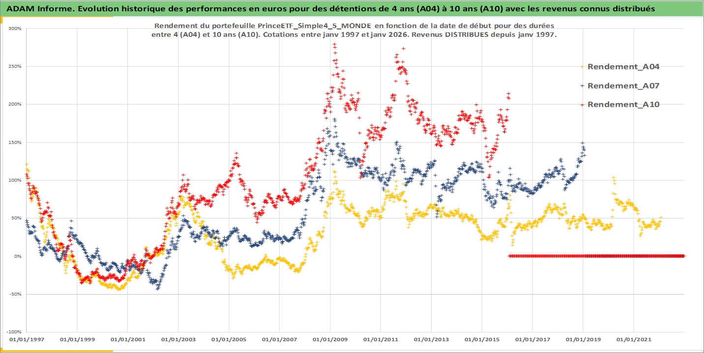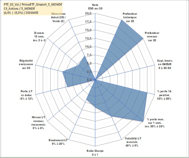 Site dédié aux investisseursPage dédiée sur site financeAnalyse des valorisations hebdomadaires du portefeuille PrinceETF_Simple4_5_MONDE_2actifs avec un profil P6_PurActions. Ce portefeuille est cote en EUR. Les valorisations couvrent les semaines 1997W01 a 2026W05. Les revenus de cet actif financier sont pris en compte depuis la semaine 1997W01. La note ESG de cet actif n'est pas connue.