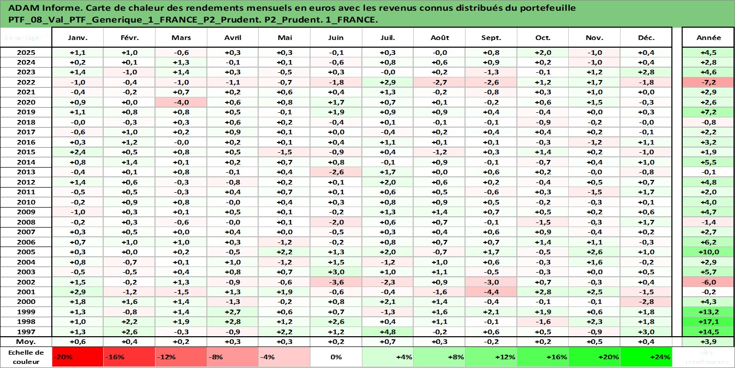 Site dédié aux investisseursPage dédiée sur site financeAnalyse des valorisations hebdomadaires du portefeuille PTF_Generique_1_FRANCE_P2_Prudent_8actifs avec un profil P2_Prudent. Ce portefeuille est cote en EUR. Les valorisations couvrent les semaines 1997W01 a 2026W05. Les revenus de cet actif financier sont pris en compte depuis la semaine 1997W01. La note ESG de cet actif n'est pas connue.