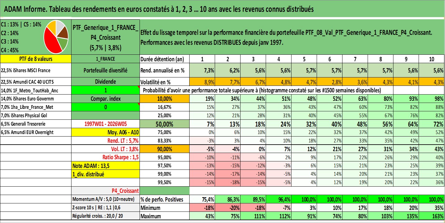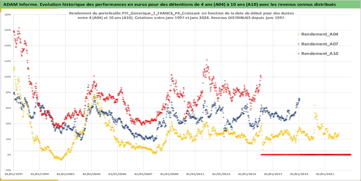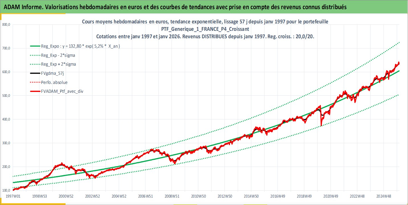 Site dédié aux investisseursPage dédiée sur site financeAnalyse des valorisations hebdomadaires du portefeuille PTF_Generique_1_FRANCE_P4_Croissant_8actifs avec un profil P4_Croissant. Ce portefeuille est cote en EUR. Les valorisations couvrent les semaines 1997W01 a 2026W05. Les revenus de cet actif financier sont pris en compte depuis la semaine 1997W01. La note ESG de cet actif n'est pas connue.