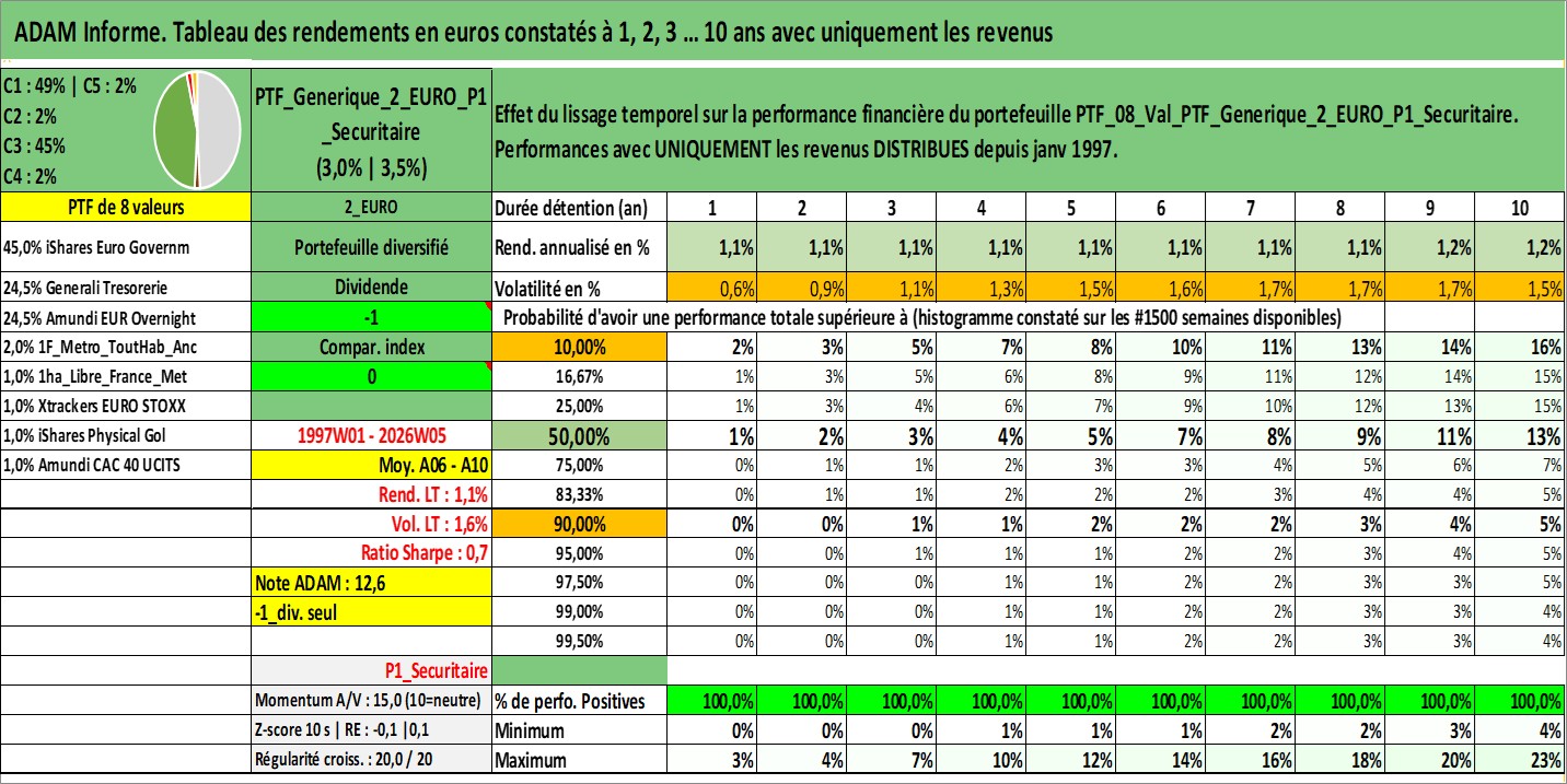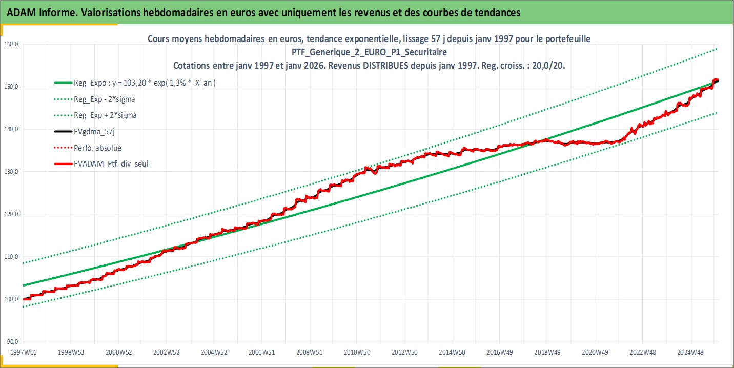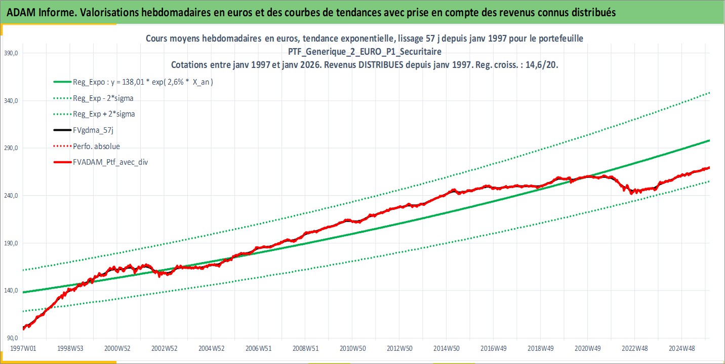 Site dédié aux investisseursPage dédiée sur site financeAnalyse des valorisations hebdomadaires du portefeuille PTF_Generique_2_EURO_P1_Securitaire_8actifs avec un profil P1_Securitaire. Ce portefeuille est cote en EUR. Les valorisations couvrent les semaines 1997W01 a 2026W05. Les revenus de cet actif financier sont pris en compte depuis la semaine 1997W01. La note ESG de cet actif n'est pas connue.