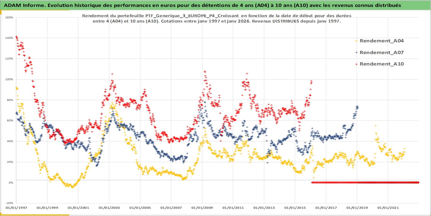 Site dédié aux investisseursPage dédiée sur site financeAnalyse des valorisations hebdomadaires du portefeuille PTF_Generique_3_EUROPE_P4_Croissant_9actifs avec un profil P4_Croissant. Ce portefeuille est cote en EUR. Les valorisations couvrent les semaines 1997W01 a 2026W05. Les revenus de cet actif financier sont pris en compte depuis la semaine 1997W01. La note ESG de cet actif n'est pas connue.