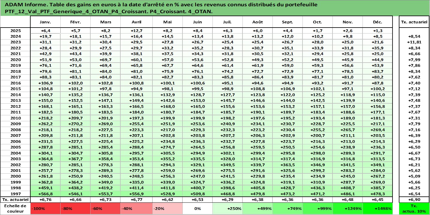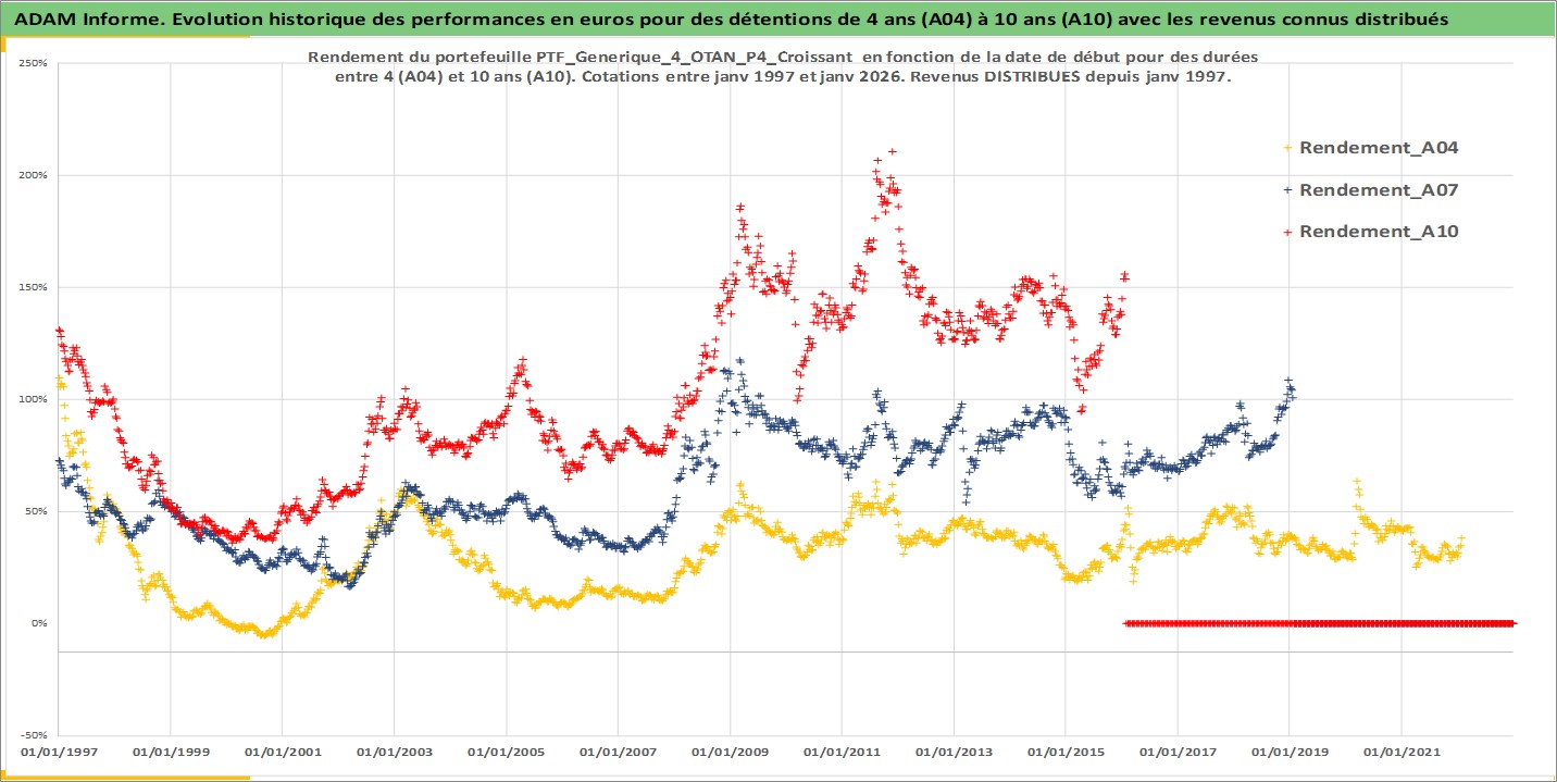 Site dédié aux investisseursPage dédiée sur site financeAnalyse des valorisations hebdomadaires du portefeuille PTF_Generique_4_OTAN_P4_Croissant_12actifs avec un profil P4_Croissant. Ce portefeuille est cote en EUR. Les valorisations couvrent les semaines 1997W01 a 2026W05. Les revenus de cet actif financier sont pris en compte depuis la semaine 1997W01. La note ESG de cet actif n'est pas connue.