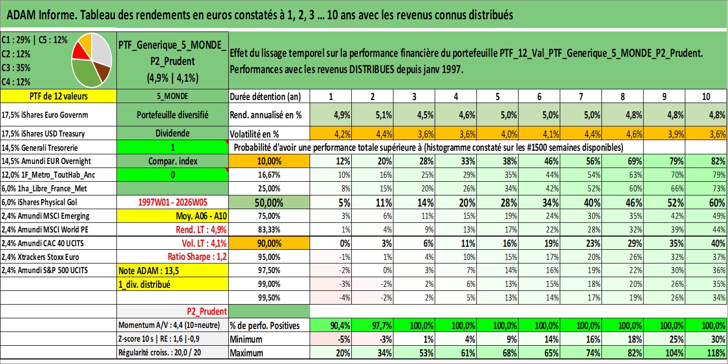 Site dédié aux investisseursPage dédiée sur site financeAnalyse des valorisations hebdomadaires du portefeuille PTF_Generique_5_MONDE_P2_Prudent_12actifs avec un profil P2_Prudent. Ce portefeuille est cote en EUR. Les valorisations couvrent les semaines 1997W01 a 2026W05. Les revenus de cet actif financier sont pris en compte depuis la semaine 1997W01. La note ESG de cet actif n'est pas connue.