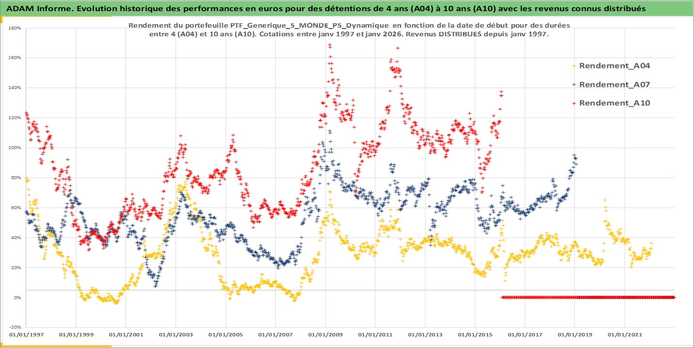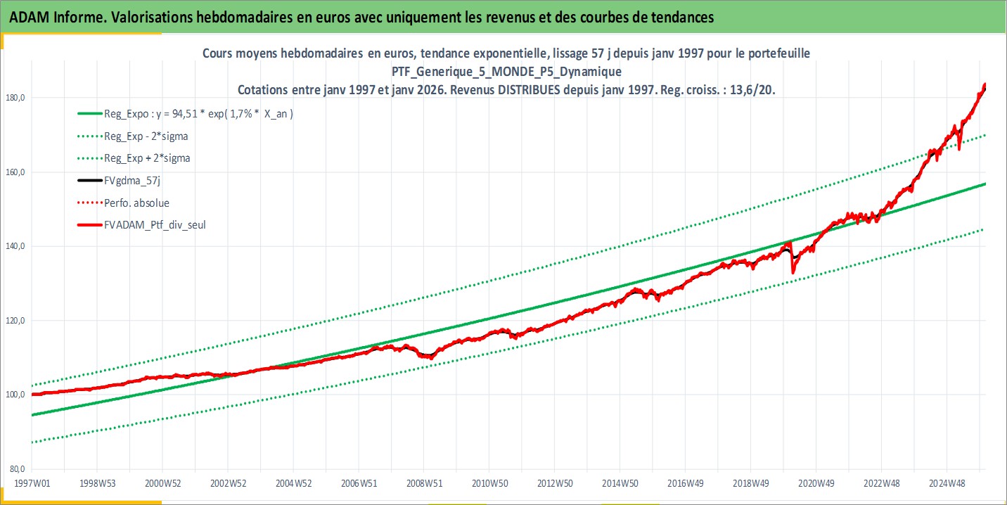 Site dédié aux investisseursPage dédiée sur site financeAnalyse des valorisations hebdomadaires du portefeuille PTF_Generique_5_MONDE_P5_Dynamique_12actifs avec un profil P5_Dynamique. Ce portefeuille est cote en EUR. Les valorisations couvrent les semaines 1997W01 a 2026W05. Les revenus de cet actif financier sont pris en compte depuis la semaine 1997W01. La note ESG de cet actif n'est pas connue.
