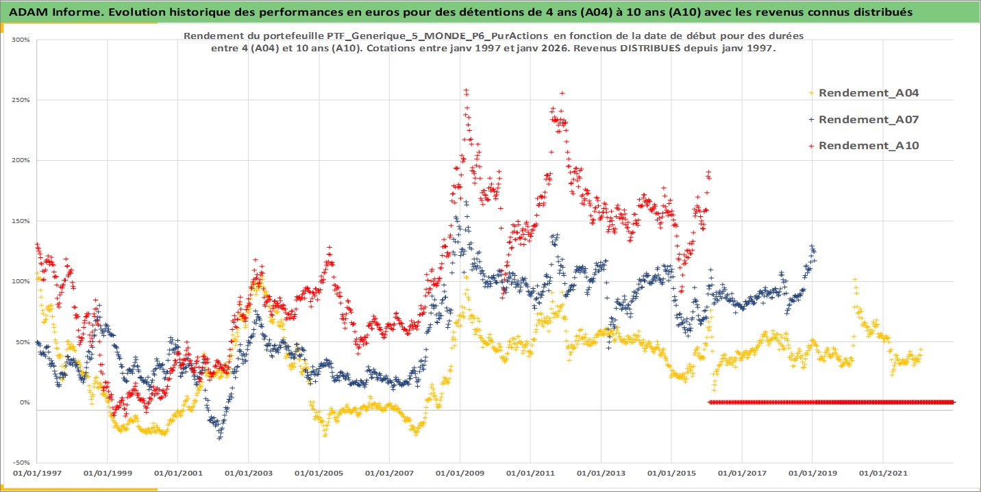 Site dédié aux investisseursPage dédiée sur site financeAnalyse des valorisations hebdomadaires du portefeuille PTF_Generique_5_MONDE_P6_PurActions_5actifs avec un profil P6_PurActions. Ce portefeuille est cote en EUR. Les valorisations couvrent les semaines 1997W01 a 2026W05. Les revenus de cet actif financier sont pris en compte depuis la semaine 1997W01. La note ESG de cet actif n'est pas connue.