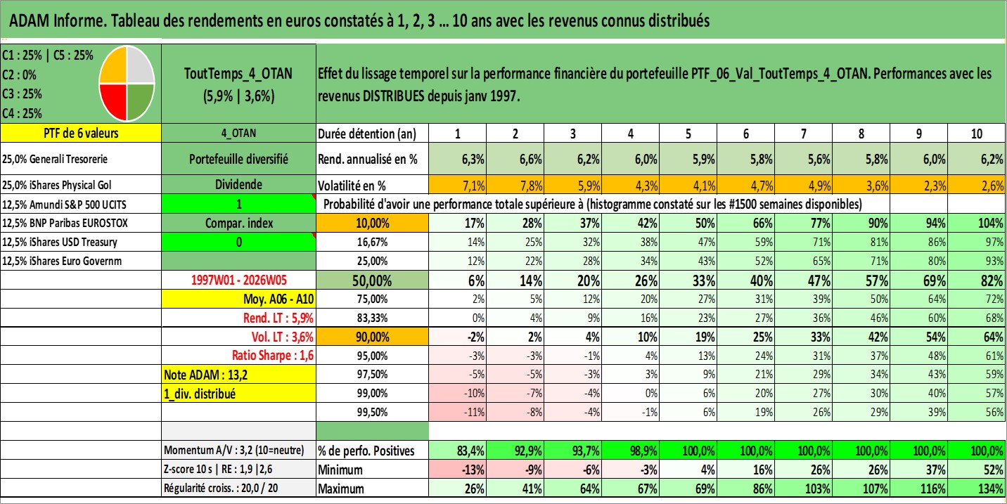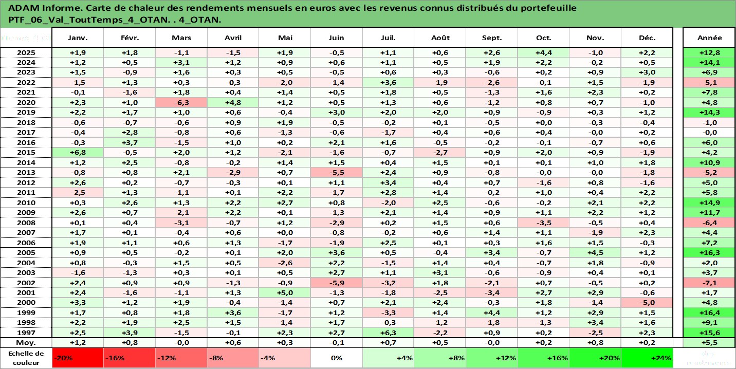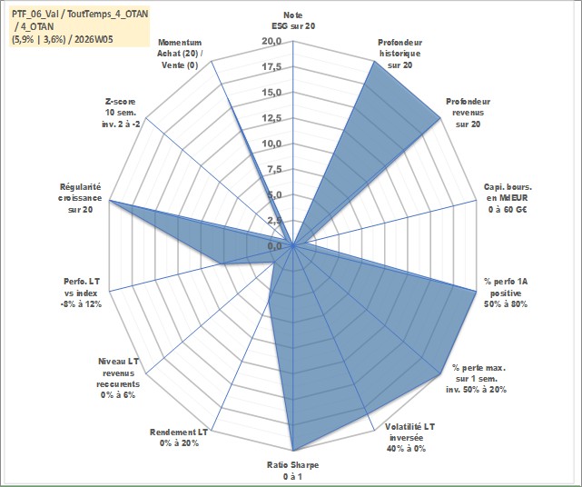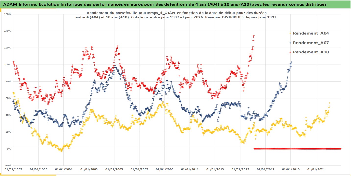 Site dédié aux investisseursPage dédiée sur site financeAnalyse des valorisations hebdomadaires du portefeuille ToutTemps_4_OTAN_6actifs avec un profil P6_PurActions. Ce portefeuille est cote en EUR. Les valorisations couvrent les semaines 1997W01 a 2026W05. Les revenus de cet actif financier sont pris en compte depuis la semaine 1997W01. La note ESG de cet actif n'est pas connue.