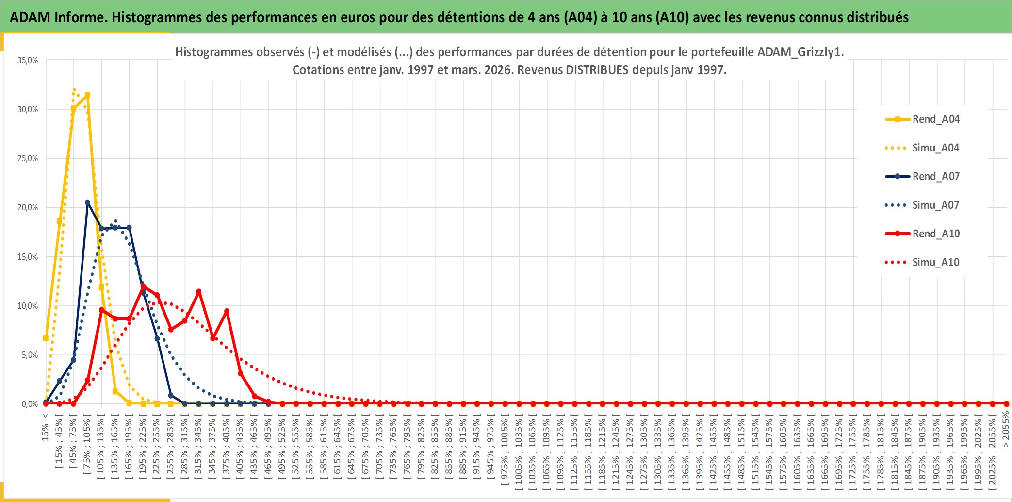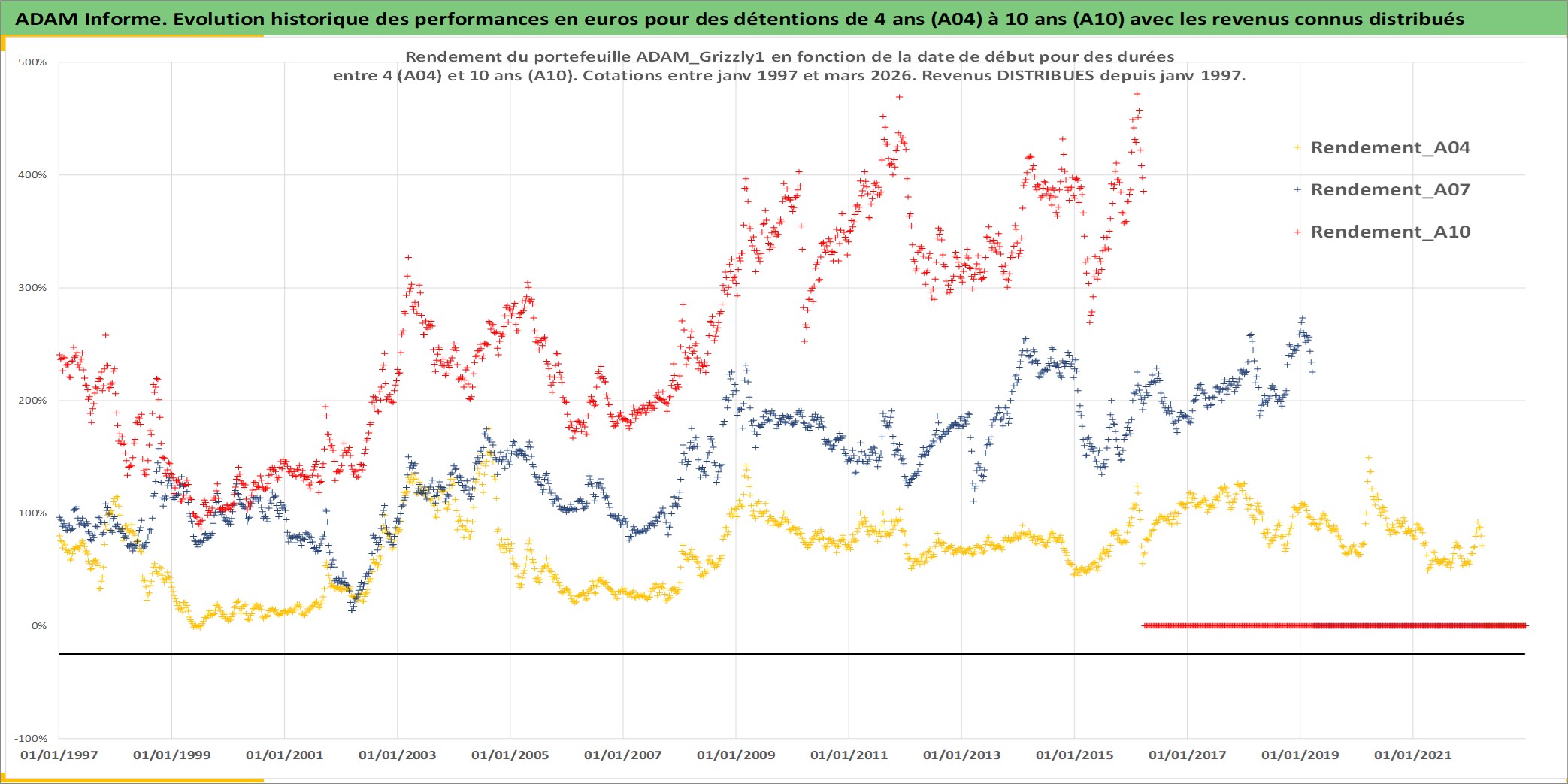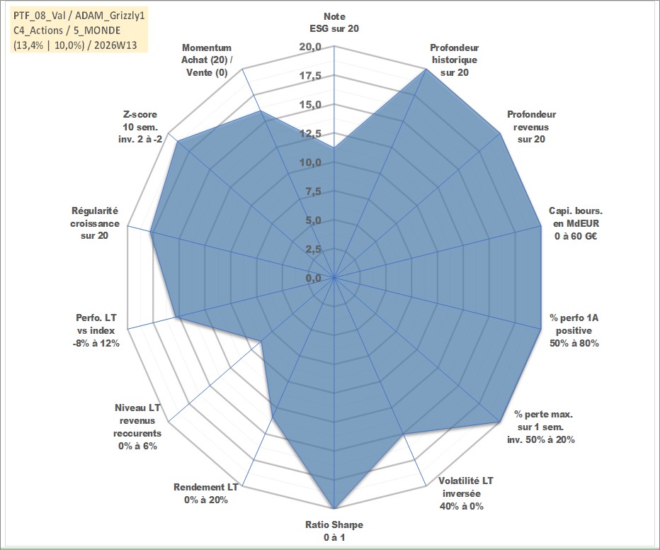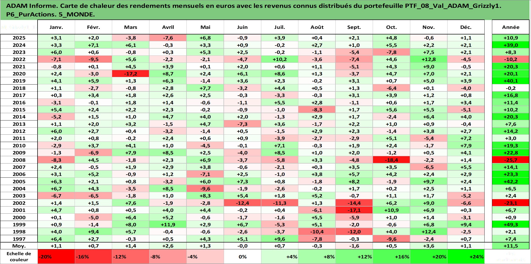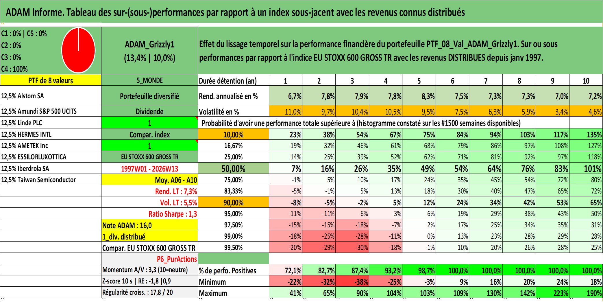 Site dédié aux investisseursPage dédiée sur site financeAnalyse des valorisations hebdomadaires du portefeuille ADAM_Grizzly1_8actifs avec un profil P6_PurActions. Ce portefeuille est cote en EUR. Les valorisations couvrent les semaines 1997W01 a 2026W13. Les revenus de cet actif financier sont pris en compte depuis la semaine 1997W01. La note globale ESG de cet actif est estimee a 11.2 (apres rebasage entre 0 et 20).