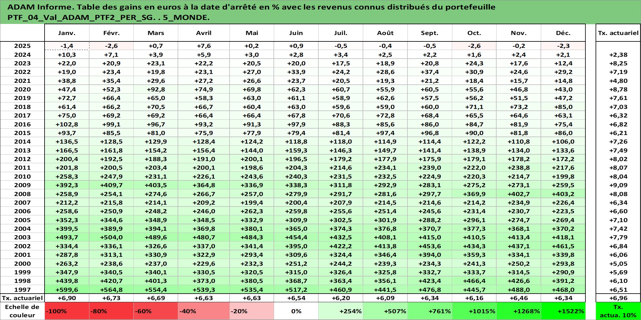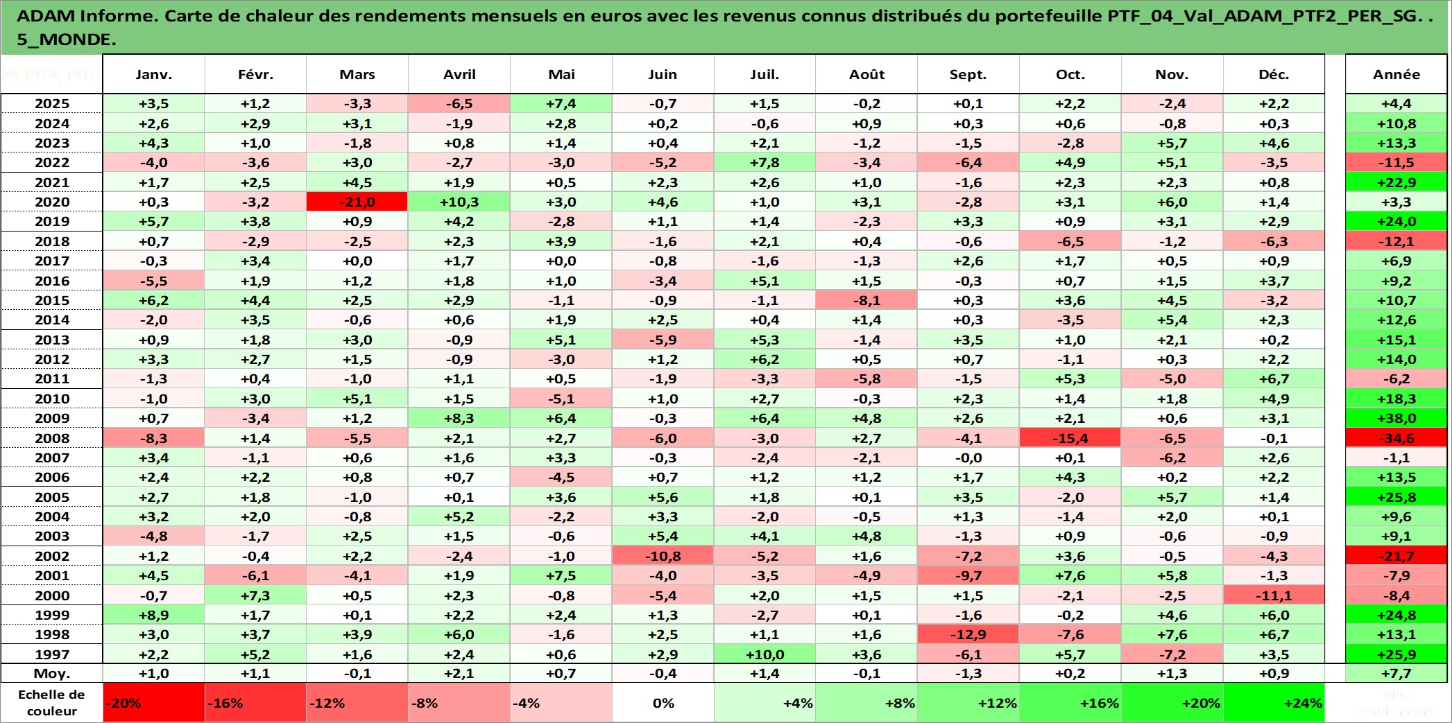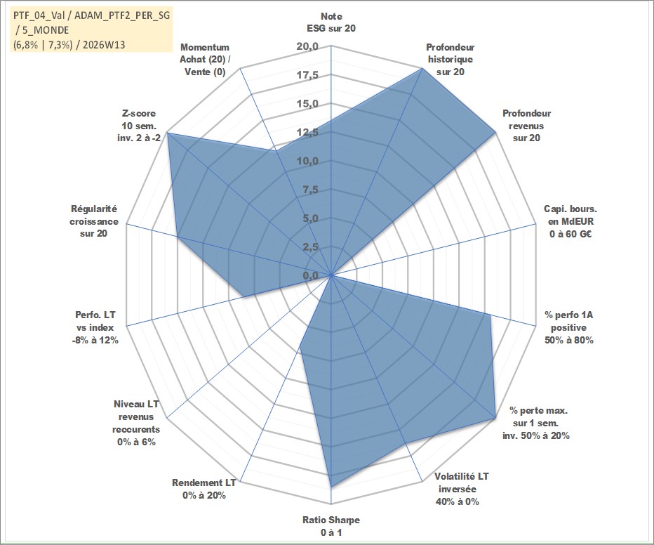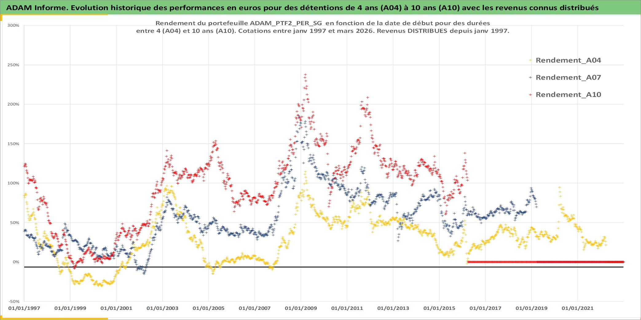 Site dédié aux investisseursPage dédiée sur site financeAnalyse des valorisations hebdomadaires du portefeuille PTF2_PER_SG_4actifs avec un profil P6_PurActions. Ce portefeuille est cote en EUR. Les valorisations couvrent les semaines 1997W01 a 2026W13. Les revenus de cet actif financier sont pris en compte depuis la semaine 1997W01. La note globale ESG de cet actif est estimee a 13.5 (apres rebasage entre 0 et 20).