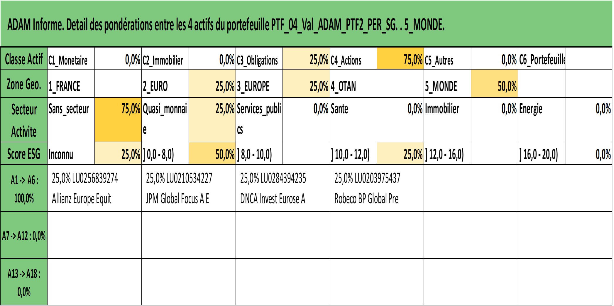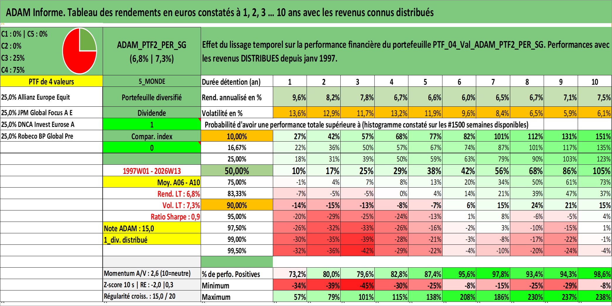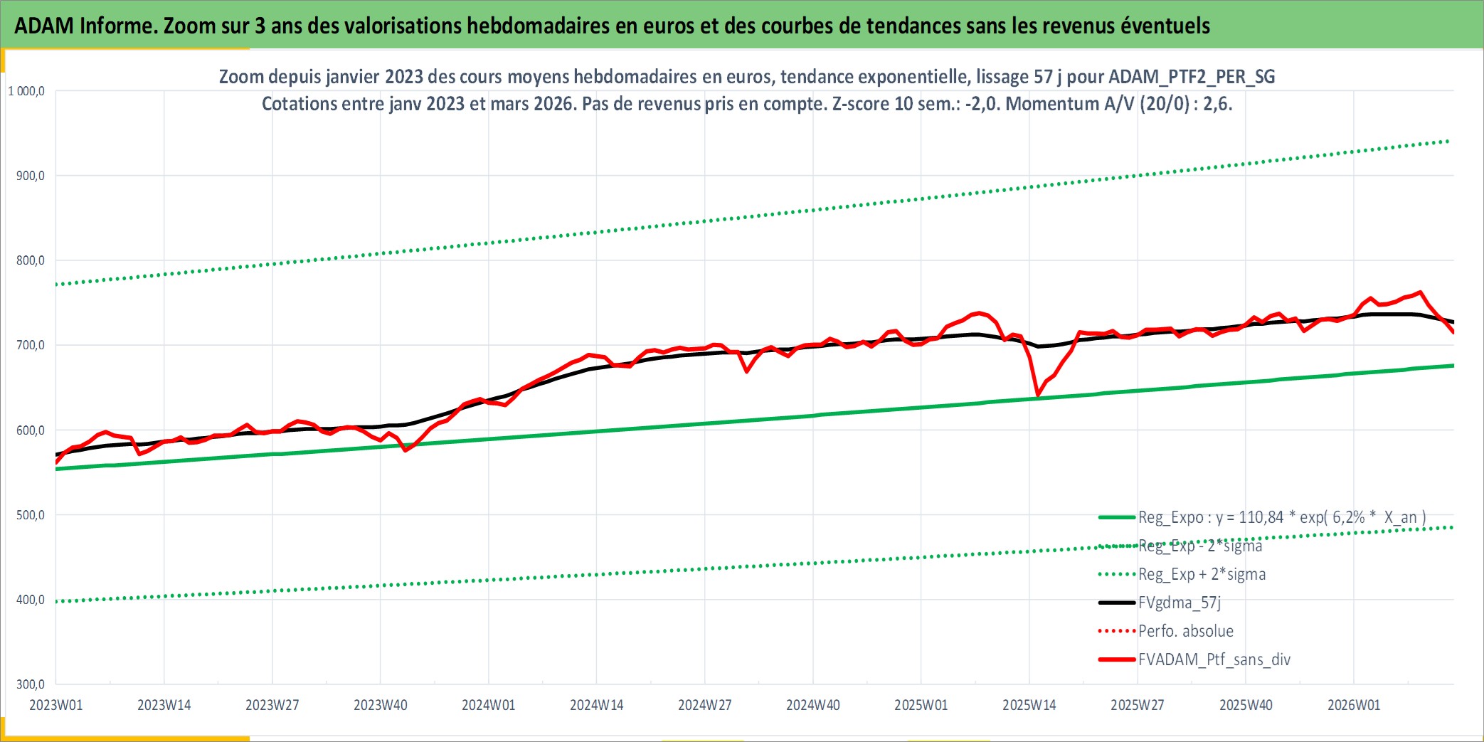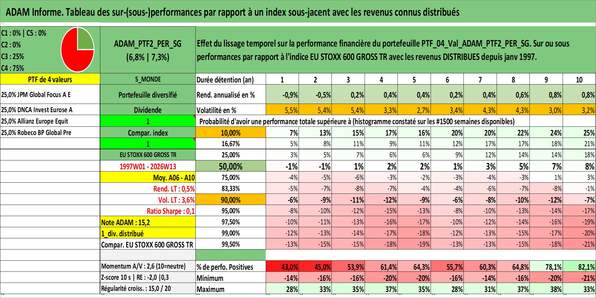 Site dédié aux investisseursPage dédiée sur site financeAnalyse des valorisations hebdomadaires du portefeuille PTF2_PER_SG_4actifs avec un profil P6_PurActions. Ce portefeuille est cote en EUR. Les valorisations couvrent les semaines 1997W01 a 2026W13. Les revenus de cet actif financier sont pris en compte depuis la semaine 1997W01. La note globale ESG de cet actif est estimee a 13.5 (apres rebasage entre 0 et 20).