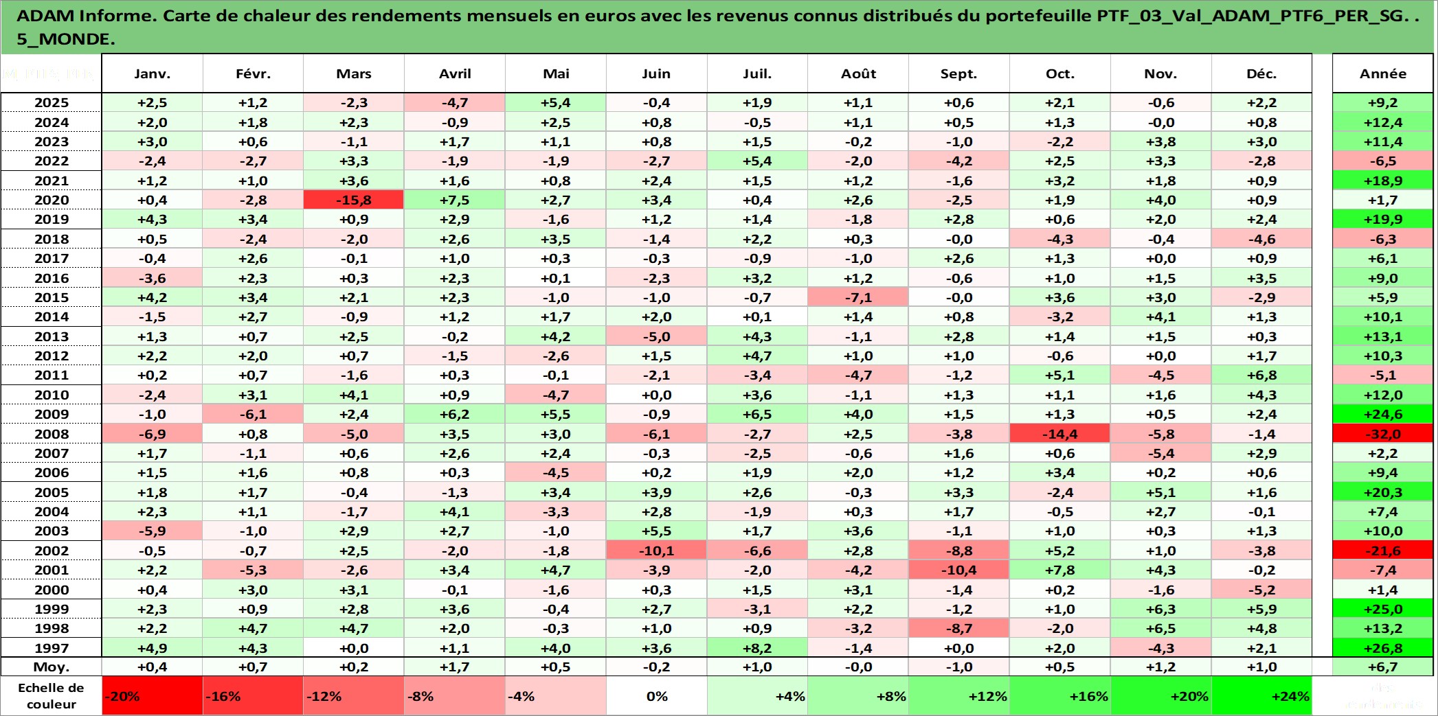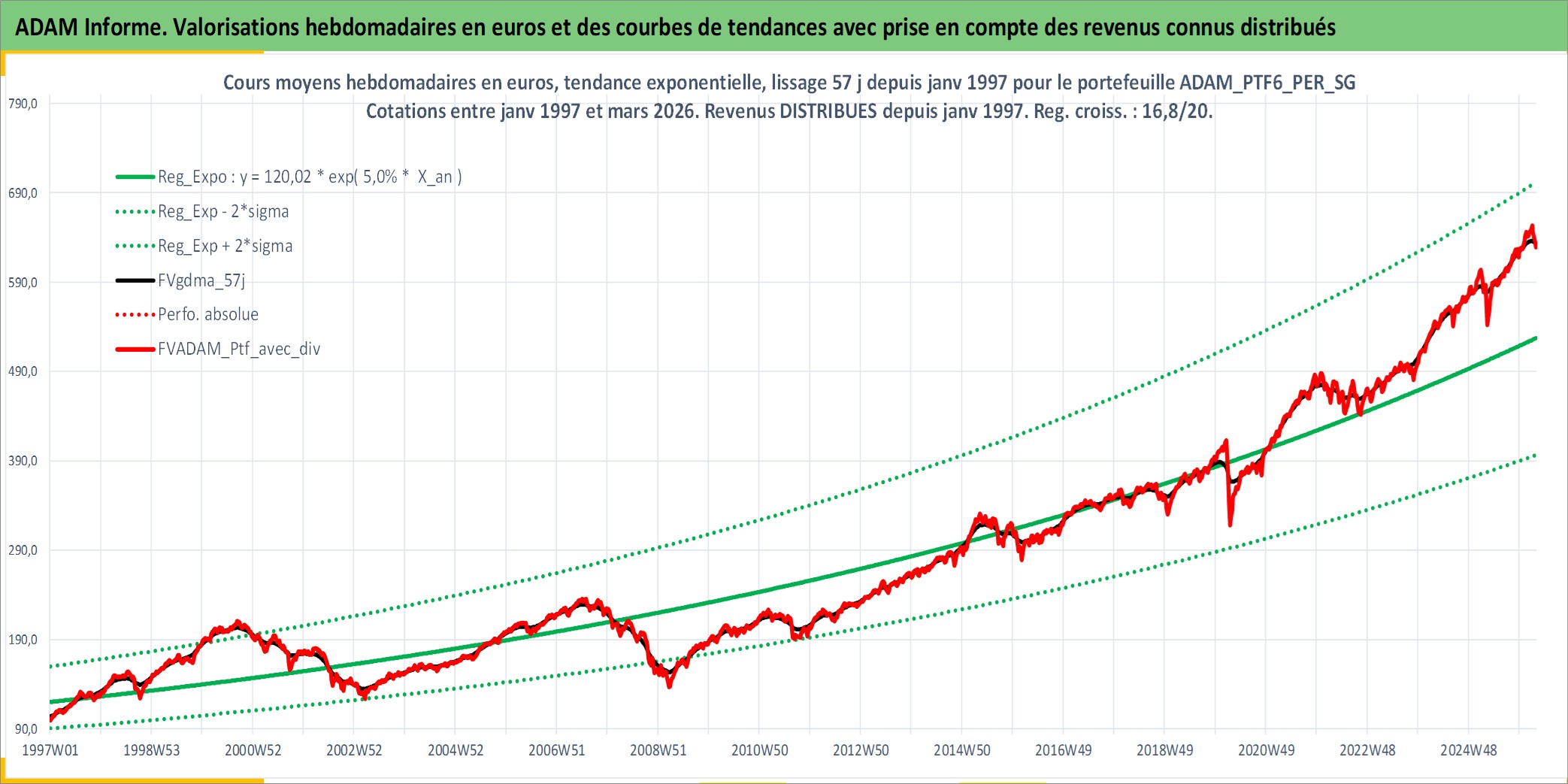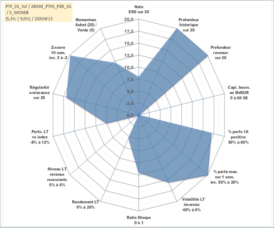 Site dédié aux investisseursPage dédiée sur site financeAnalyse des valorisations hebdomadaires du portefeuille PTF6_PER_SG_3actifs avec un profil P6_PurActions. Ce portefeuille est cote en EUR. Les valorisations couvrent les semaines 1997W01 a 2026W13. Les revenus de cet actif financier sont pris en compte depuis la semaine 1997W01. La note globale ESG de cet actif est estimee a 7.9 (apres rebasage entre 0 et 20).