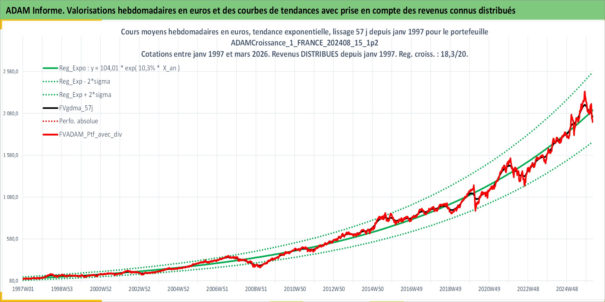 Site dédié aux investisseursPage dédiée sur site financeAnalyse des valorisations hebdomadaires du portefeuille ADAMCroissance_1_FRANCE_202408_15_1p2_3actifs avec un profil P6_PurActions. Ce portefeuille est cote en EUR. Les valorisations couvrent les semaines 1997W01 a 2026W13. Les revenus de cet actif financier sont pris en compte depuis la semaine 1997W01. La note globale ESG de cet actif est estimee a 12.3 (apres rebasage entre 0 et 20).