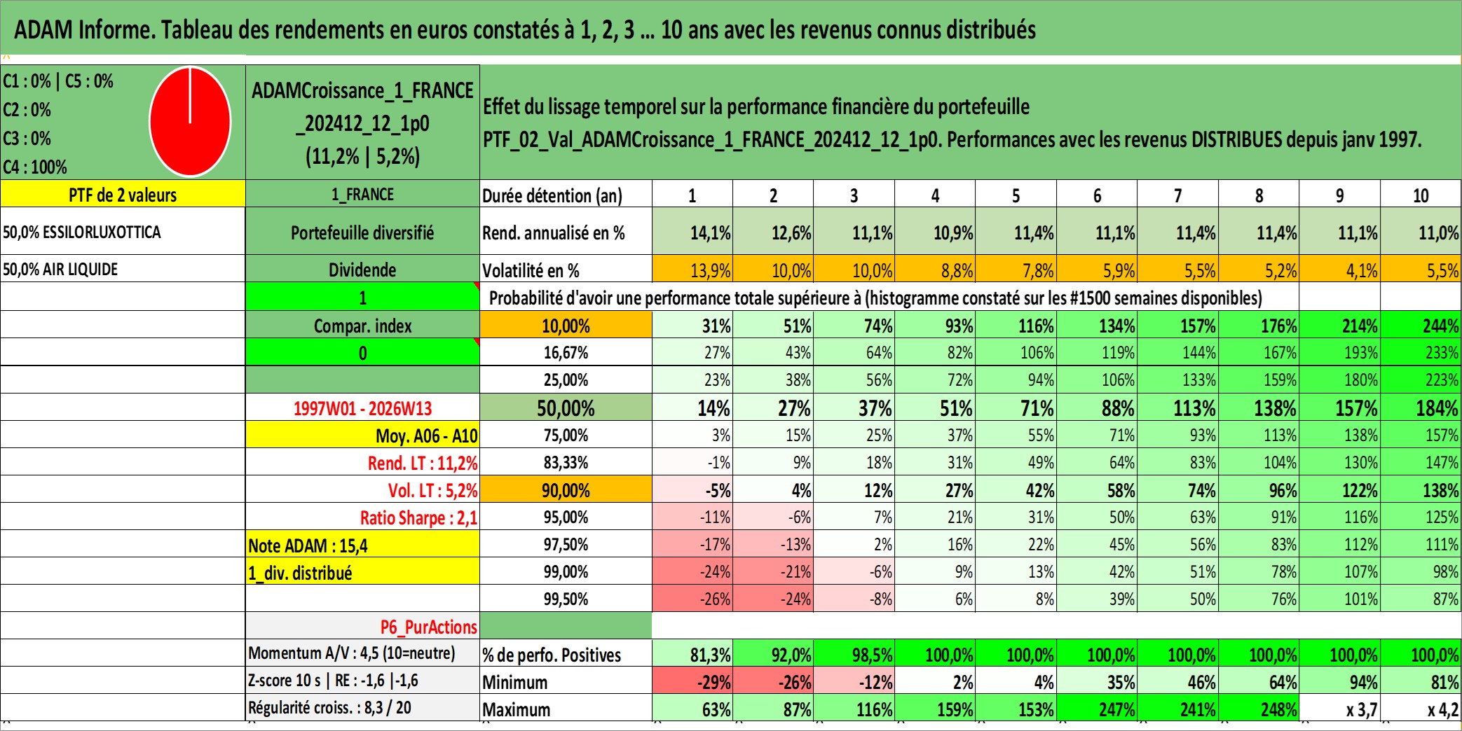 Site dédié aux investisseursPage dédiée sur site financeAnalyse des valorisations hebdomadaires du portefeuille ADAMCroissance_1_FRANCE_202412_12_1p0_2actifs avec un profil P6_PurActions. Ce portefeuille est cote en EUR. Les valorisations couvrent les semaines 1997W01 a 2026W13. Les revenus de cet actif financier sont pris en compte depuis la semaine 1997W01. La note globale ESG de cet actif est estimee a 12.0 (apres rebasage entre 0 et 20).