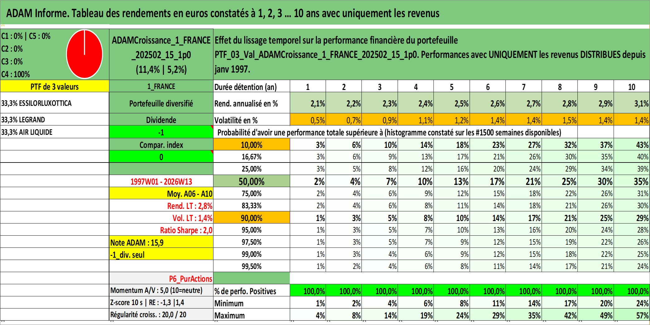 Site dédié aux investisseursPage dédiée sur site financeAnalyse des valorisations hebdomadaires du portefeuille ADAMCroissance_1_FRANCE_202502_15_1p0_3actifs avec un profil P6_PurActions. Ce portefeuille est cote en EUR. Les valorisations couvrent les semaines 1997W01 a 2026W13. Les revenus de cet actif financier sont pris en compte depuis la semaine 1997W01. La note globale ESG de cet actif est estimee a 12.3 (apres rebasage entre 0 et 20).