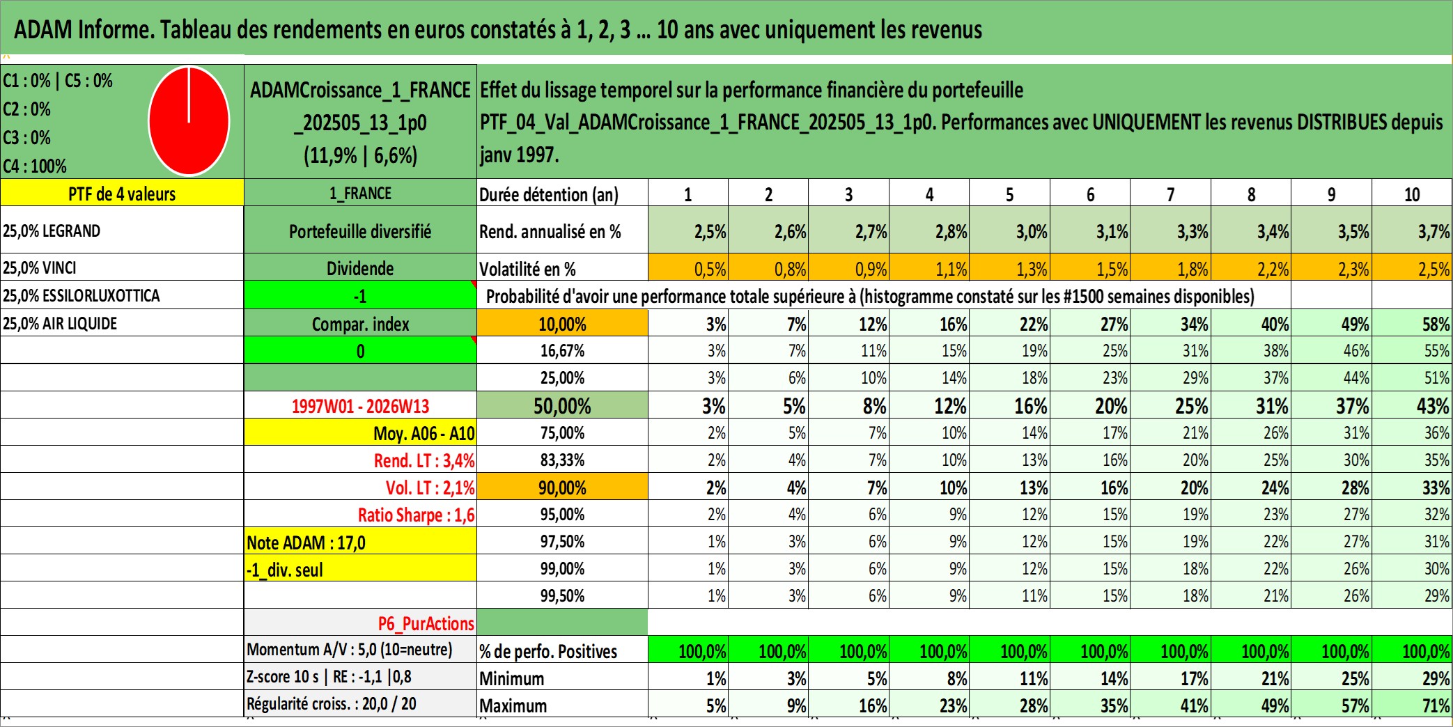 Site dédié aux investisseursPage dédiée sur site financeAnalyse des valorisations hebdomadaires du portefeuille ADAMCroissance_1_FRANCE_202505_13_1p0_4actifs avec un profil P6_PurActions. Ce portefeuille est cote en EUR. Les valorisations couvrent les semaines 1997W01 a 2026W13. Les revenus de cet actif financier sont pris en compte depuis la semaine 1997W01. La note globale ESG de cet actif est estimee a 11.0 (apres rebasage entre 0 et 20).