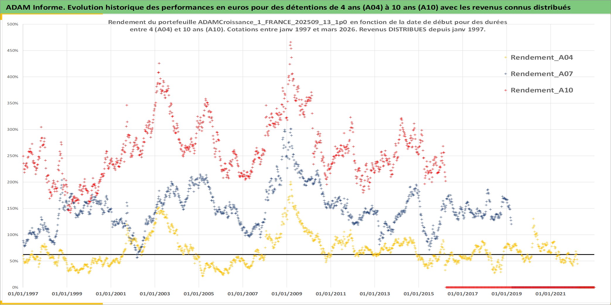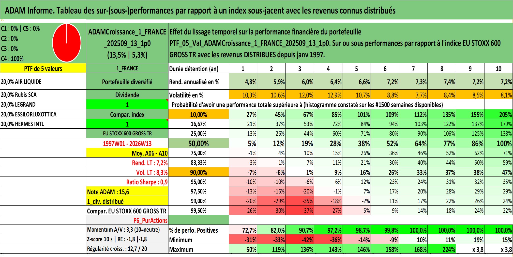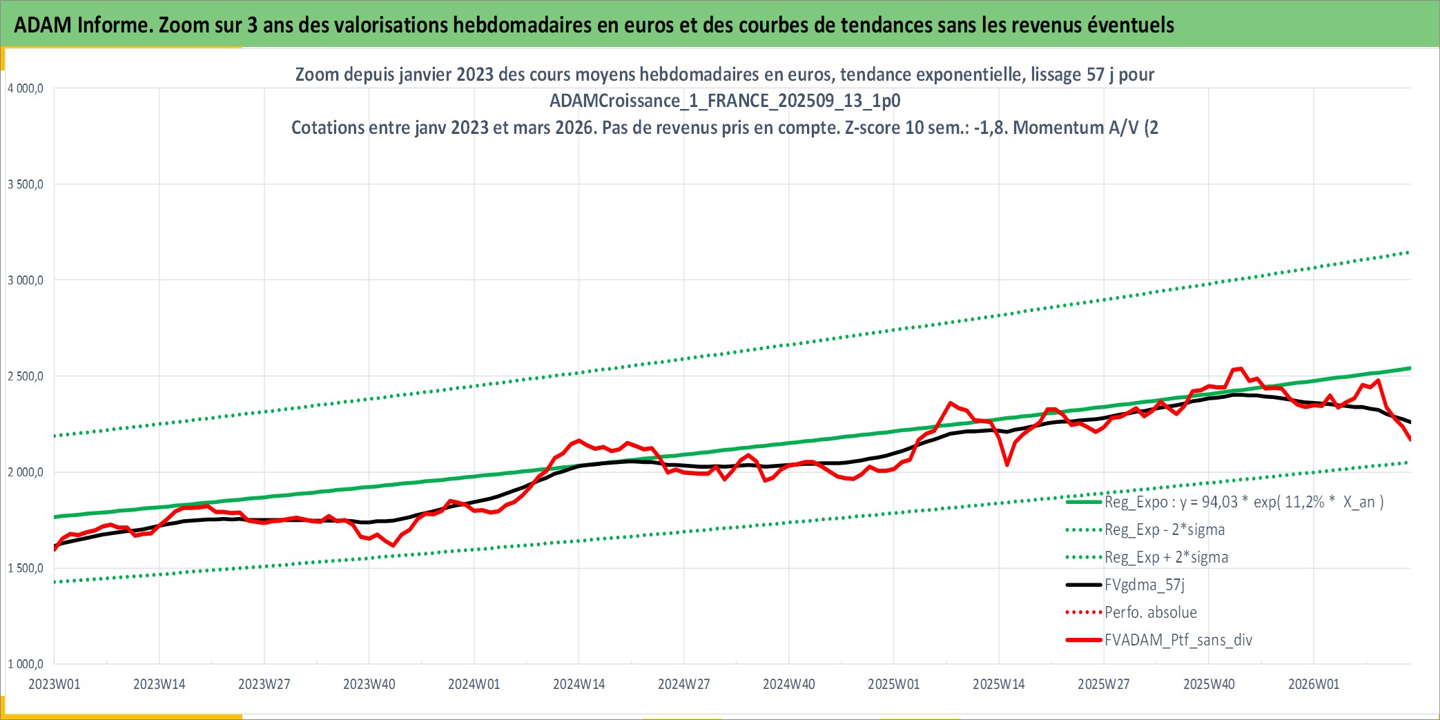 Site dédié aux investisseursPage dédiée sur site financeAnalyse des valorisations hebdomadaires du portefeuille ADAMCroissance_1_FRANCE_202509_13_1p0_5actifs avec un profil P6_PurActions. Ce portefeuille est cote en EUR. Les valorisations couvrent les semaines 1997W01 a 2026W13. Les revenus de cet actif financier sont pris en compte depuis la semaine 1997W01. La note globale ESG de cet actif est estimee a 13.5 (apres rebasage entre 0 et 20).