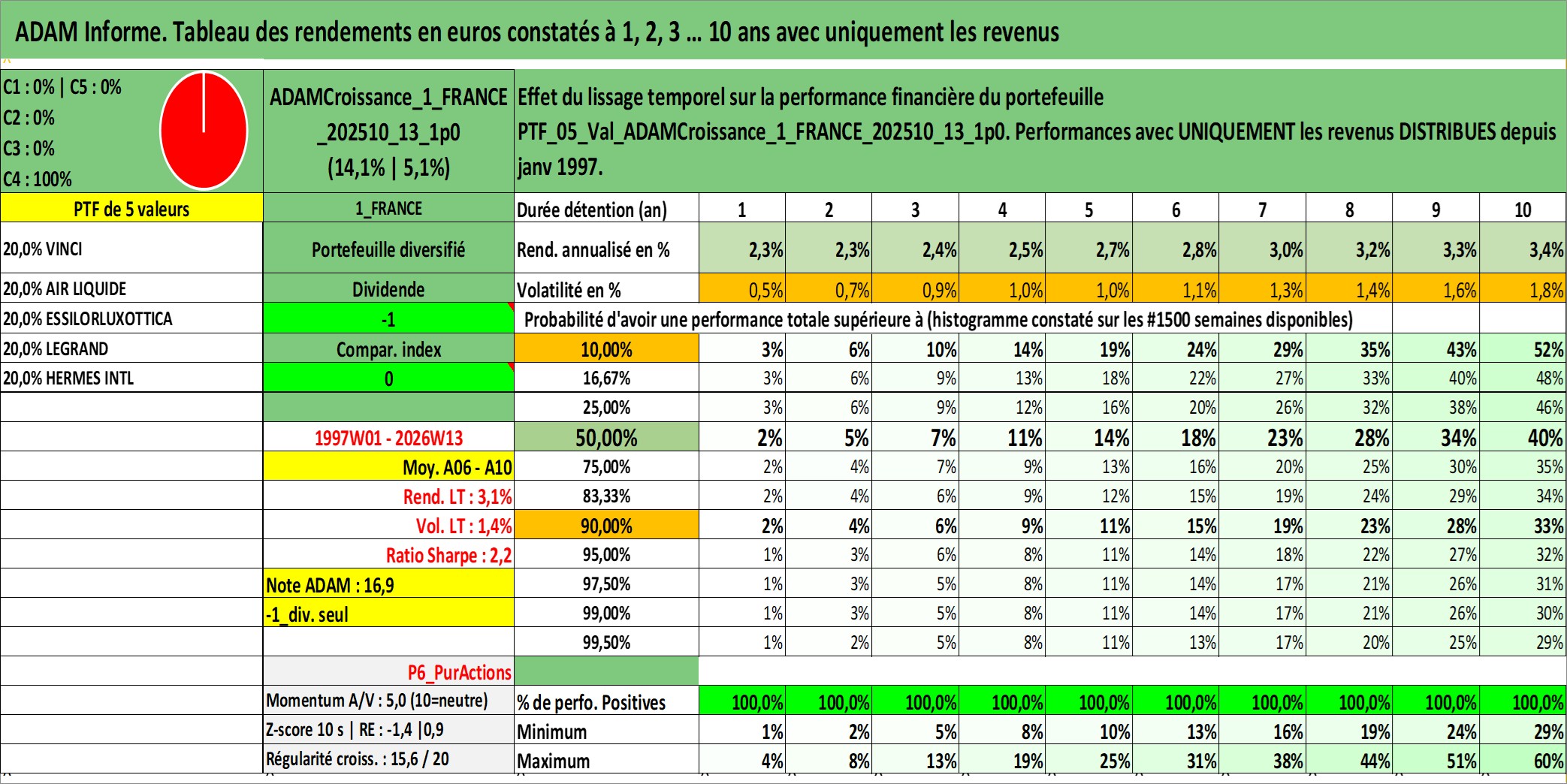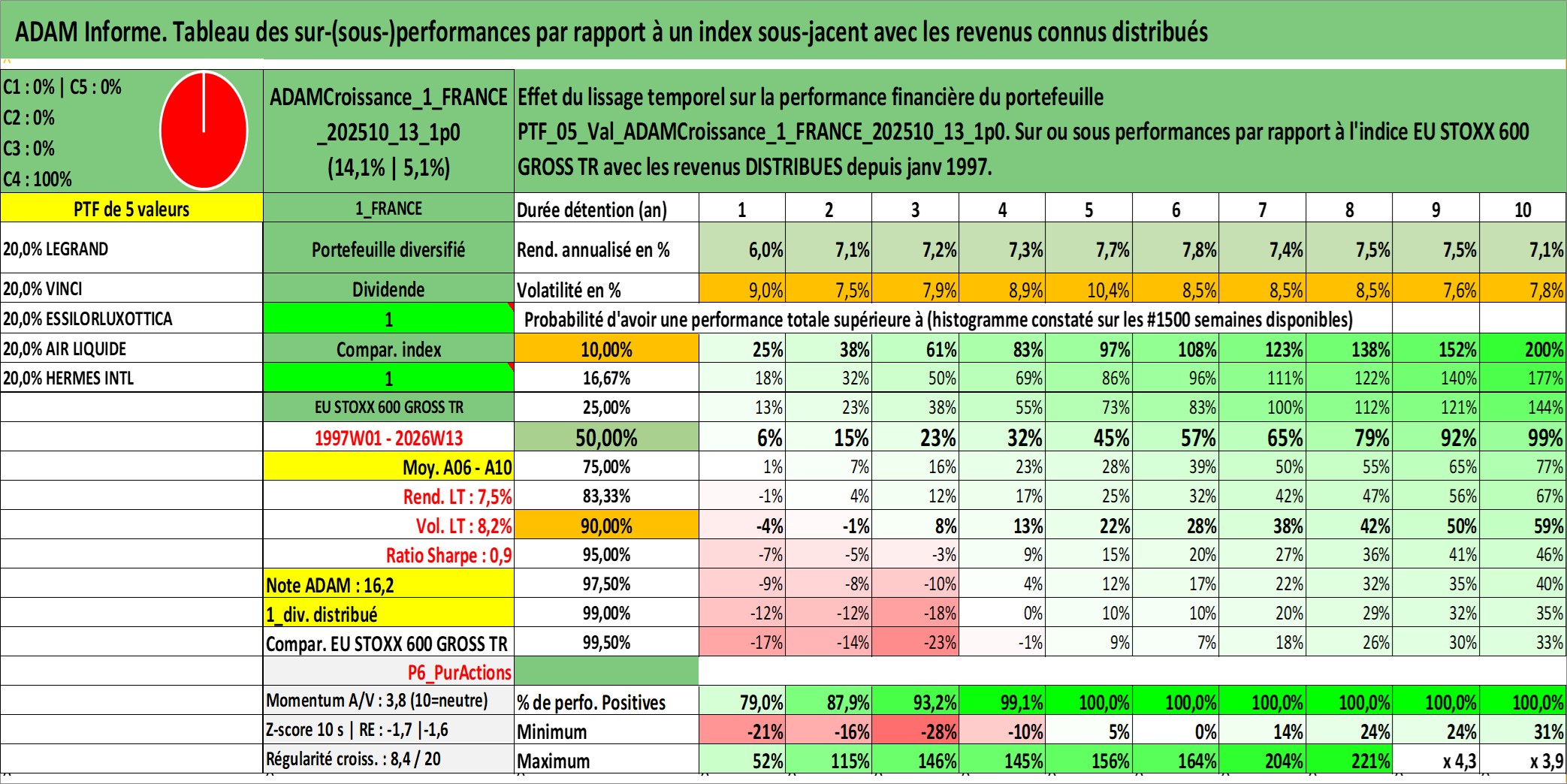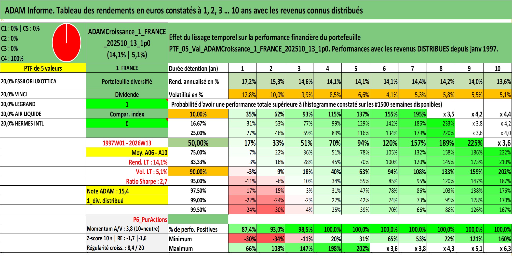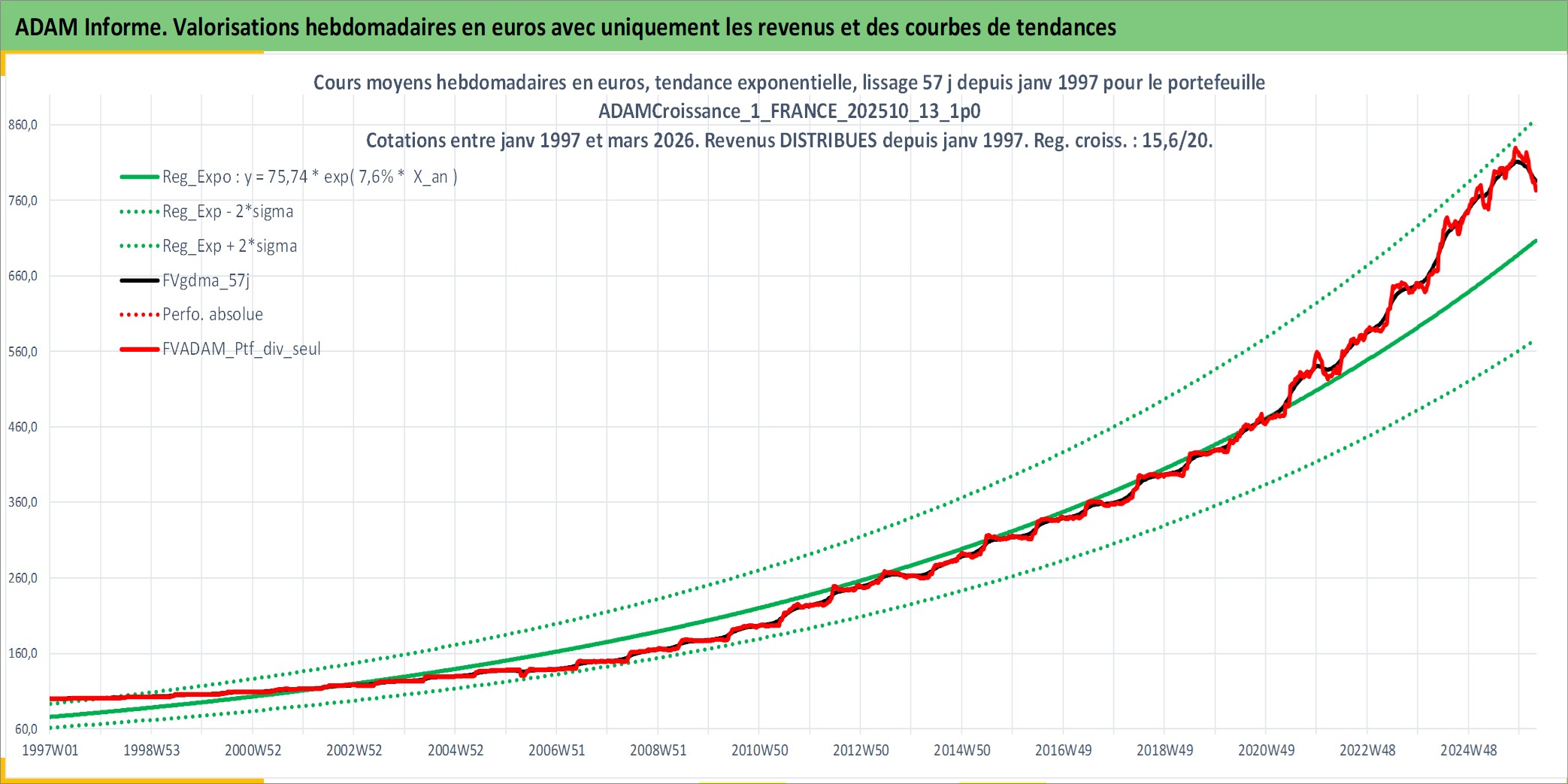 Site dédié aux investisseursPage dédiée sur site financeAnalyse des valorisations hebdomadaires du portefeuille ADAMCroissance_1_FRANCE_202510_13_1p0_5actifs avec un profil P6_PurActions. Ce portefeuille est cote en EUR. Les valorisations couvrent les semaines 1997W01 a 2026W13. Les revenus de cet actif financier sont pris en compte depuis la semaine 1997W01. La note globale ESG de cet actif est estimee a 12.2 (apres rebasage entre 0 et 20).