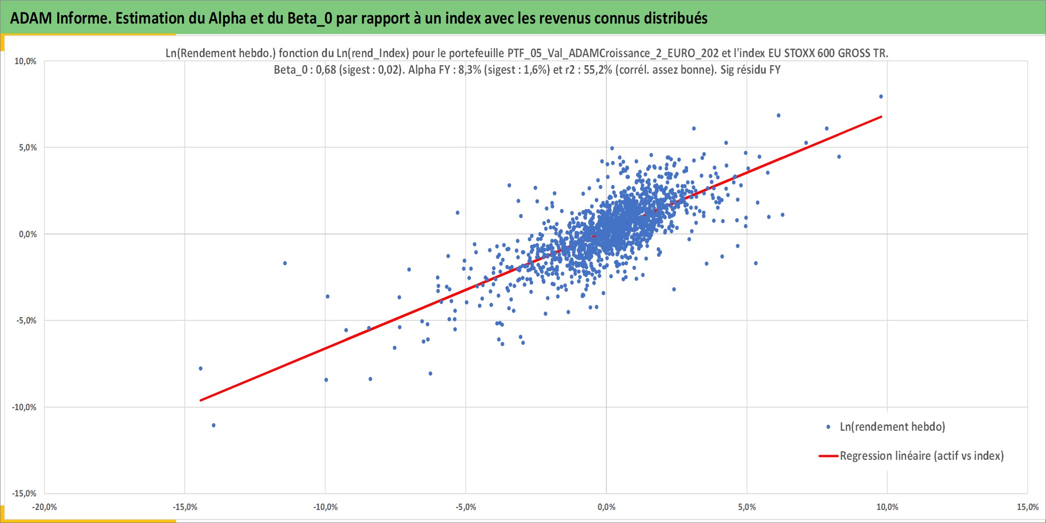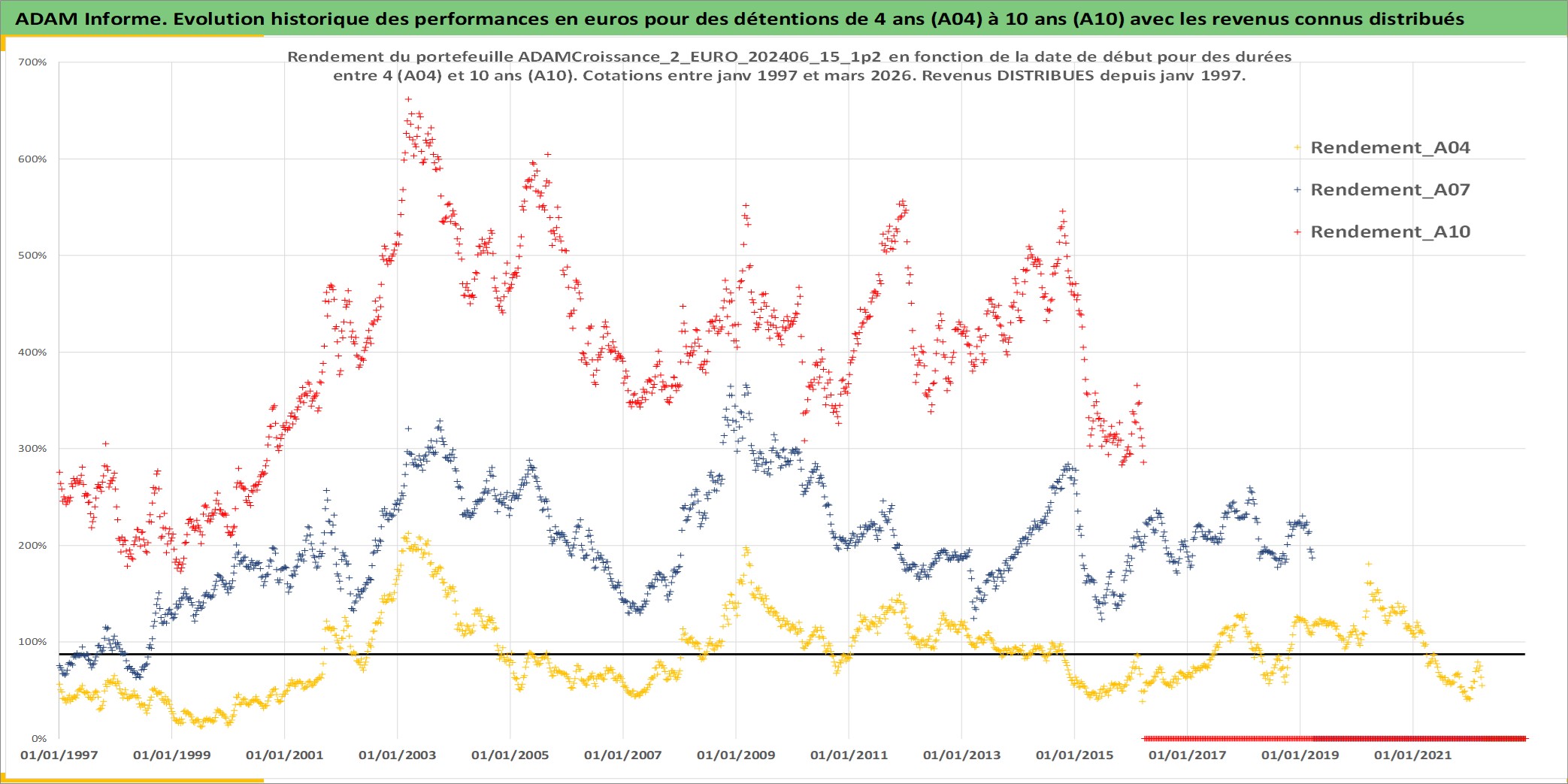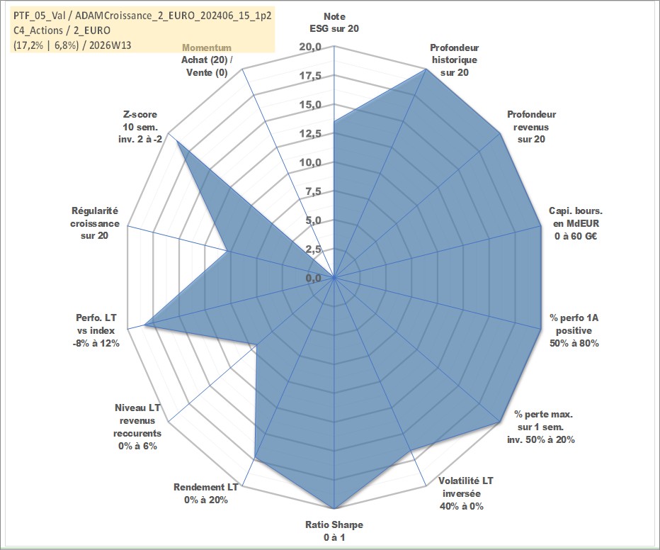 Site dédié aux investisseursPage dédiée sur site financeAnalyse des valorisations hebdomadaires du portefeuille ADAMCroissance_2_EURO_202406_15_1p2_5actifs avec un profil P6_PurActions. Ce portefeuille est cote en EUR. Les valorisations couvrent les semaines 1997W01 a 2026W13. Les revenus de cet actif financier sont pris en compte depuis la semaine 1997W01. La note globale ESG de cet actif est estimee a 13.5 (apres rebasage entre 0 et 20).