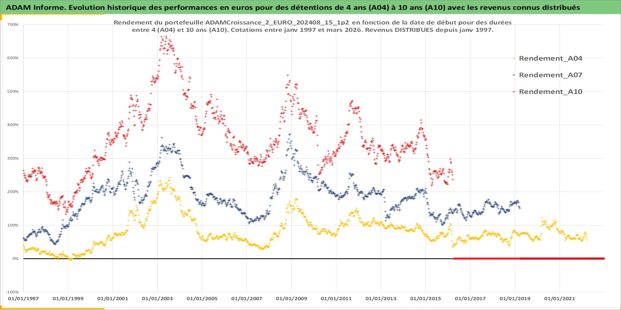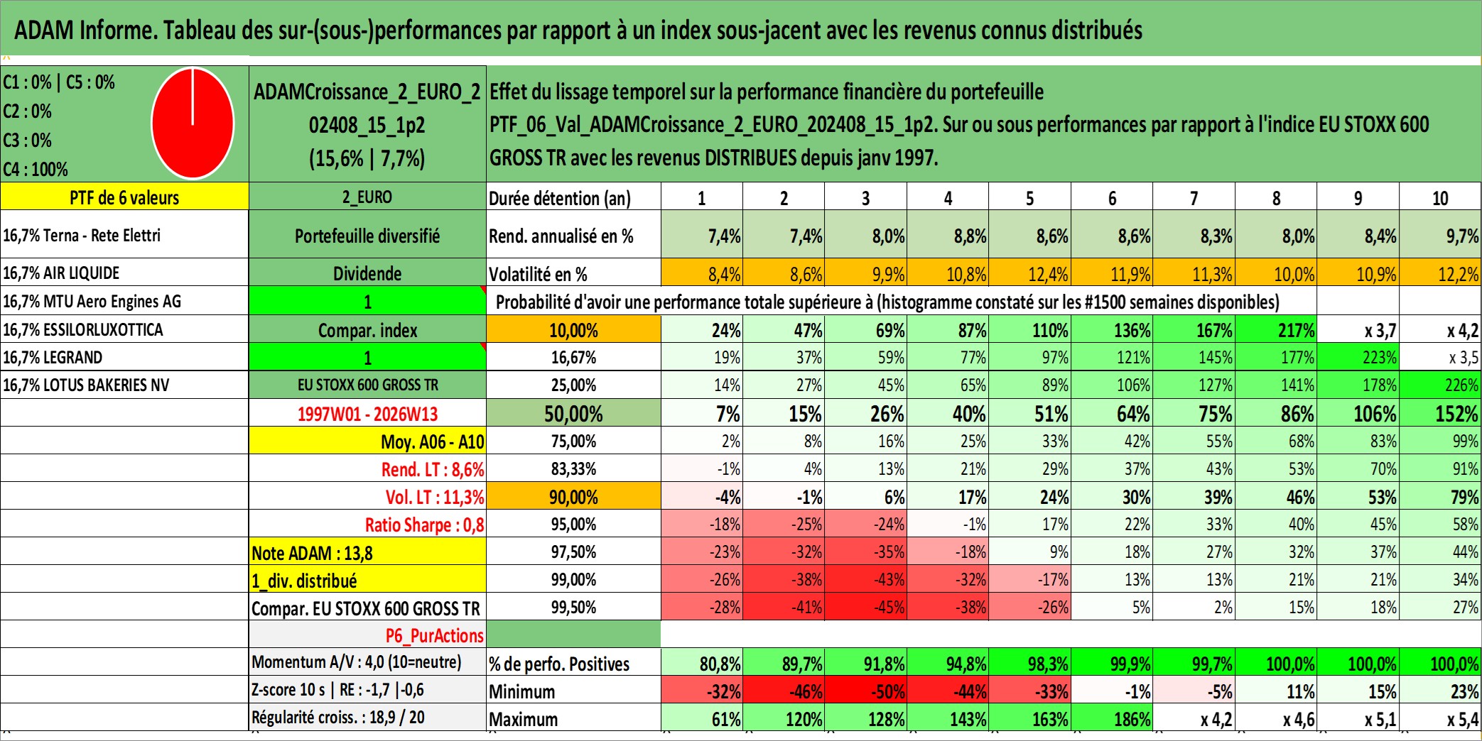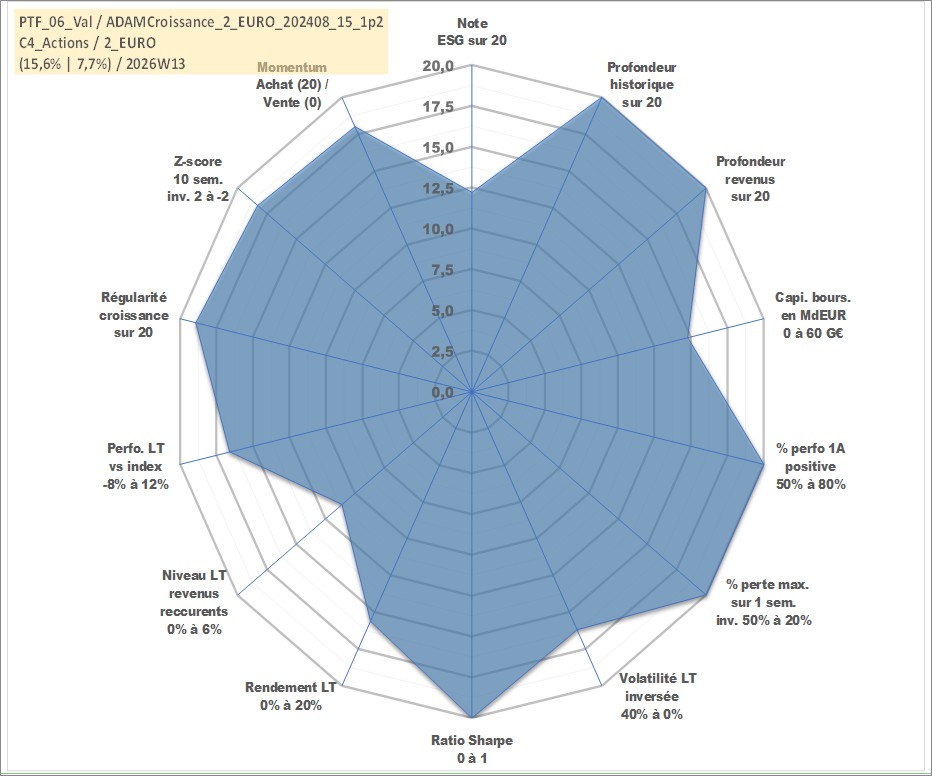 Site dédié aux investisseursPage dédiée sur site financeAnalyse des valorisations hebdomadaires du portefeuille ADAMCroissance_2_EURO_202408_15_1p2_6actifs avec un profil P6_PurActions. Ce portefeuille est cote en EUR. Les valorisations couvrent les semaines 1997W01 a 2026W13. Les revenus de cet actif financier sont pris en compte depuis la semaine 1997W01. La note globale ESG de cet actif est estimee a 12.2 (apres rebasage entre 0 et 20).
