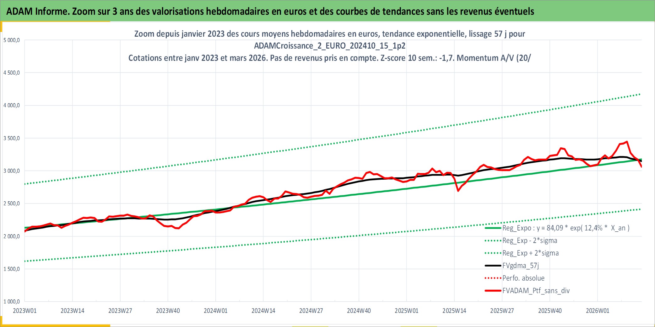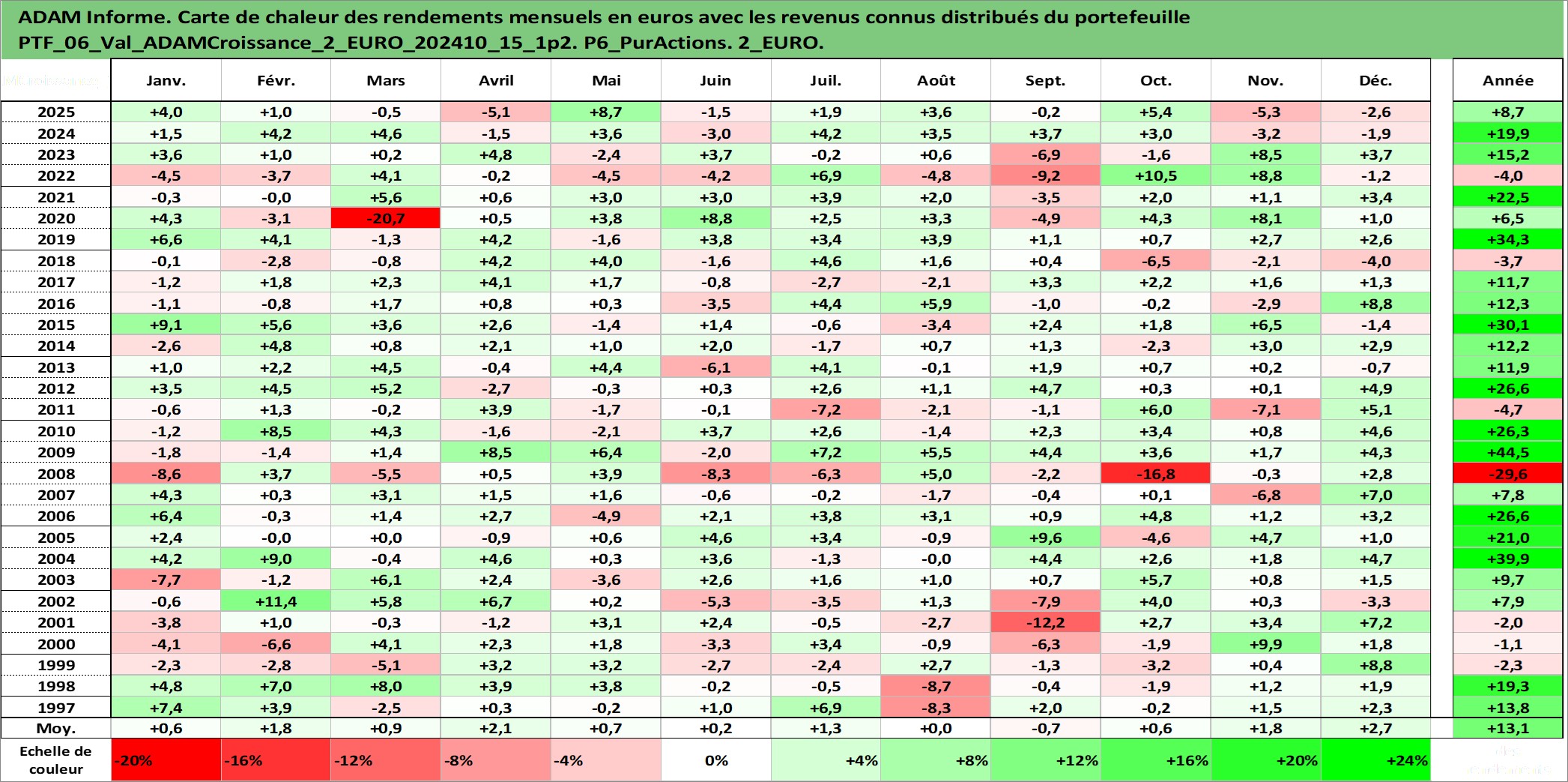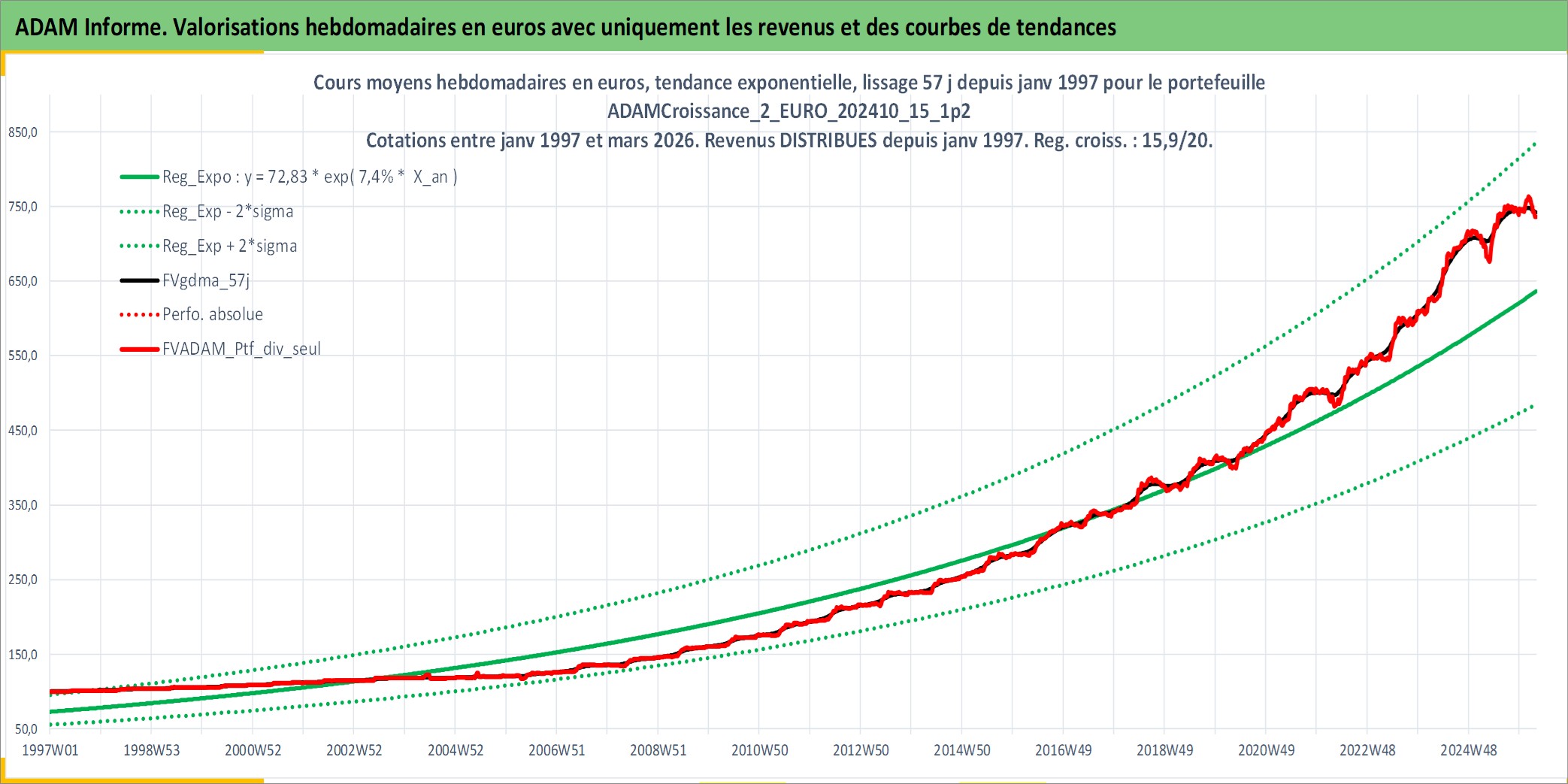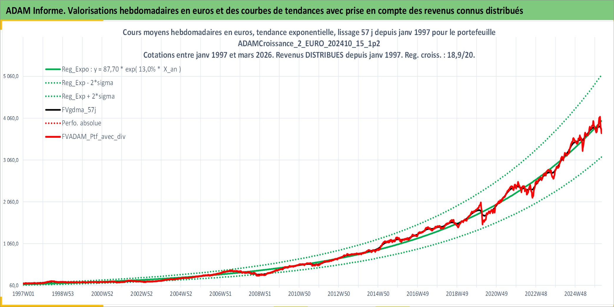 Site dédié aux investisseursPage dédiée sur site financeAnalyse des valorisations hebdomadaires du portefeuille ADAMCroissance_2_EURO_202410_15_1p2_6actifs avec un profil P6_PurActions. Ce portefeuille est cote en EUR. Les valorisations couvrent les semaines 1997W01 a 2026W13. Les revenus de cet actif financier sont pris en compte depuis la semaine 1997W01. La note globale ESG de cet actif est estimee a 12.2 (apres rebasage entre 0 et 20).