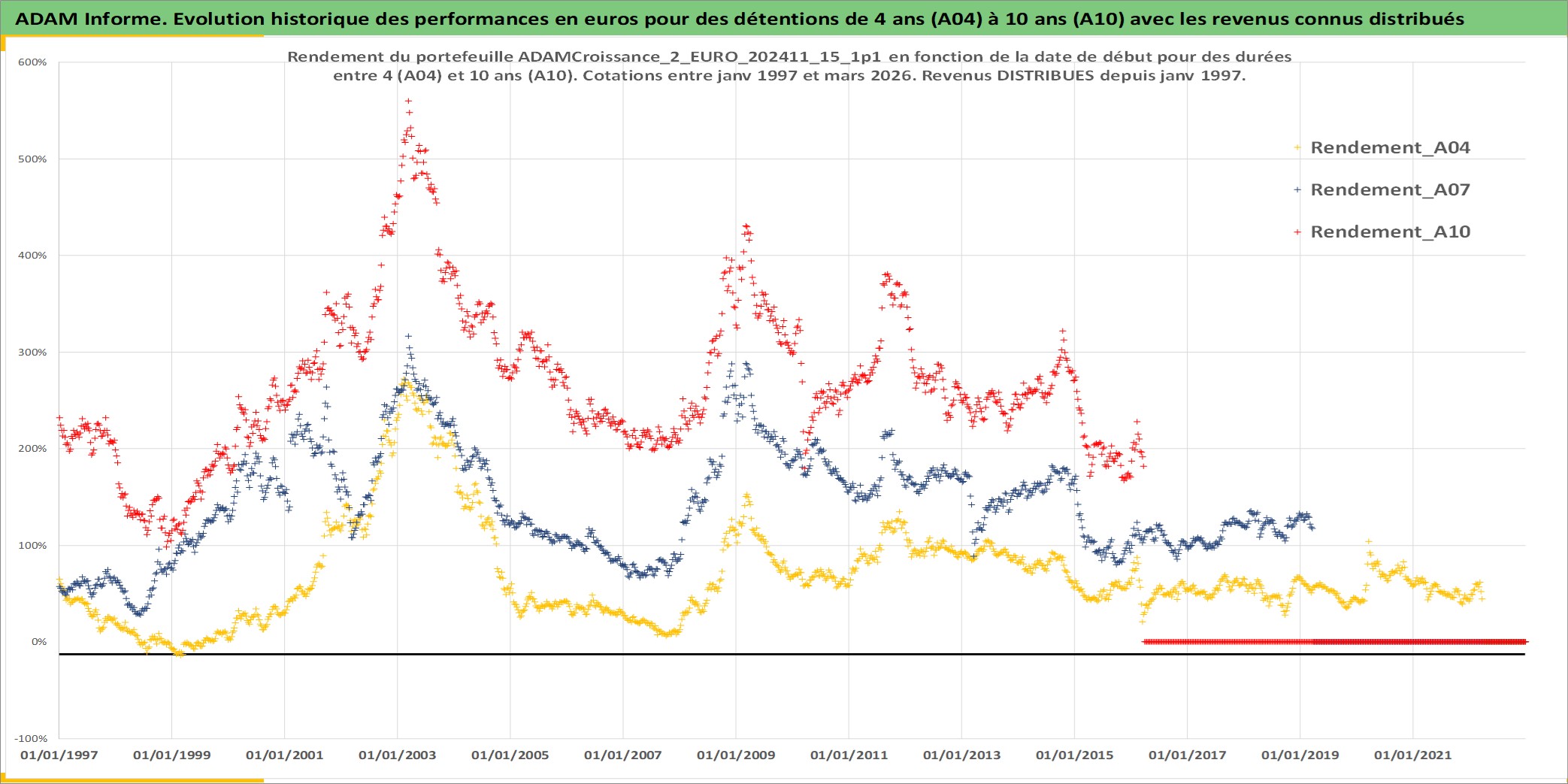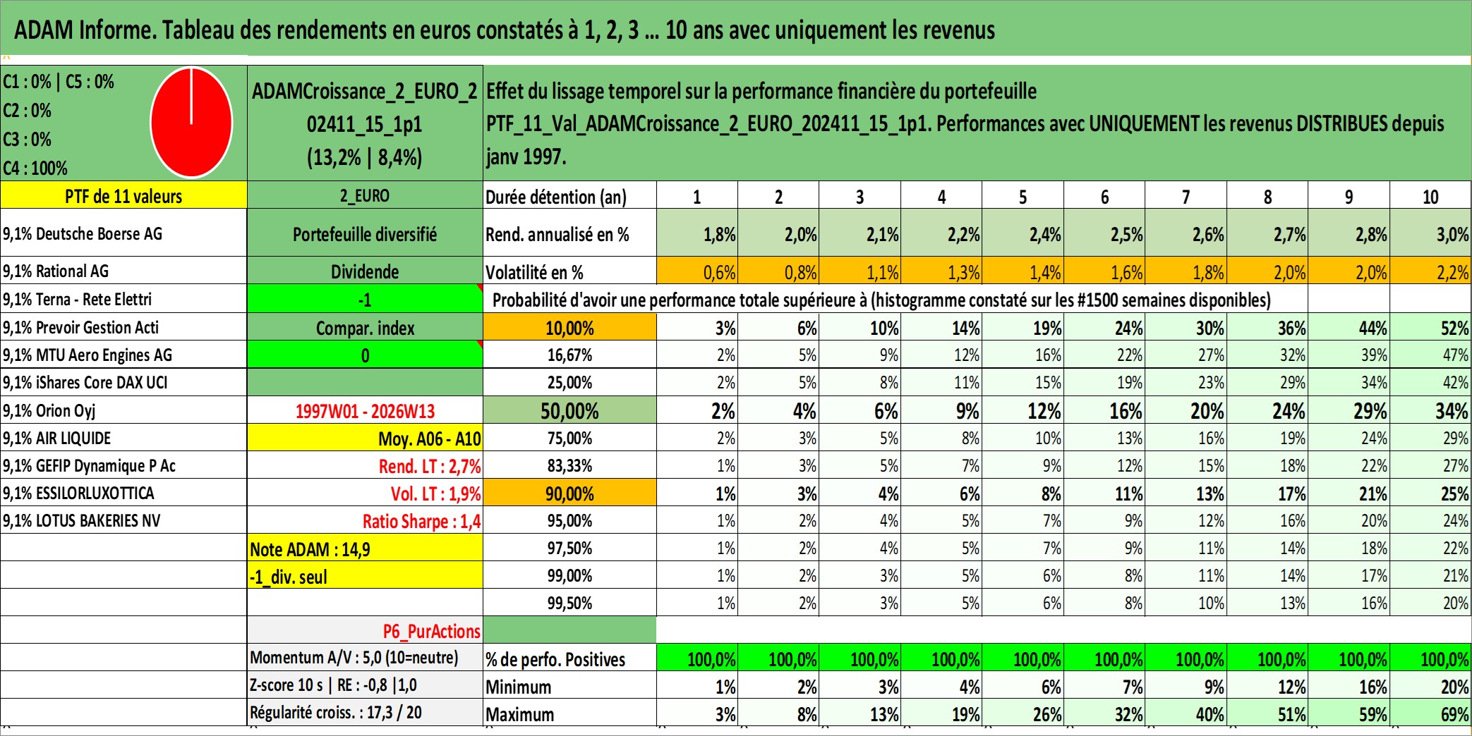 Site dédié aux investisseursPage dédiée sur site financeAnalyse des valorisations hebdomadaires du portefeuille ADAMCroissance_2_EURO_202411_15_1p1_11actifs avec un profil P6_PurActions. Ce portefeuille est cote en EUR. Les valorisations couvrent les semaines 1997W01 a 2026W13. Les revenus de cet actif financier sont pris en compte depuis la semaine 1997W01. La note globale ESG de cet actif est estimee a 10.9 (apres rebasage entre 0 et 20).