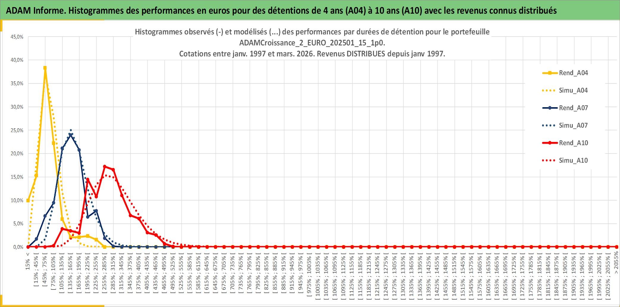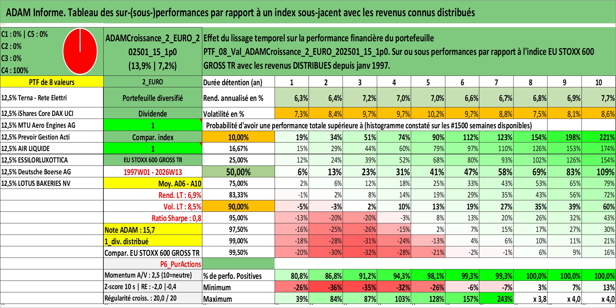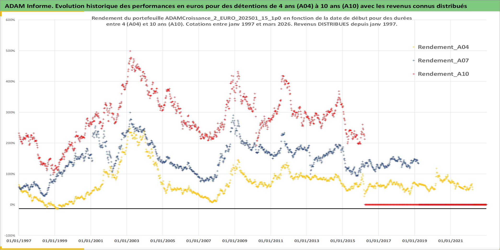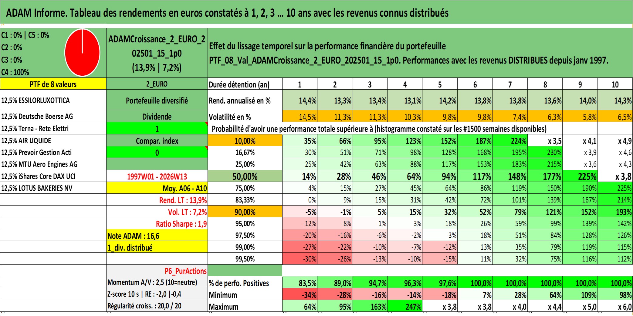 Site dédié aux investisseursPage dédiée sur site financeAnalyse des valorisations hebdomadaires du portefeuille ADAMCroissance_2_EURO_202501_15_1p0_8actifs avec un profil P6_PurActions. Ce portefeuille est cote en EUR. Les valorisations couvrent les semaines 1997W01 a 2026W13. Les revenus de cet actif financier sont pris en compte depuis la semaine 1997W01. La note globale ESG de cet actif est estimee a 12.2 (apres rebasage entre 0 et 20).