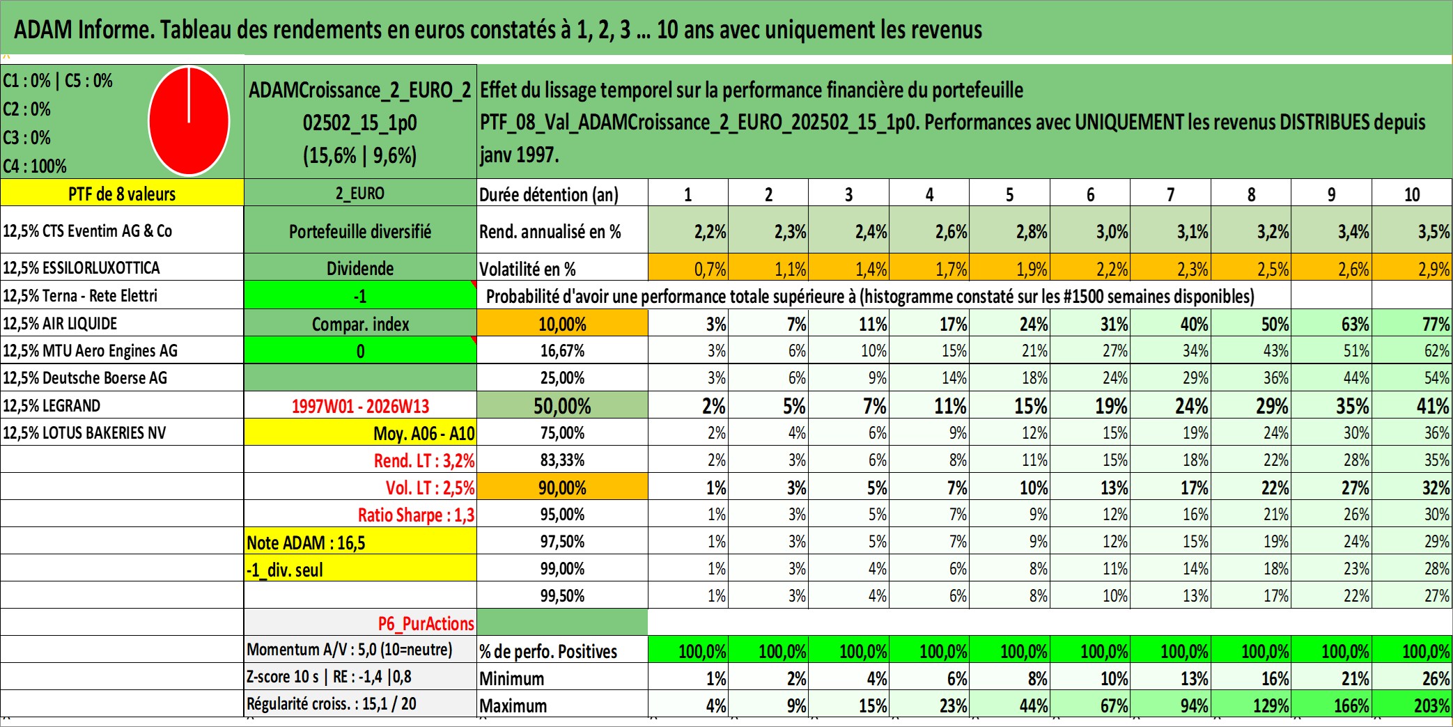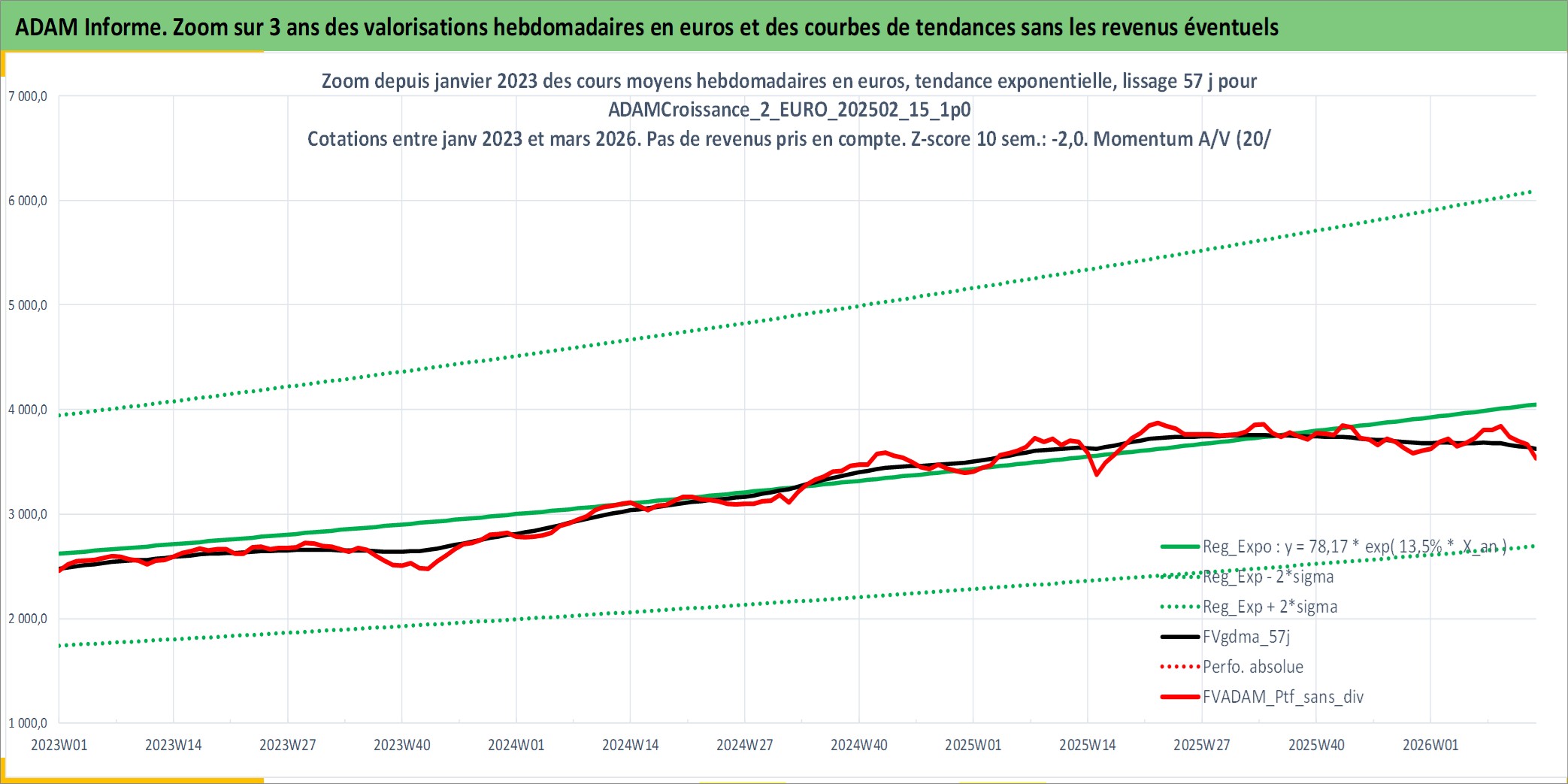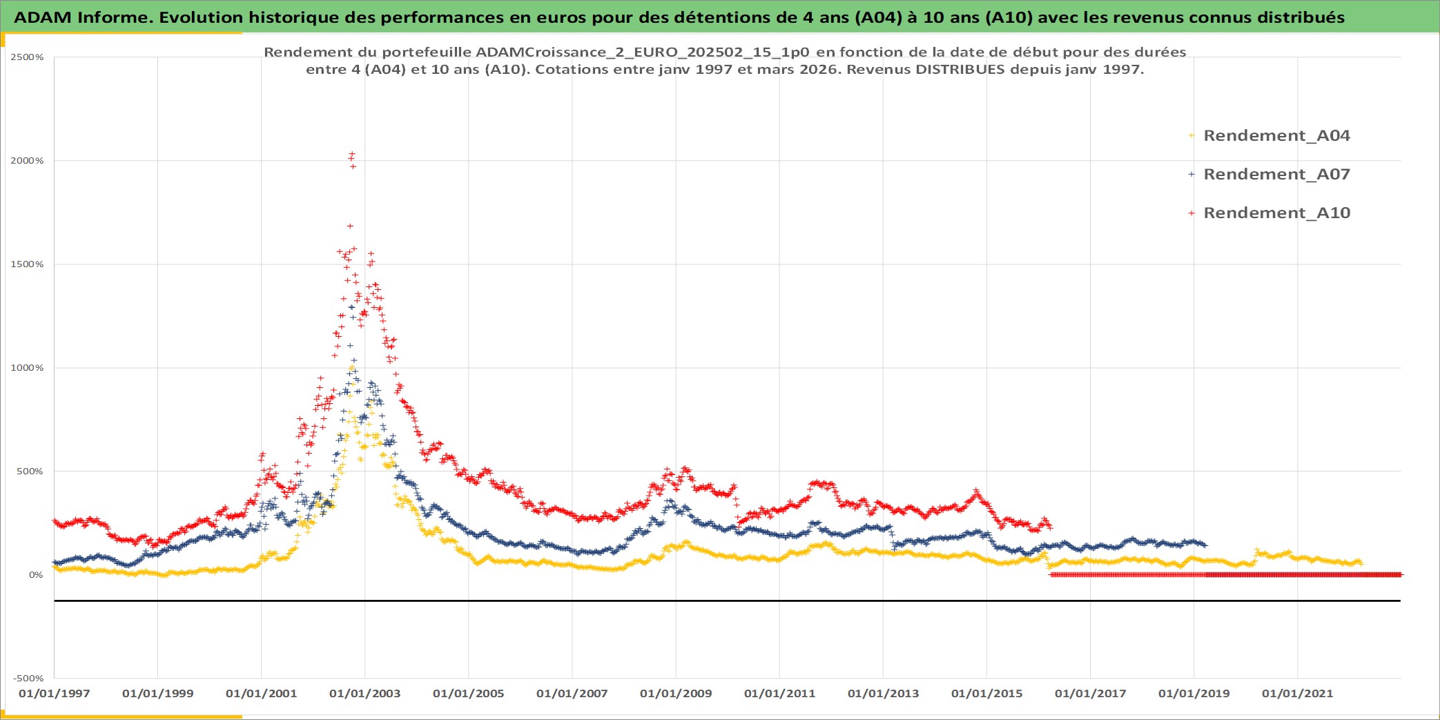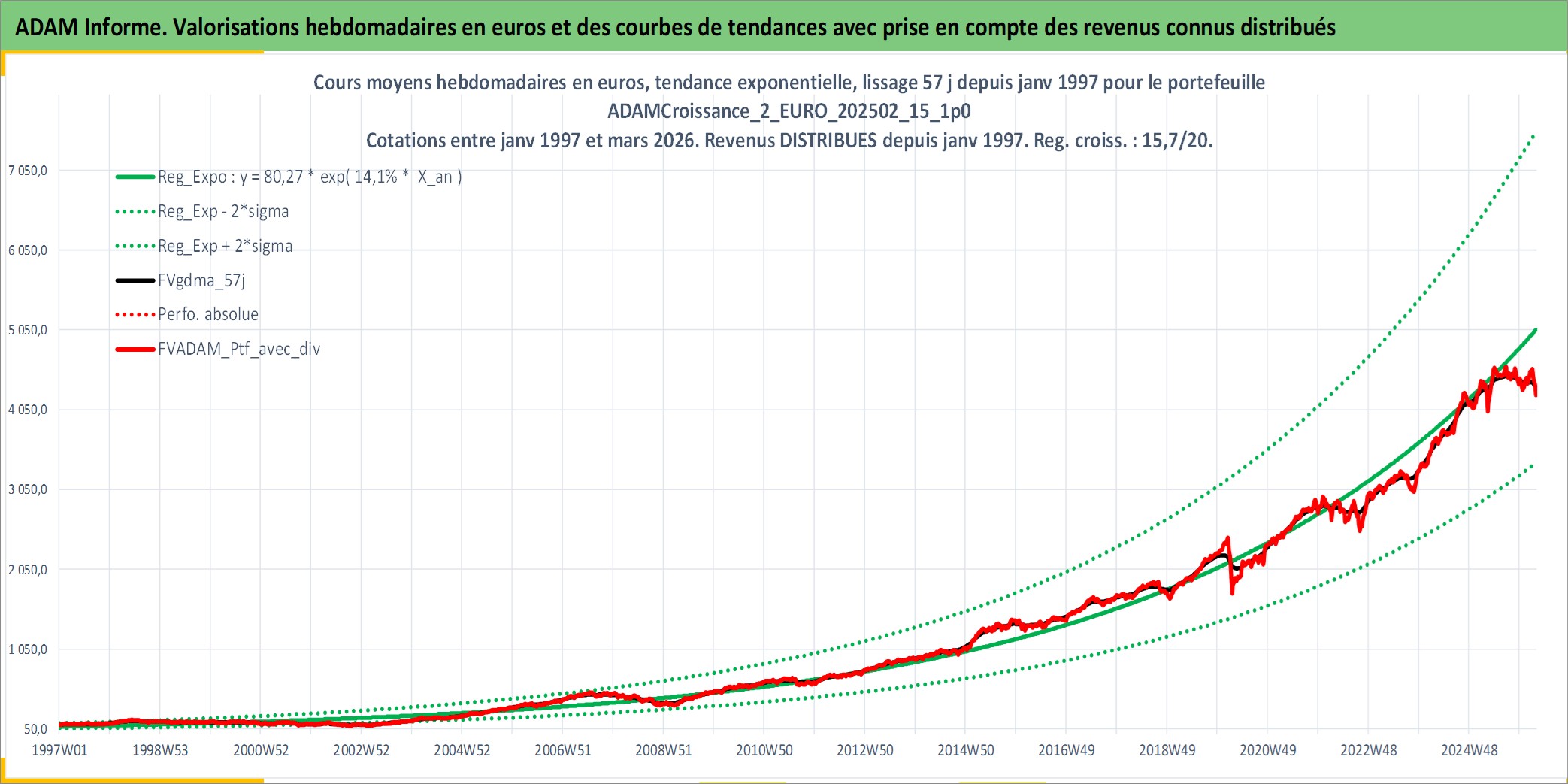 Site dédié aux investisseursPage dédiée sur site financeAnalyse des valorisations hebdomadaires du portefeuille ADAMCroissance_2_EURO_202502_15_1p0_8actifs avec un profil P6_PurActions. Ce portefeuille est cote en EUR. Les valorisations couvrent les semaines 1997W01 a 2026W13. Les revenus de cet actif financier sont pris en compte depuis la semaine 1997W01. La note globale ESG de cet actif est estimee a 12.7 (apres rebasage entre 0 et 20).