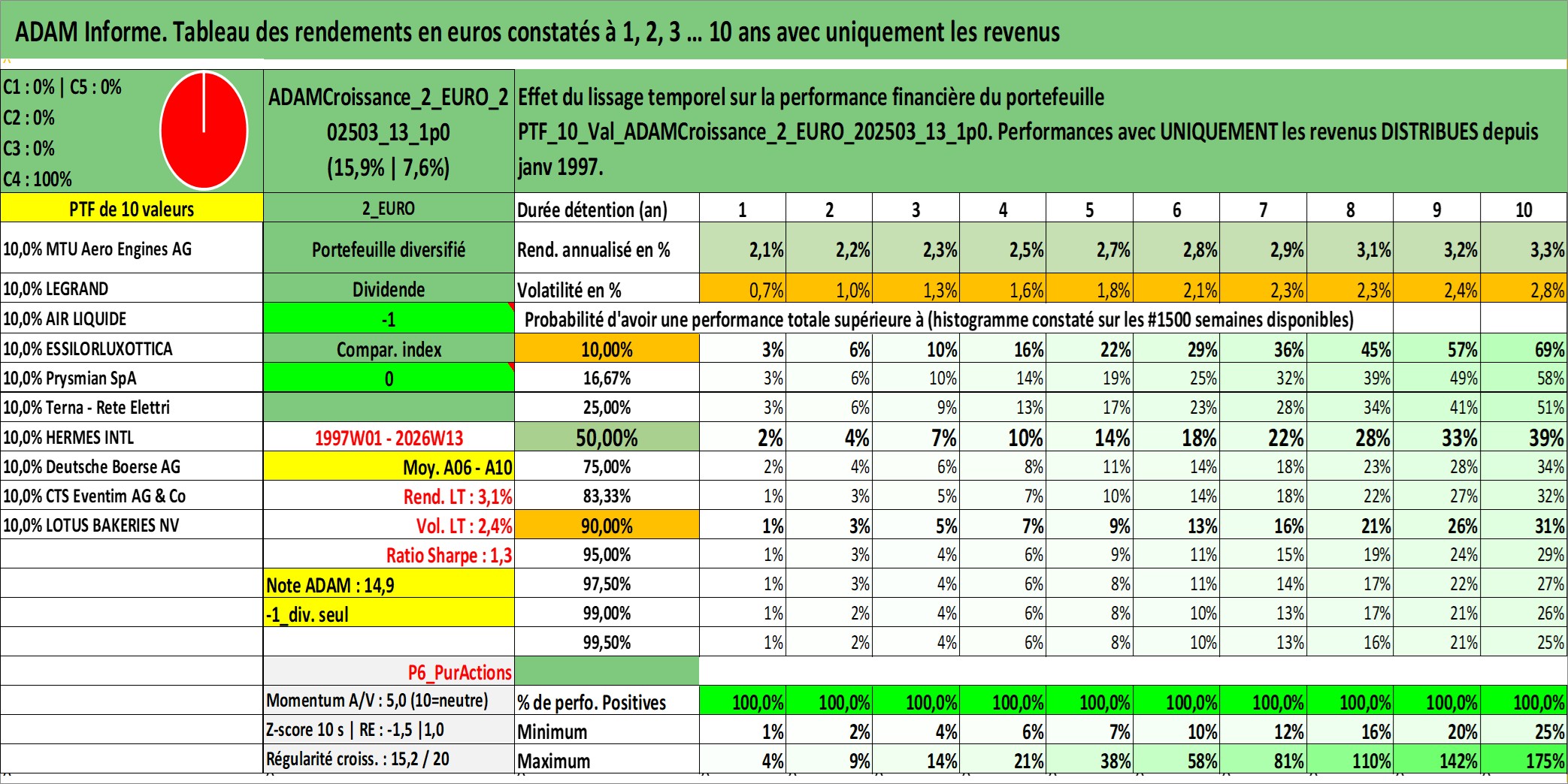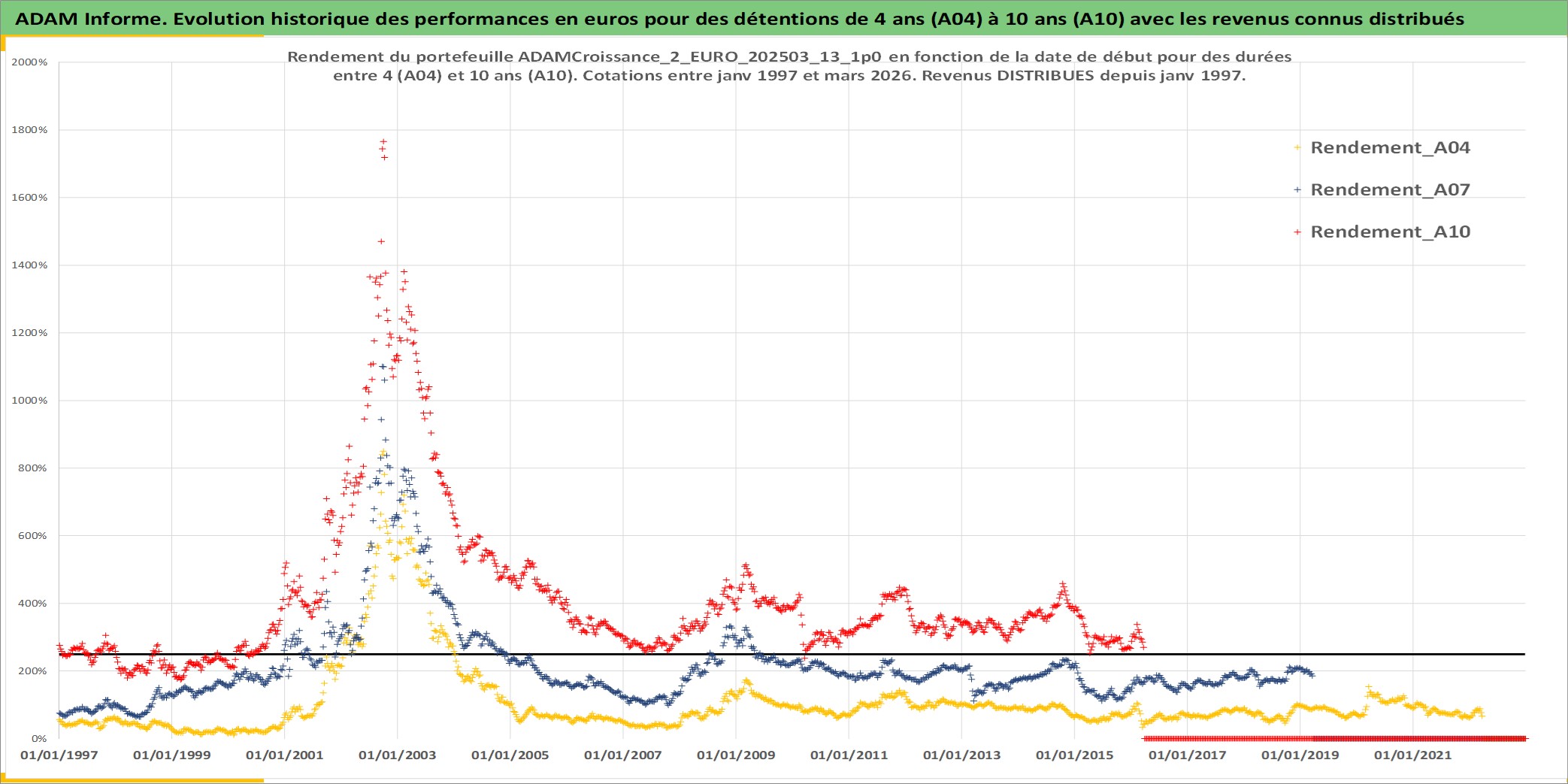 Site dédié aux investisseursPage dédiée sur site financeAnalyse des valorisations hebdomadaires du portefeuille ADAMCroissance_2_EURO_202503_13_1p0_10actifs avec un profil P6_PurActions. Ce portefeuille est cote en EUR. Les valorisations couvrent les semaines 1997W01 a 2026W13. Les revenus de cet actif financier sont pris en compte depuis la semaine 1997W01. La note globale ESG de cet actif est estimee a 12.9 (apres rebasage entre 0 et 20).