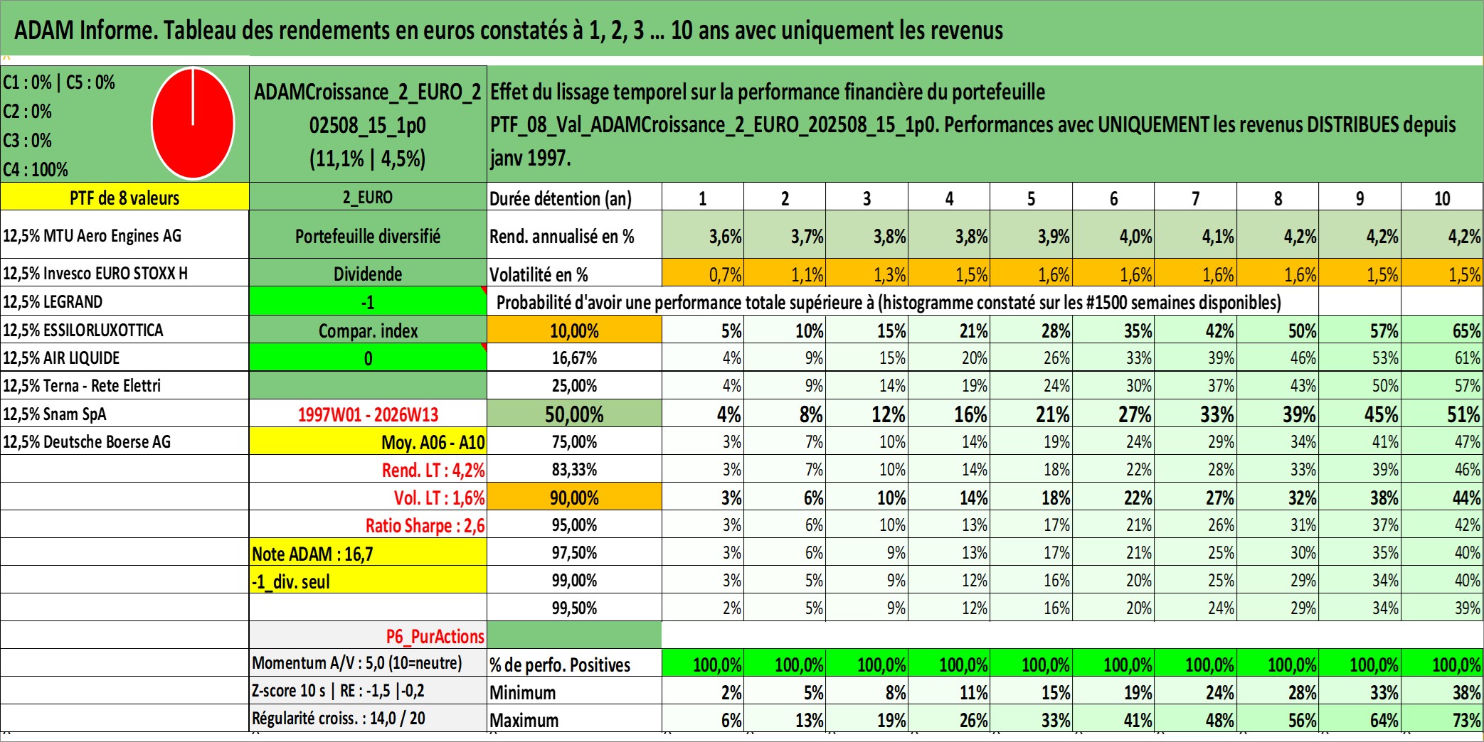 Site dédié aux investisseursPage dédiée sur site financeAnalyse des valorisations hebdomadaires du portefeuille ADAMCroissance_2_EURO_202508_15_1p0_8actifs avec un profil P6_PurActions. Ce portefeuille est cote en EUR. Les valorisations couvrent les semaines 1997W01 a 2026W13. Les revenus de cet actif financier sont pris en compte depuis la semaine 1997W01. La note globale ESG de cet actif est estimee a 12.7 (apres rebasage entre 0 et 20).